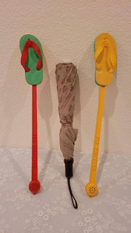 Lot 279: (2) New Sound Fly Swatters (1 needs battery) + Umbrella