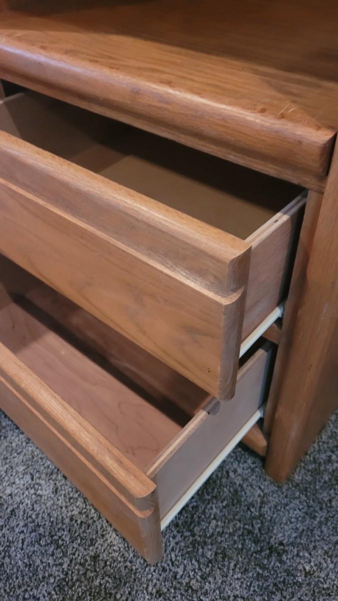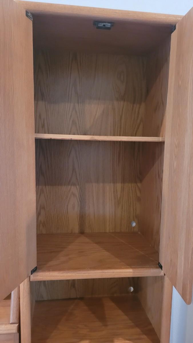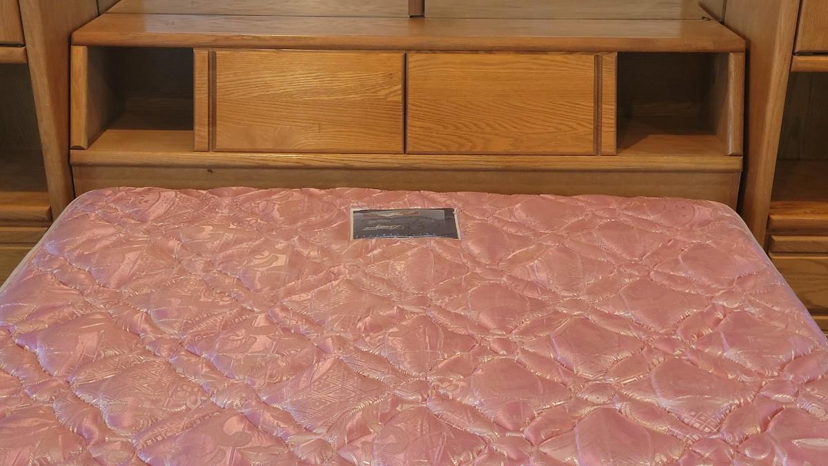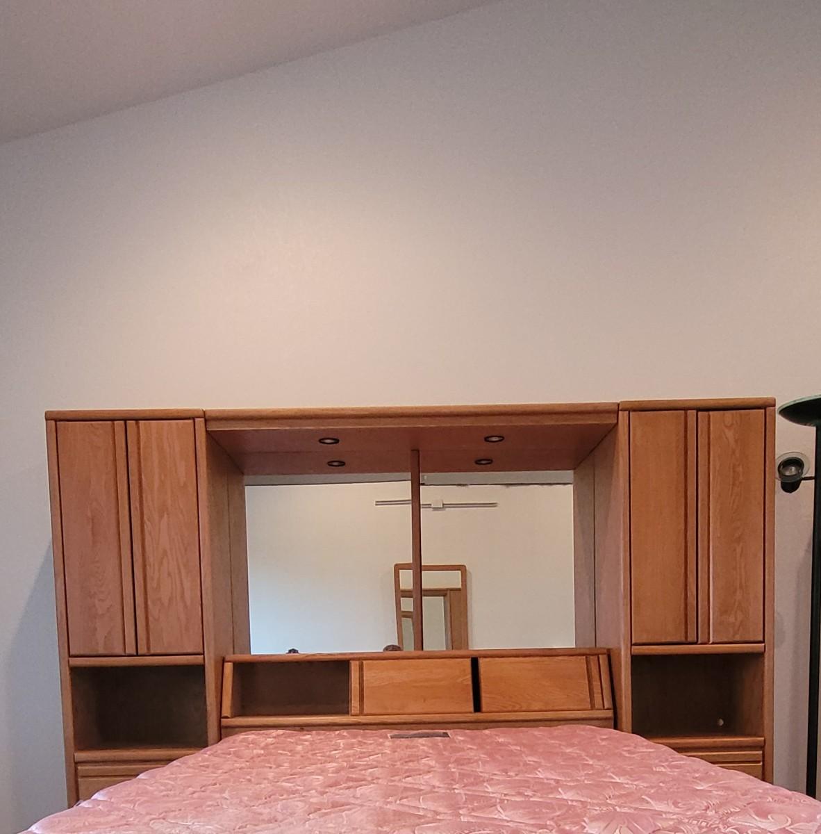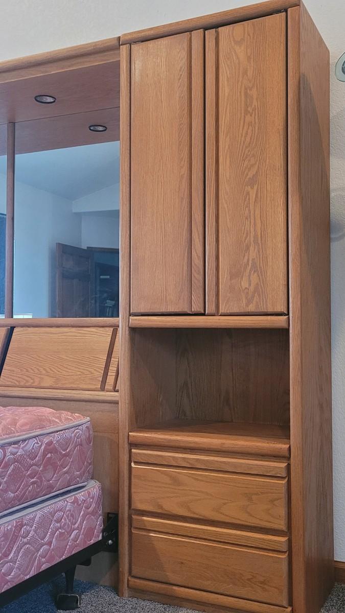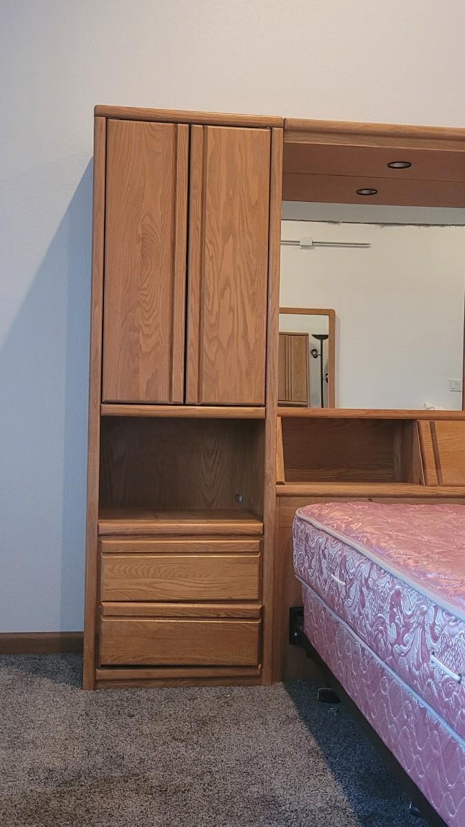This unit features 2 drawers and double door shelving on both sides. The headboard as sliding door storage. Nice condition! The mattresses are not in great condition and is not being sold with the bed.