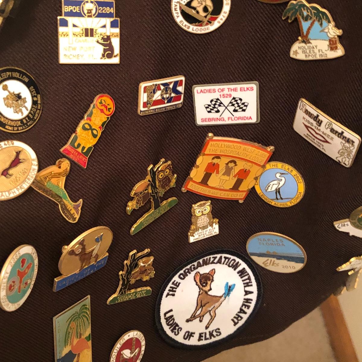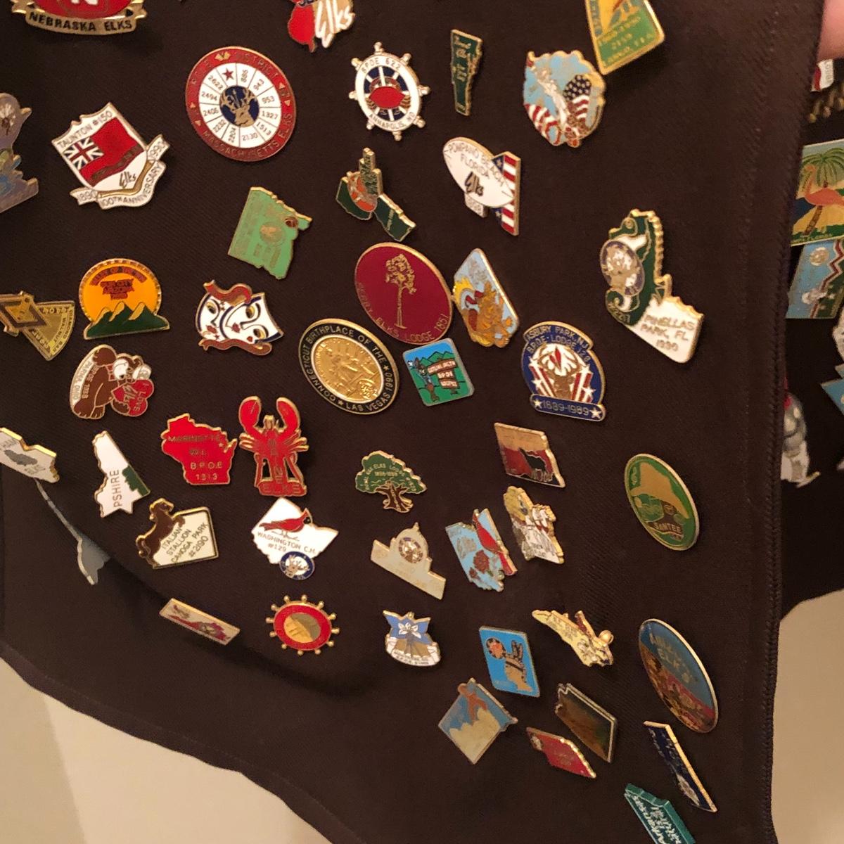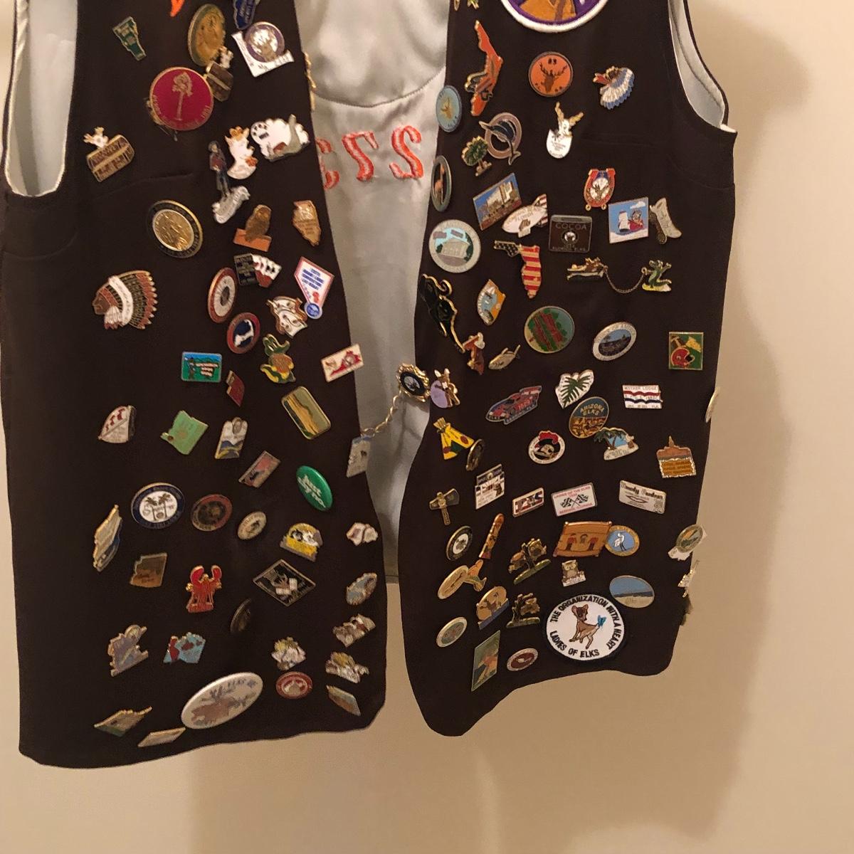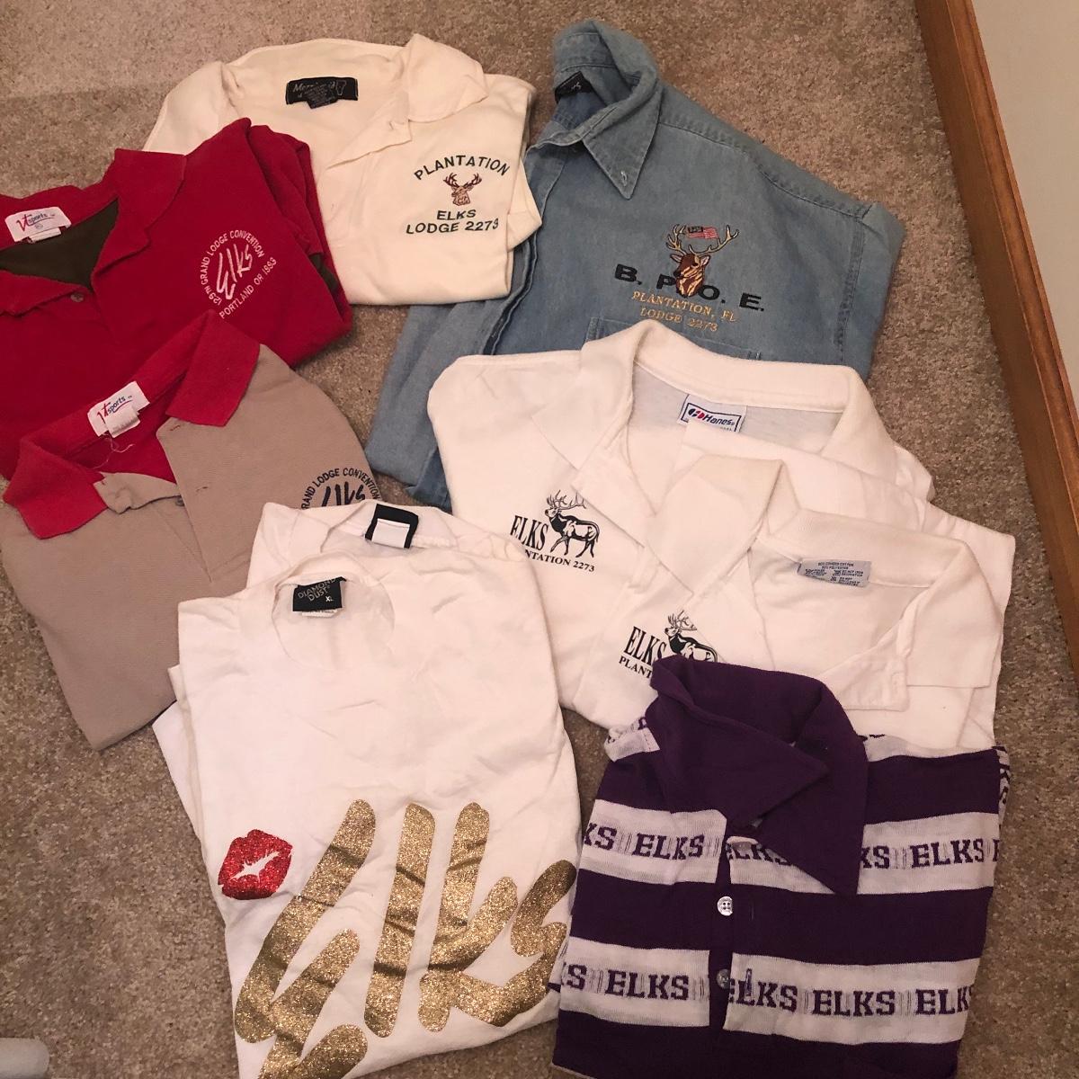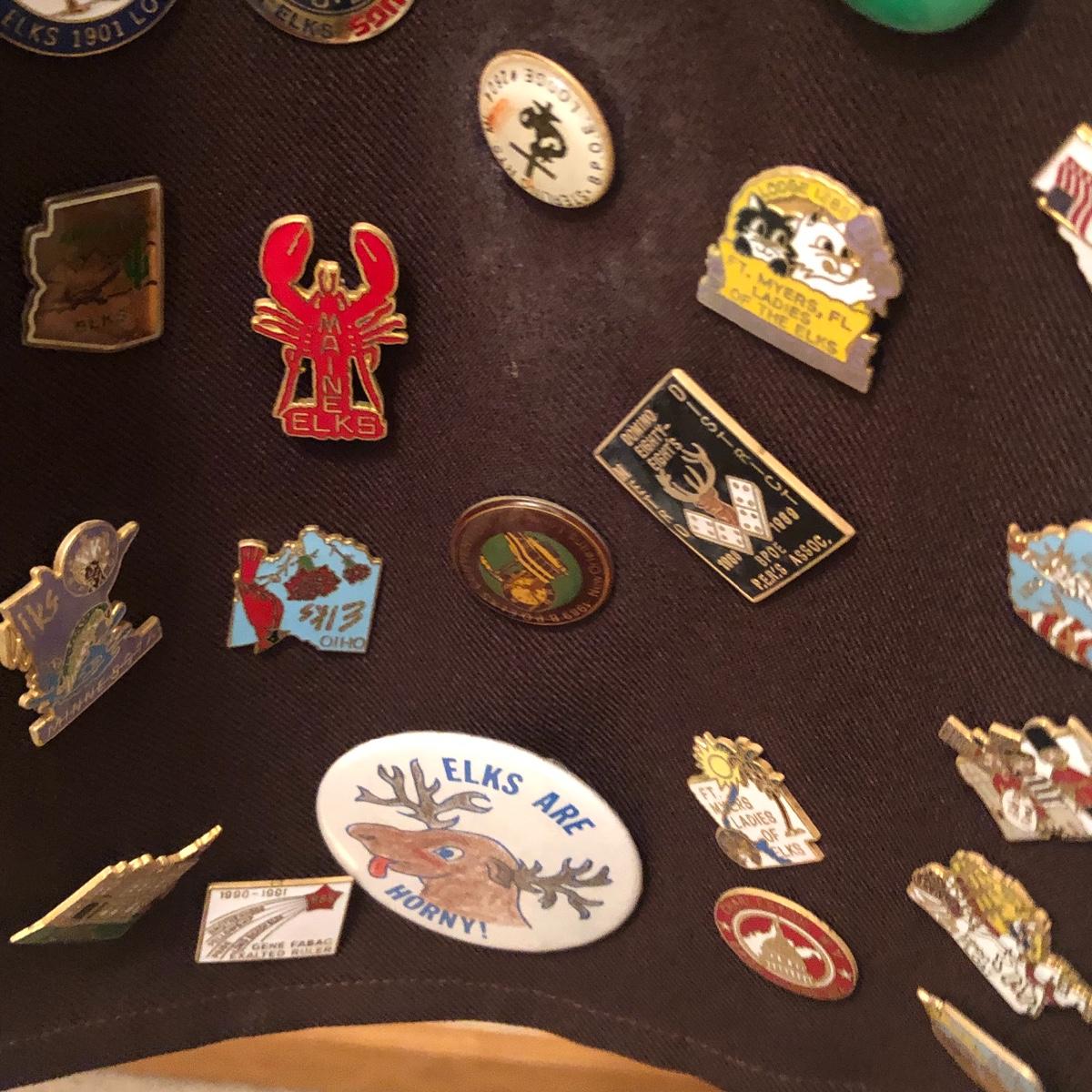 If you are involved with the Elks, this lot is for you! There is a wooden wall clock (needs new battery so was not tested), a large round patch, eight shirts (XL mostly), three glasses, loads of pins, belt buckles, a watch and two vests COVERED in pins! Shipping Available.