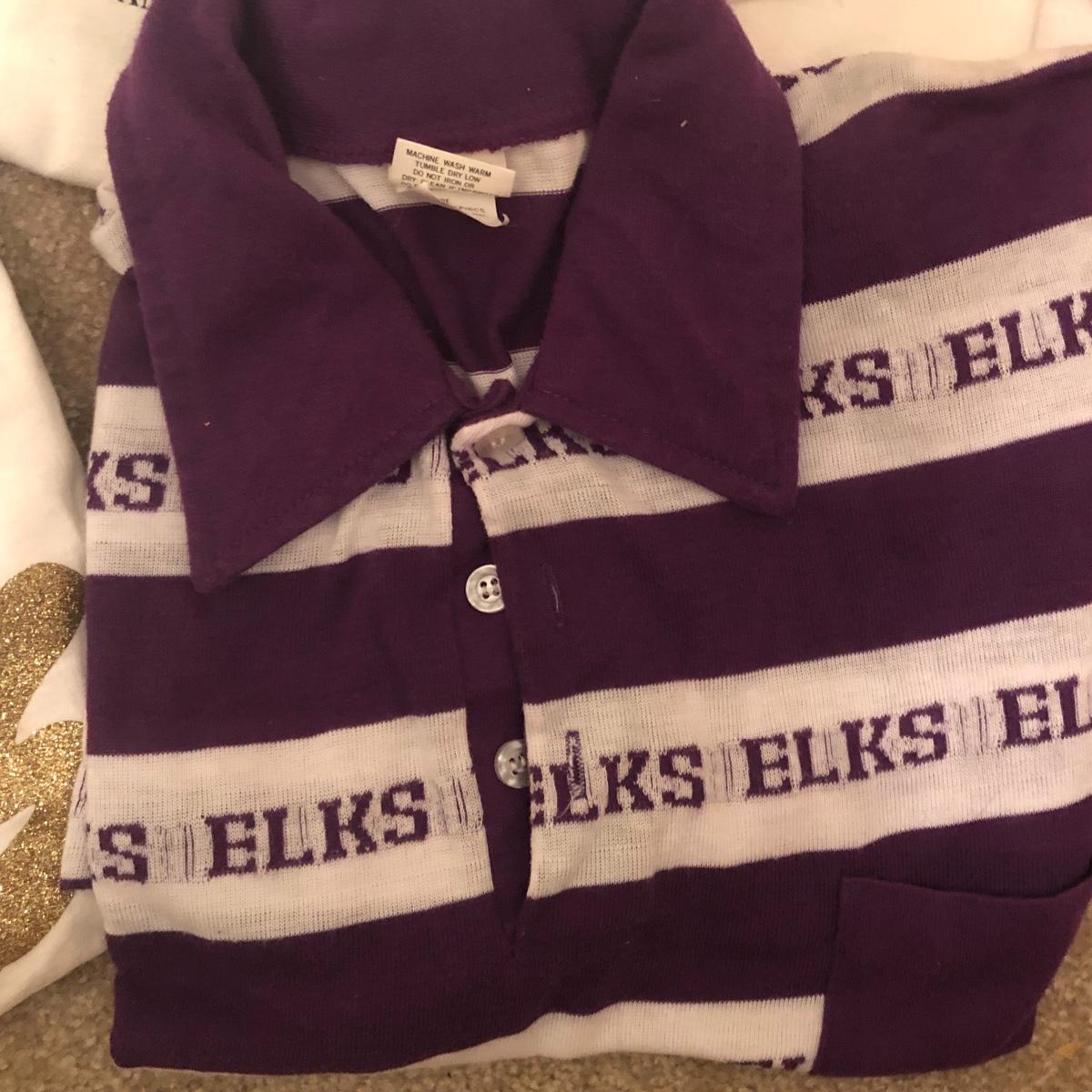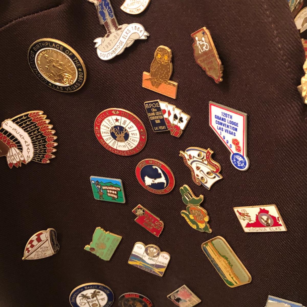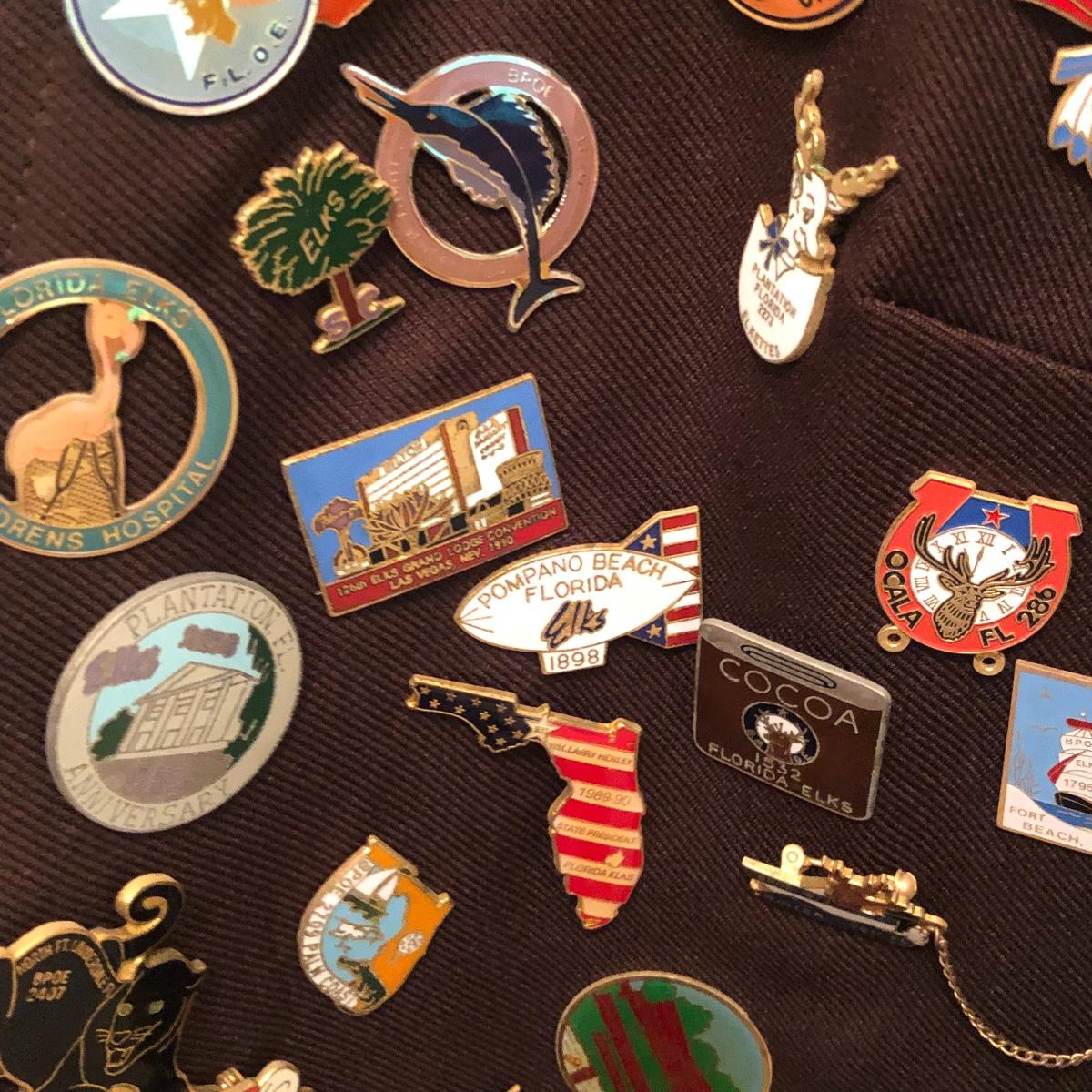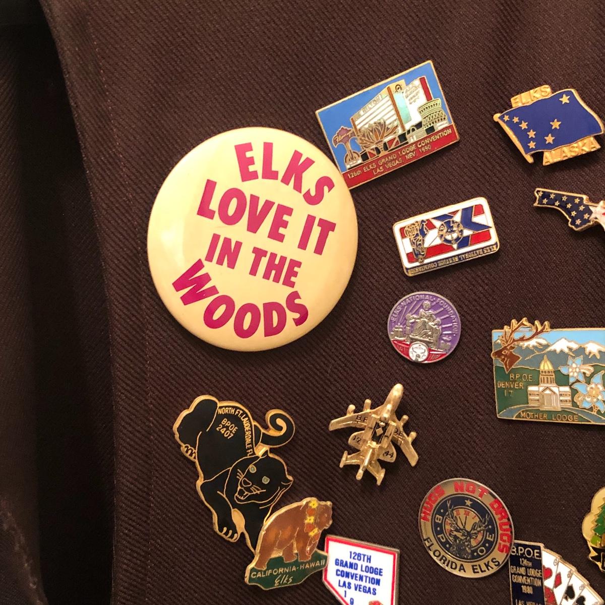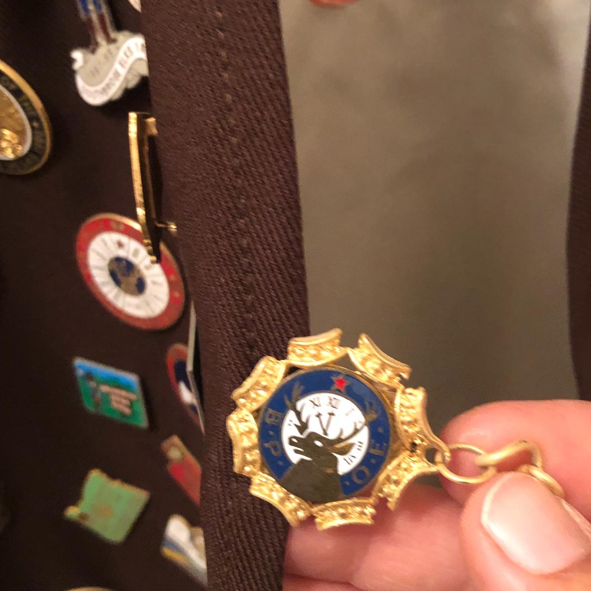 If you are involved with the Elks, this lot is for you! There is a wooden wall clock (needs new battery so was not tested), a large round patch, eight shirts (XL mostly), three glasses, loads of pins, belt buckles, a watch and two vests COVERED in pins! Shipping Available.