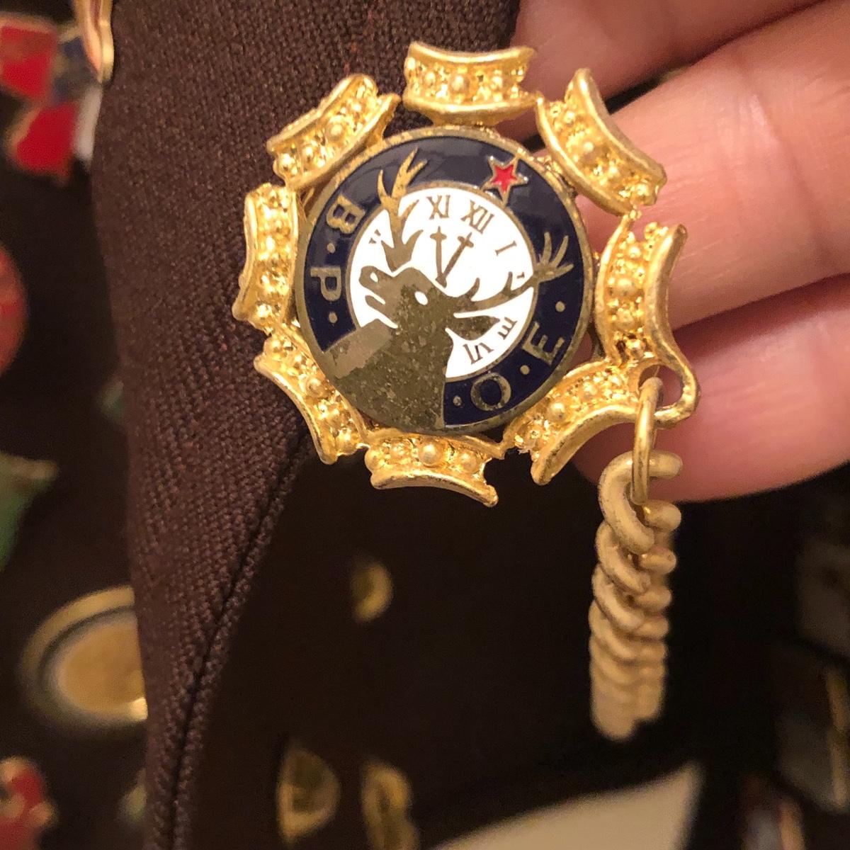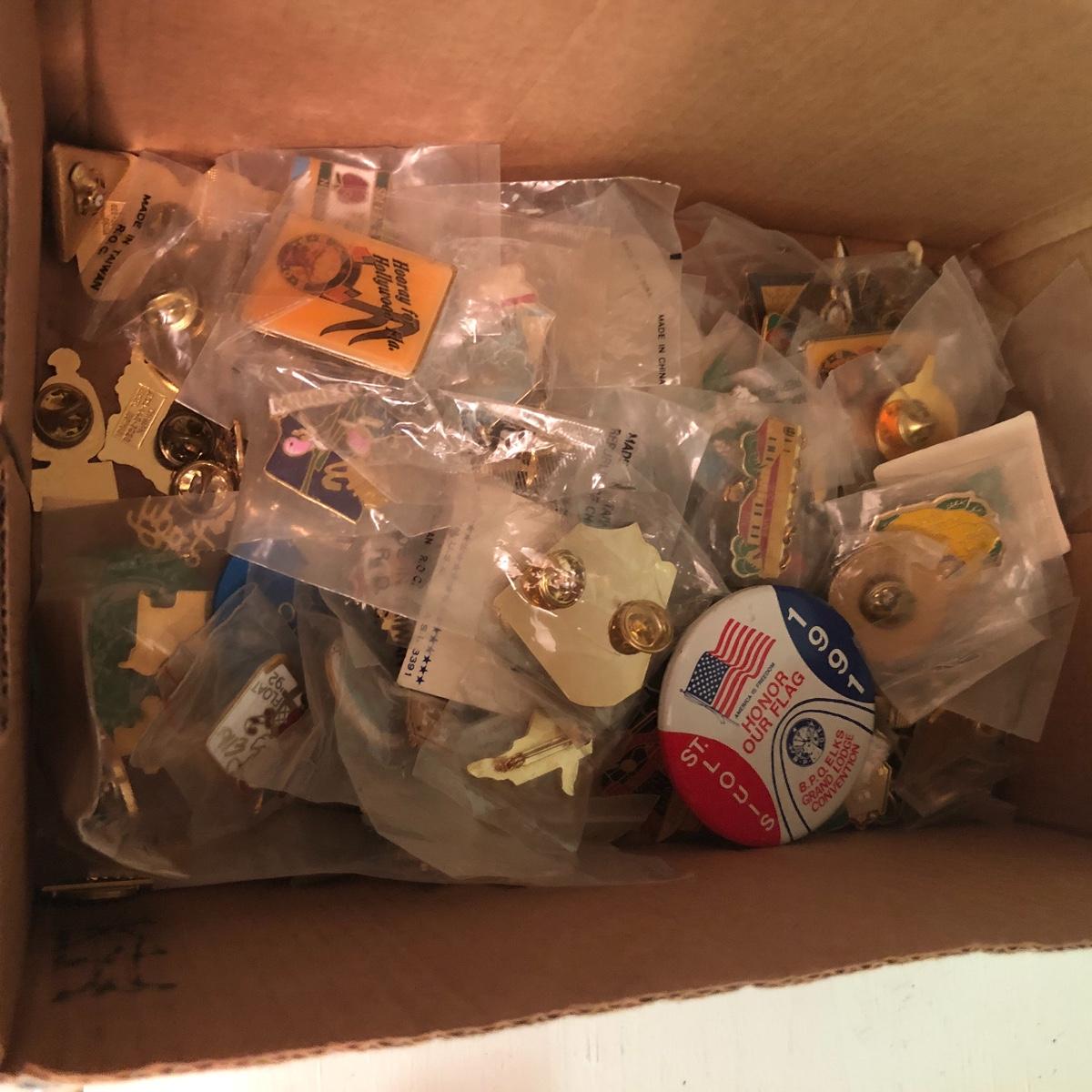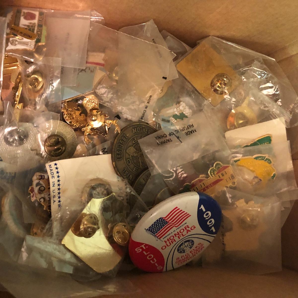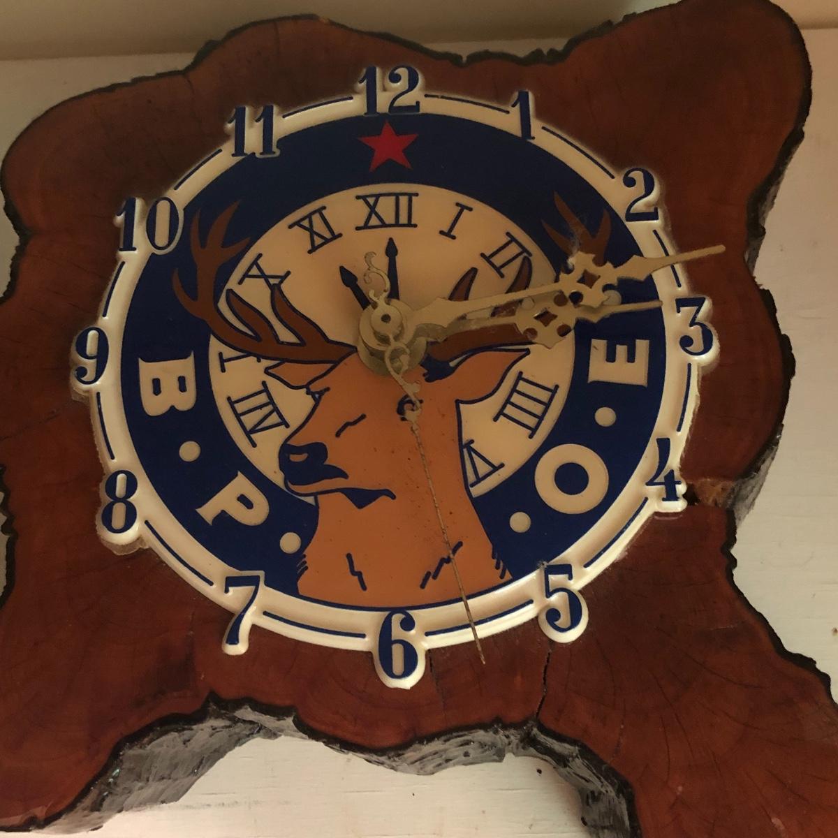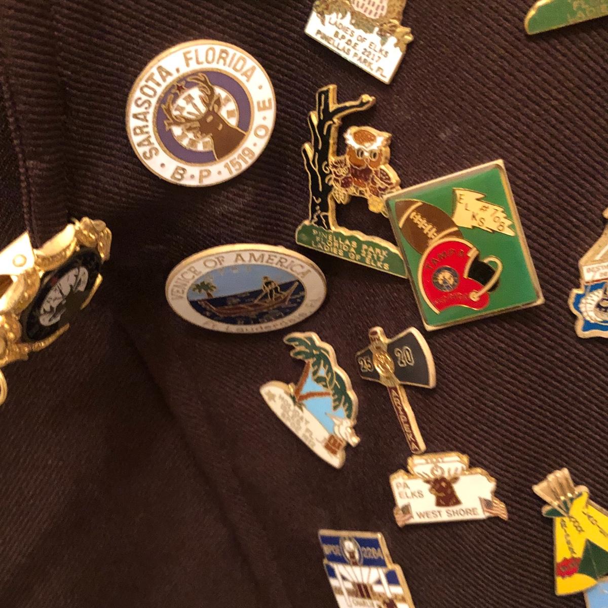 If you are involved with the Elks, this lot is for you! There is a wooden wall clock (needs new battery so was not tested), a large round patch, eight shirts (XL mostly), three glasses, loads of pins, belt buckles, a watch and two vests COVERED in pins! Shipping Available.
