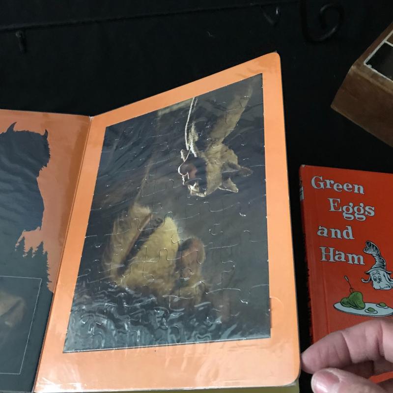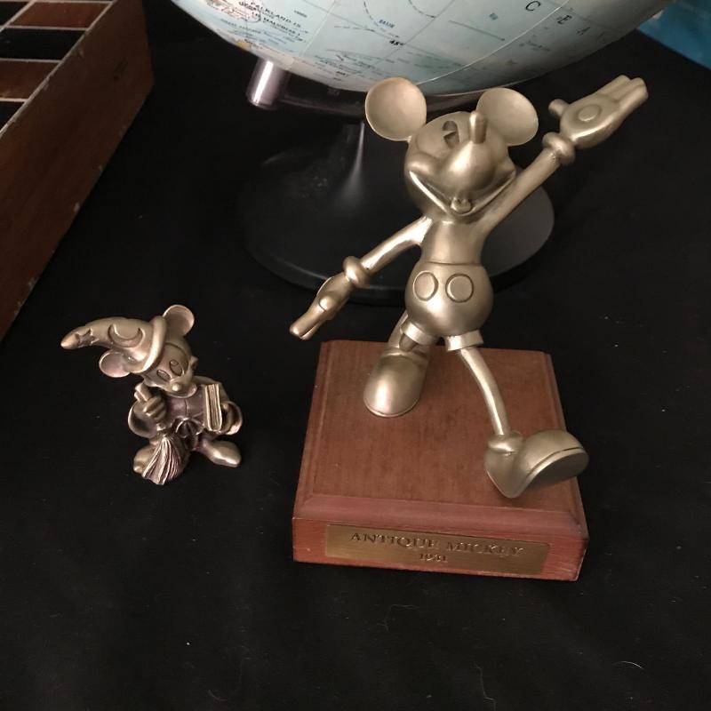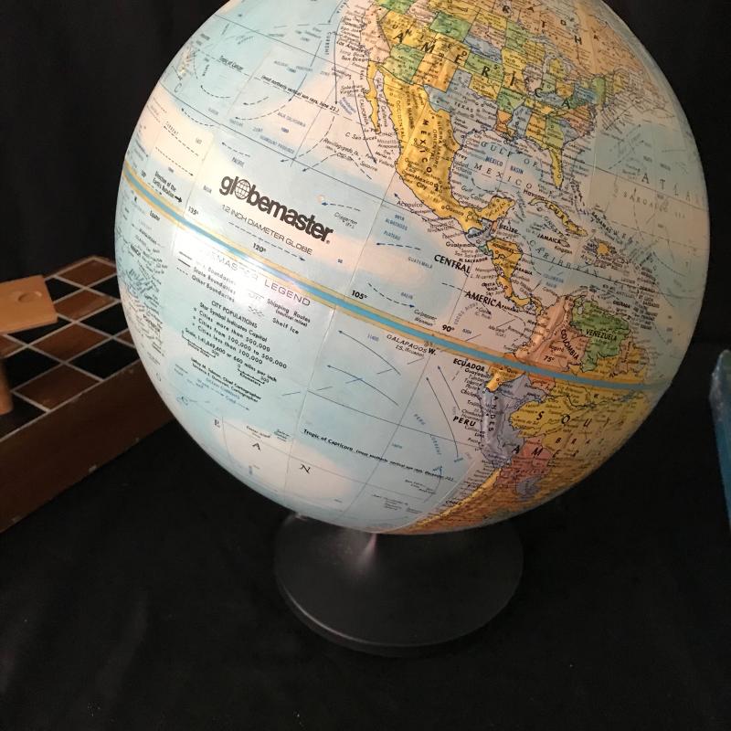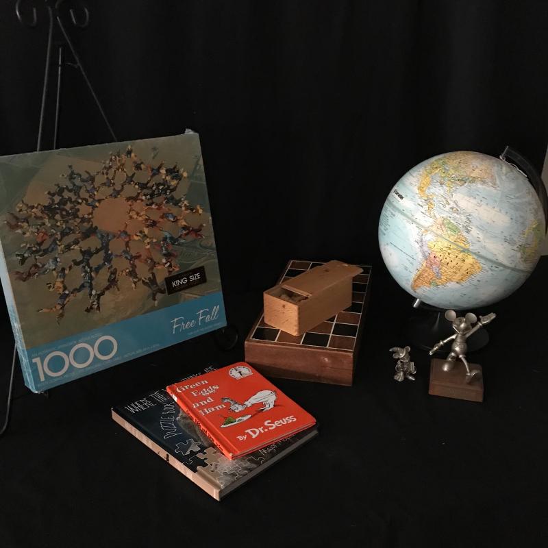 Wood chess set with one missing white pawn, two pewter Mickey Mouse figurines with the largest standing 5” tall with stand. 1000 piece jigsaw puzzle still in wrapper, legend Dr. Seuss book and puzzle book of Where the Wild Things Are. 12” globe finishes out this lot which is available for local pick up in Maggie Valley only.