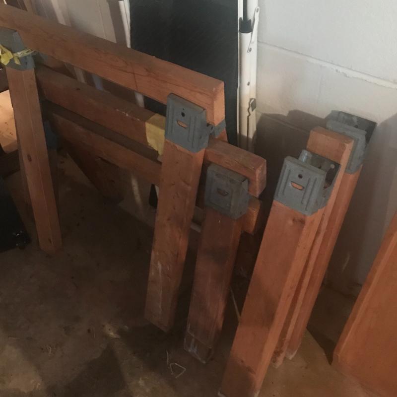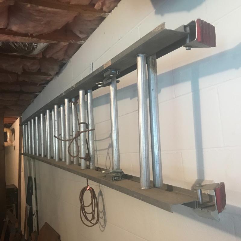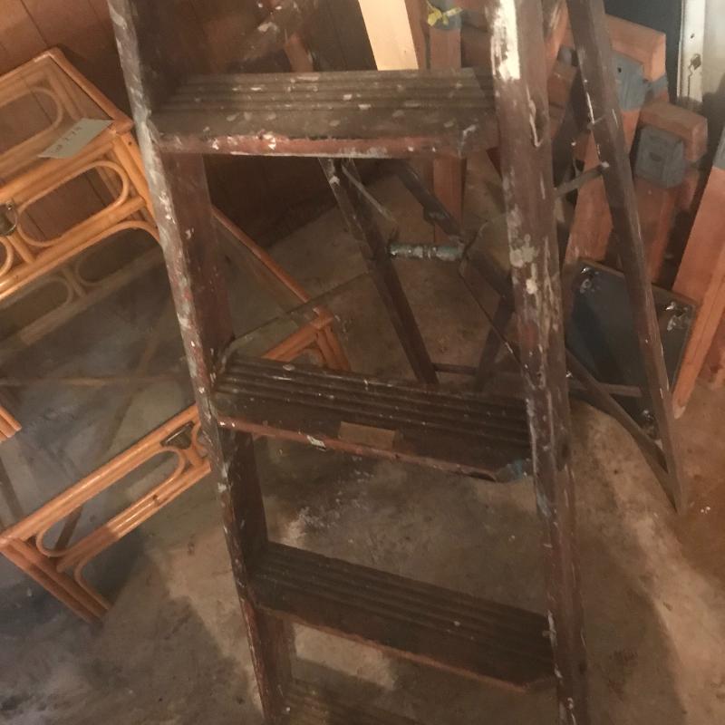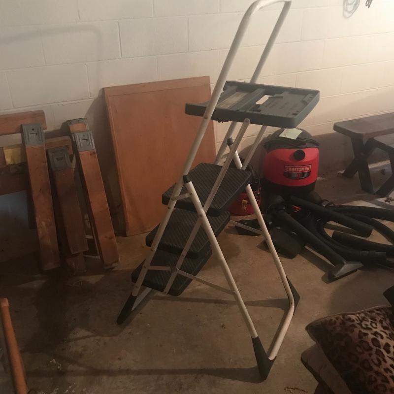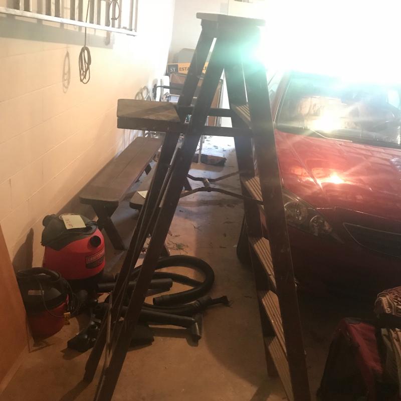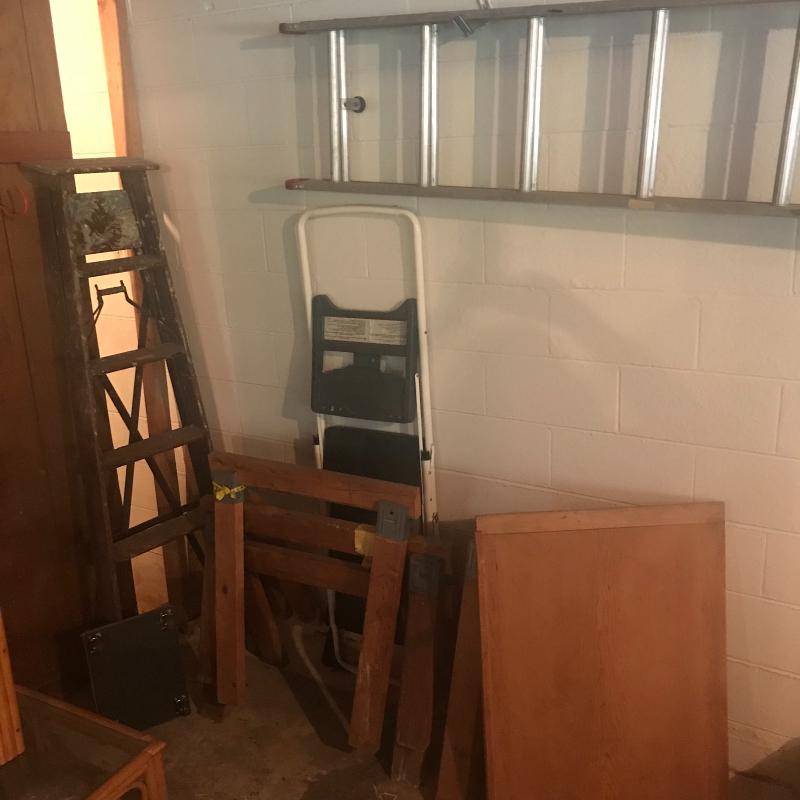 3 saw horses and two ready-to-go saw horses. Cosco step ladder, 6’ wood ladder, 20’ extender ladder. Small dolly and work surface. Local pick up only.