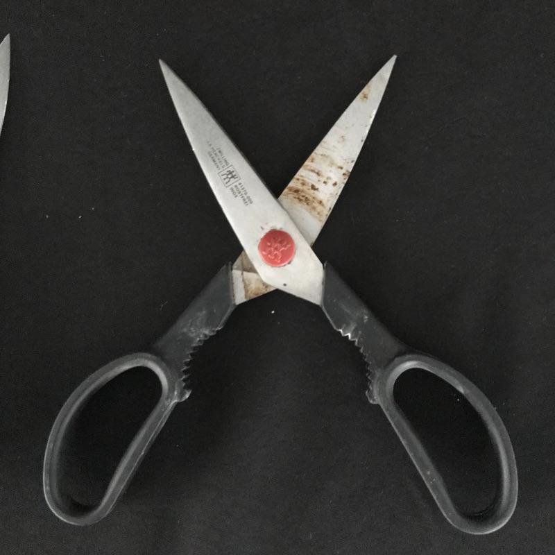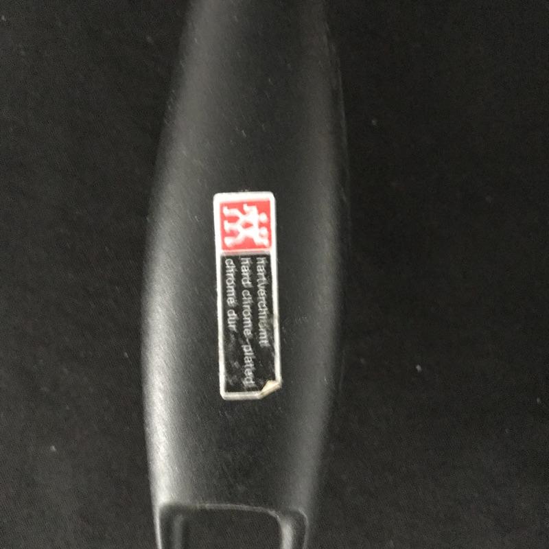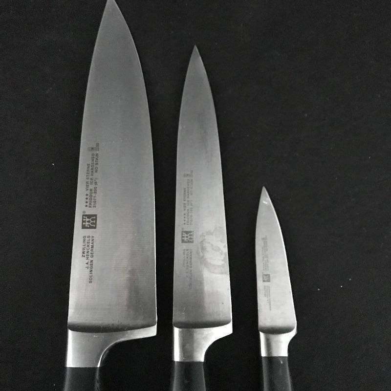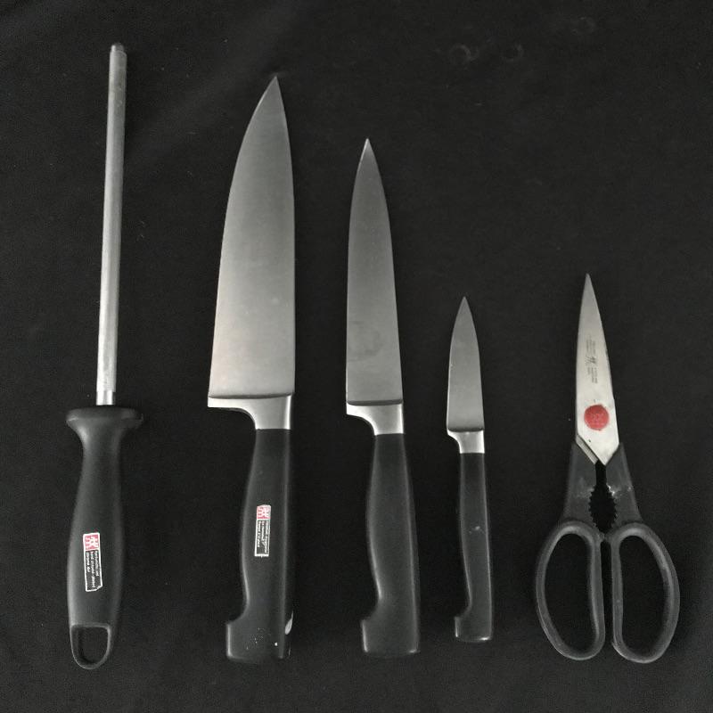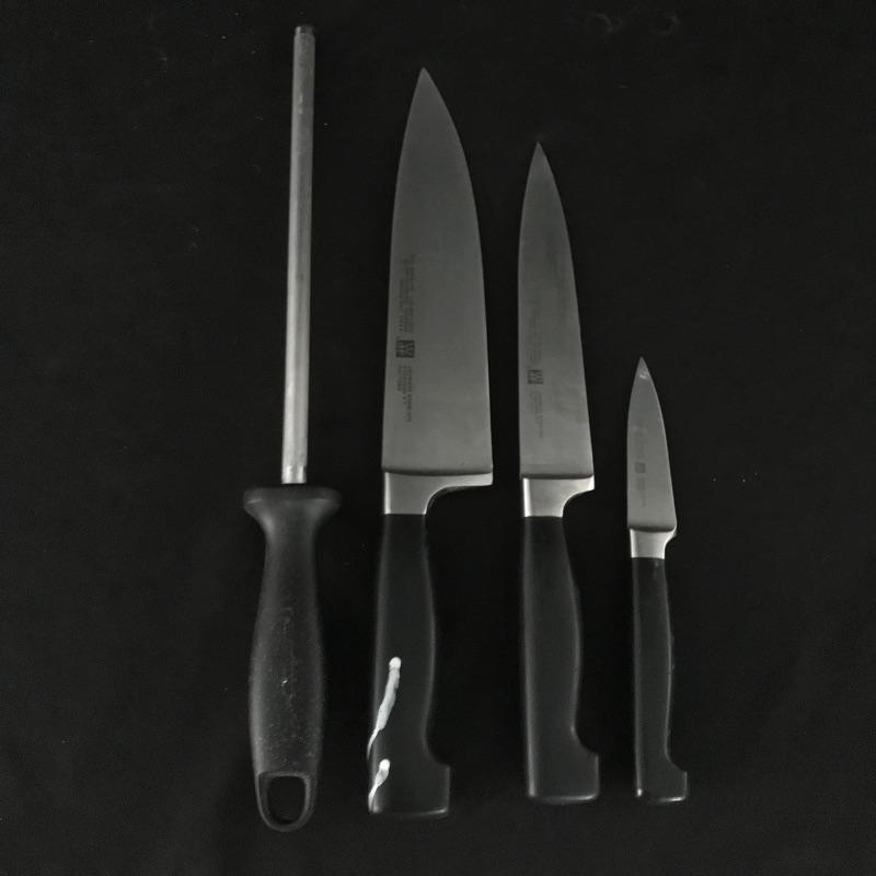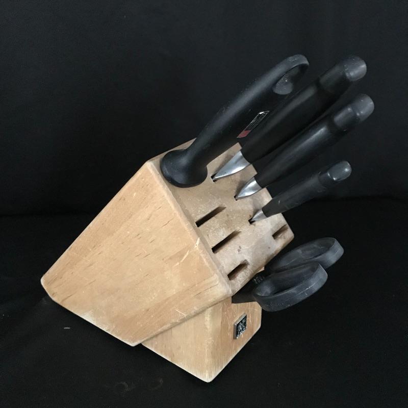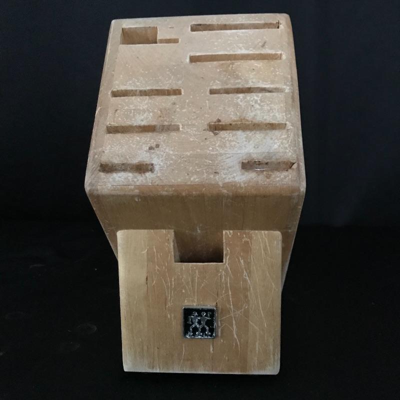 Eight, six and three inch blades with sharpener and shears by German manufacturer Zwilling J. A. Henckels. Collection includes manufacturer’s wood block for storage. Some white paint can be found on the sharpener and the handle of the eight inch knife. No shipping.