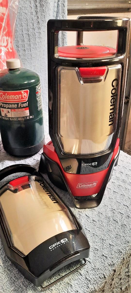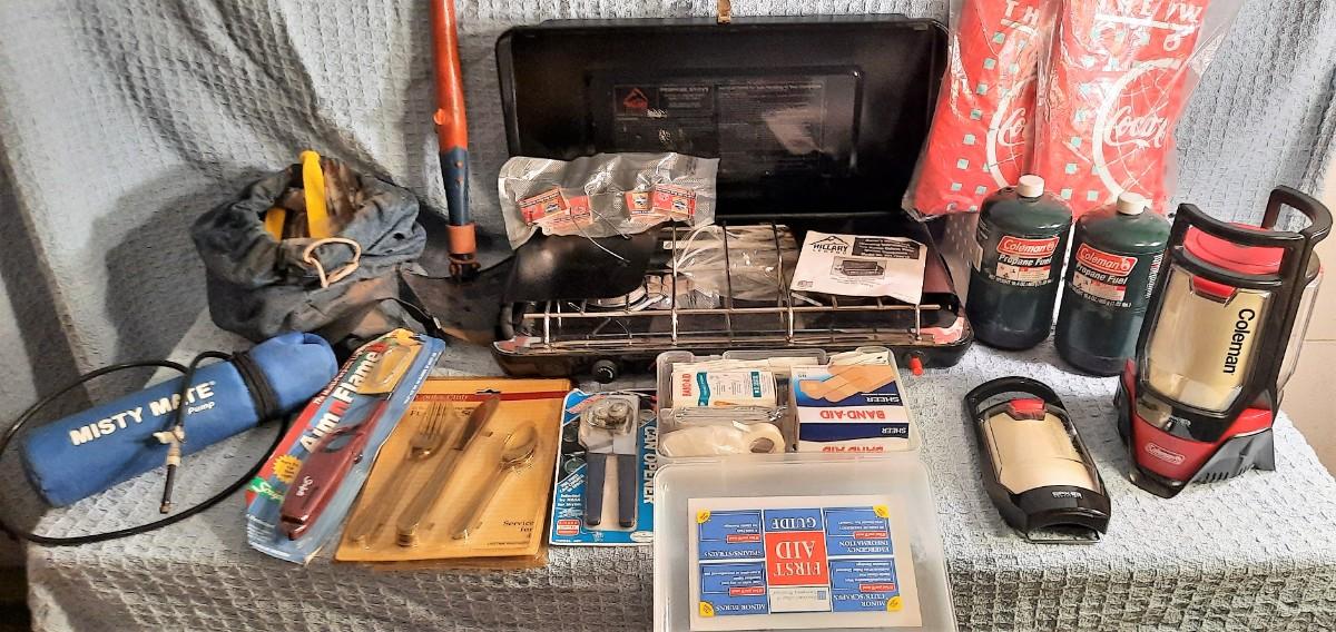 Coleman Lantern CPX 6 (3 Detachable Carry Lanterns in 1), 2 Cans of Propane, Can Opener, Silverware, Pair of Coca-Cola Ponchos, First Aid Kit, & a Bag of Stakes.