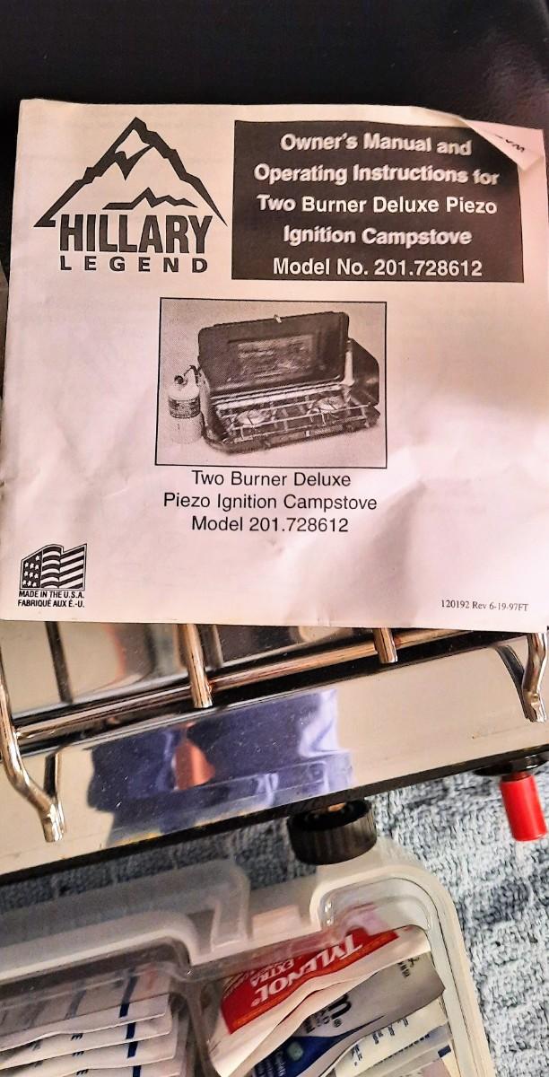 Lot 279 Large Camping Lot: Double Burner Propane Stove, Fold Up Shovel, Lantern, & More