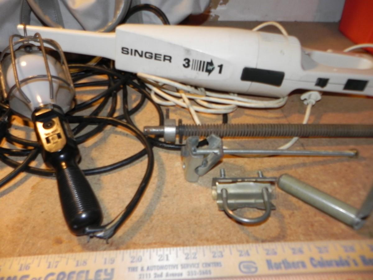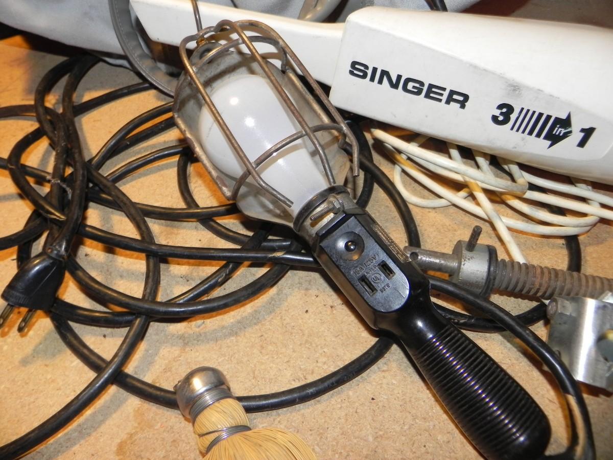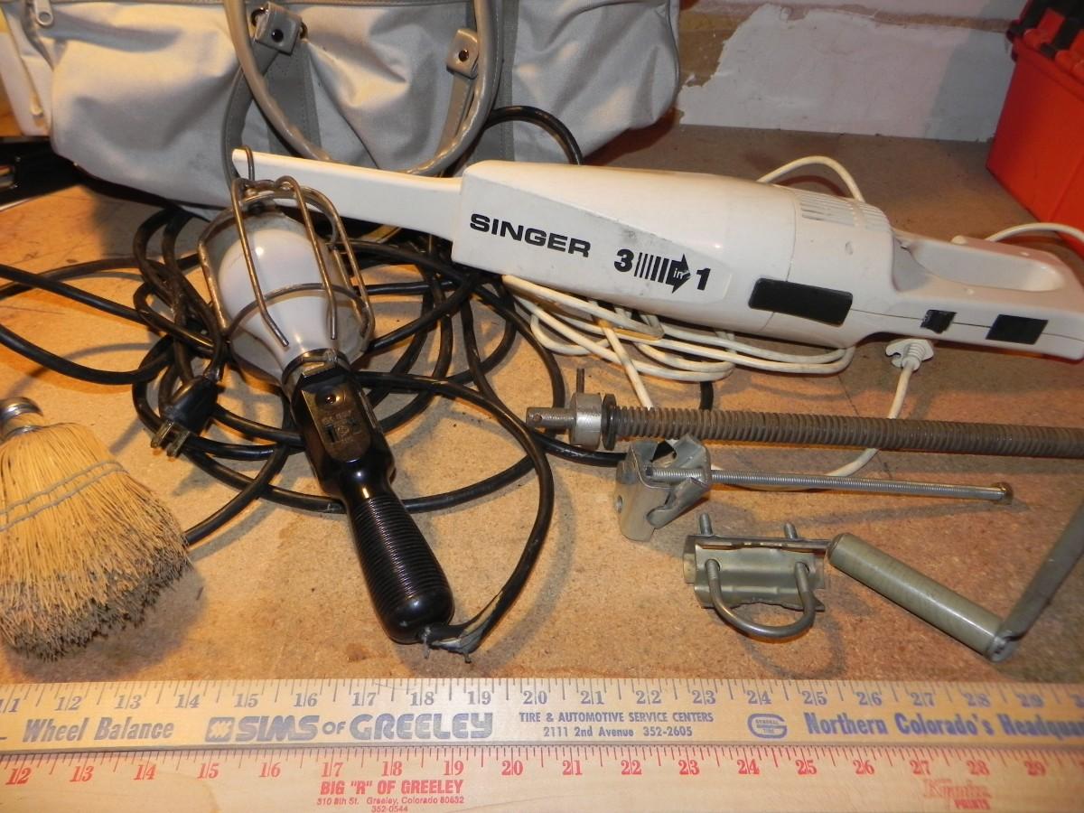 SINGER 3 IN 1 HAND VACUUM, TROUBLE LIGHT ON A RETRACTABLE REEL, WHISK BROOM AND MORE