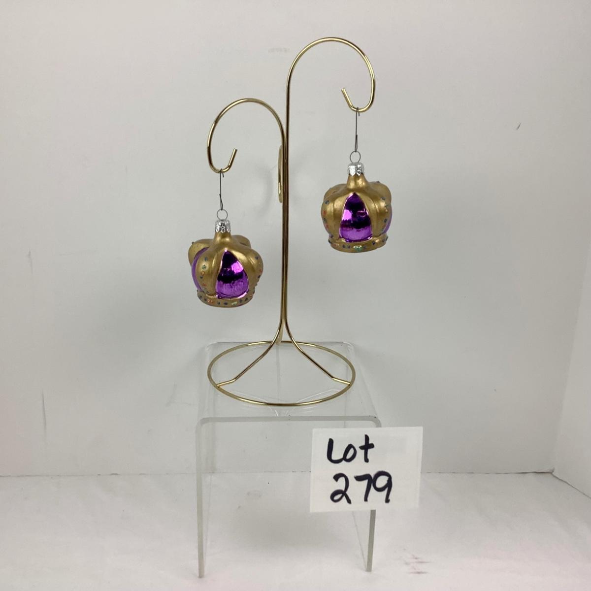 Lot 279 Pair of Vintage Blown Glass Purple Crown Ornaments