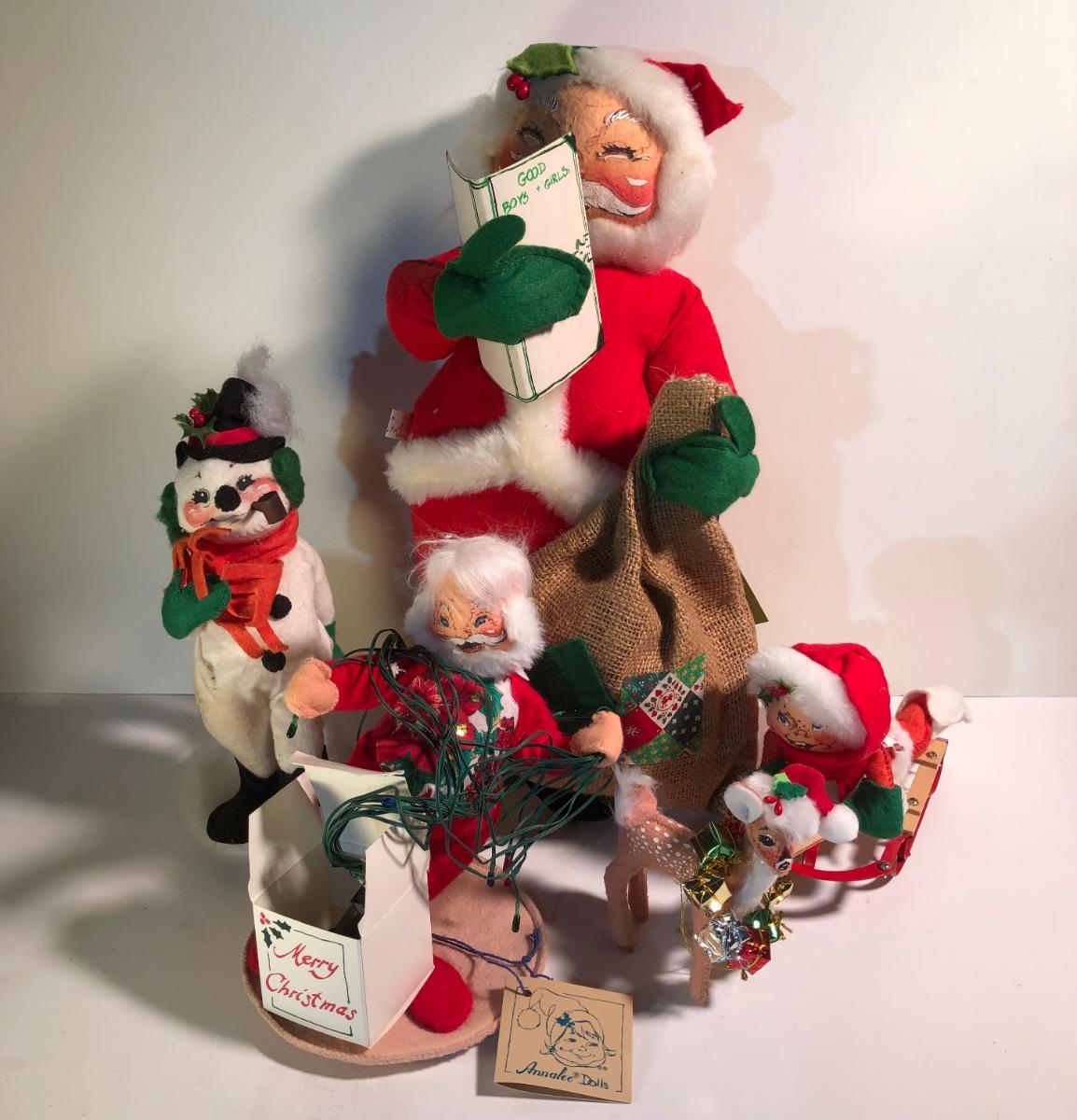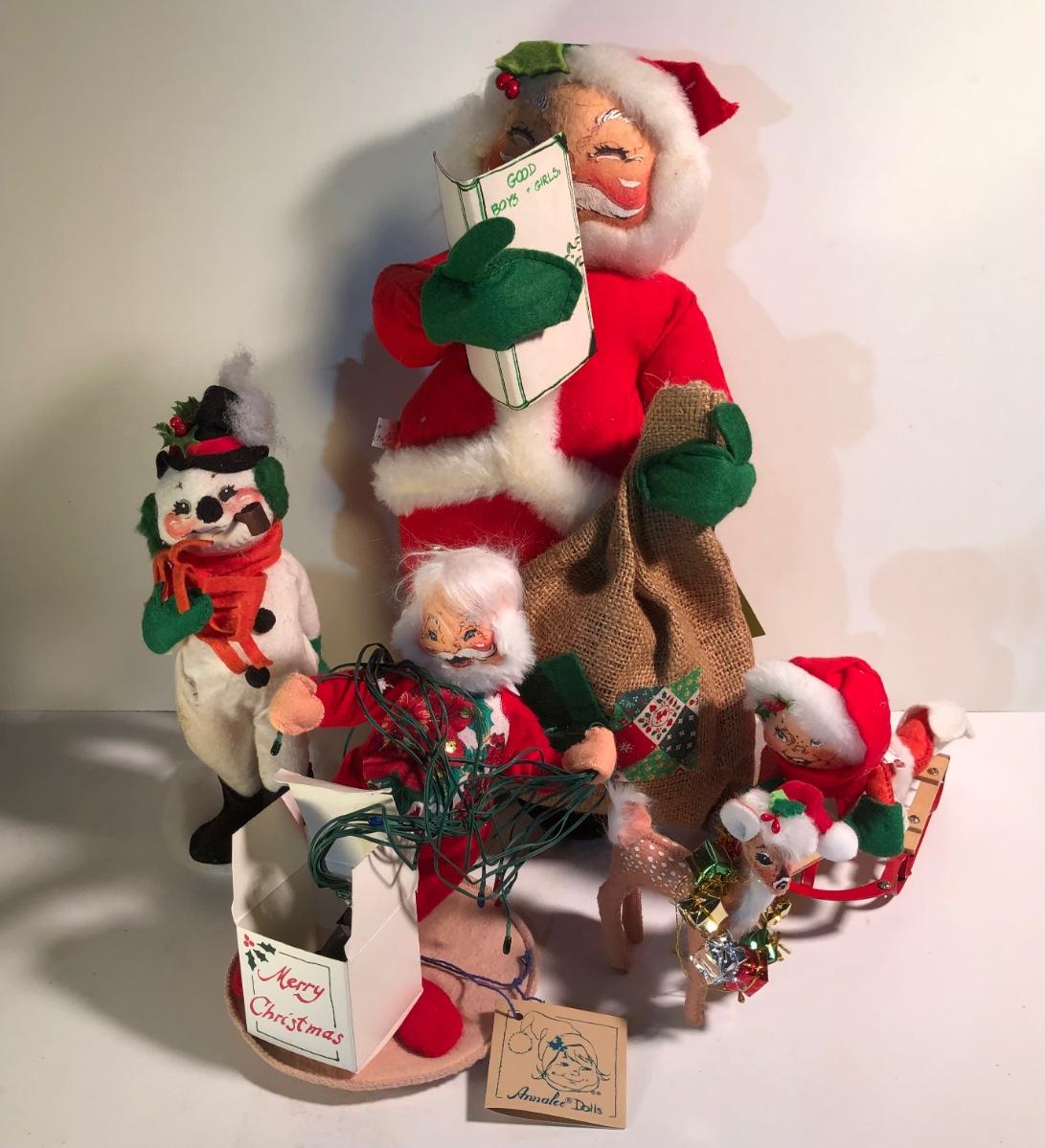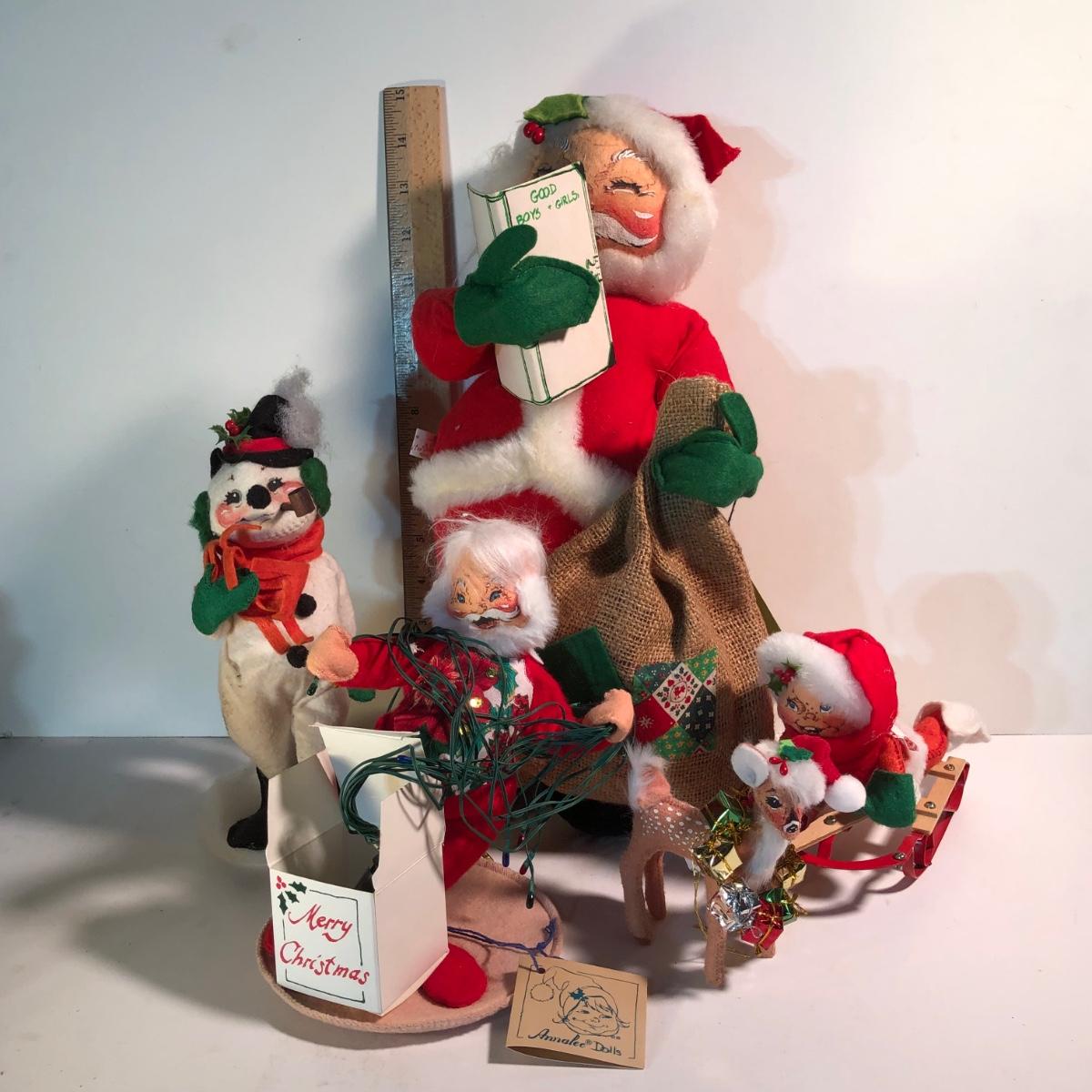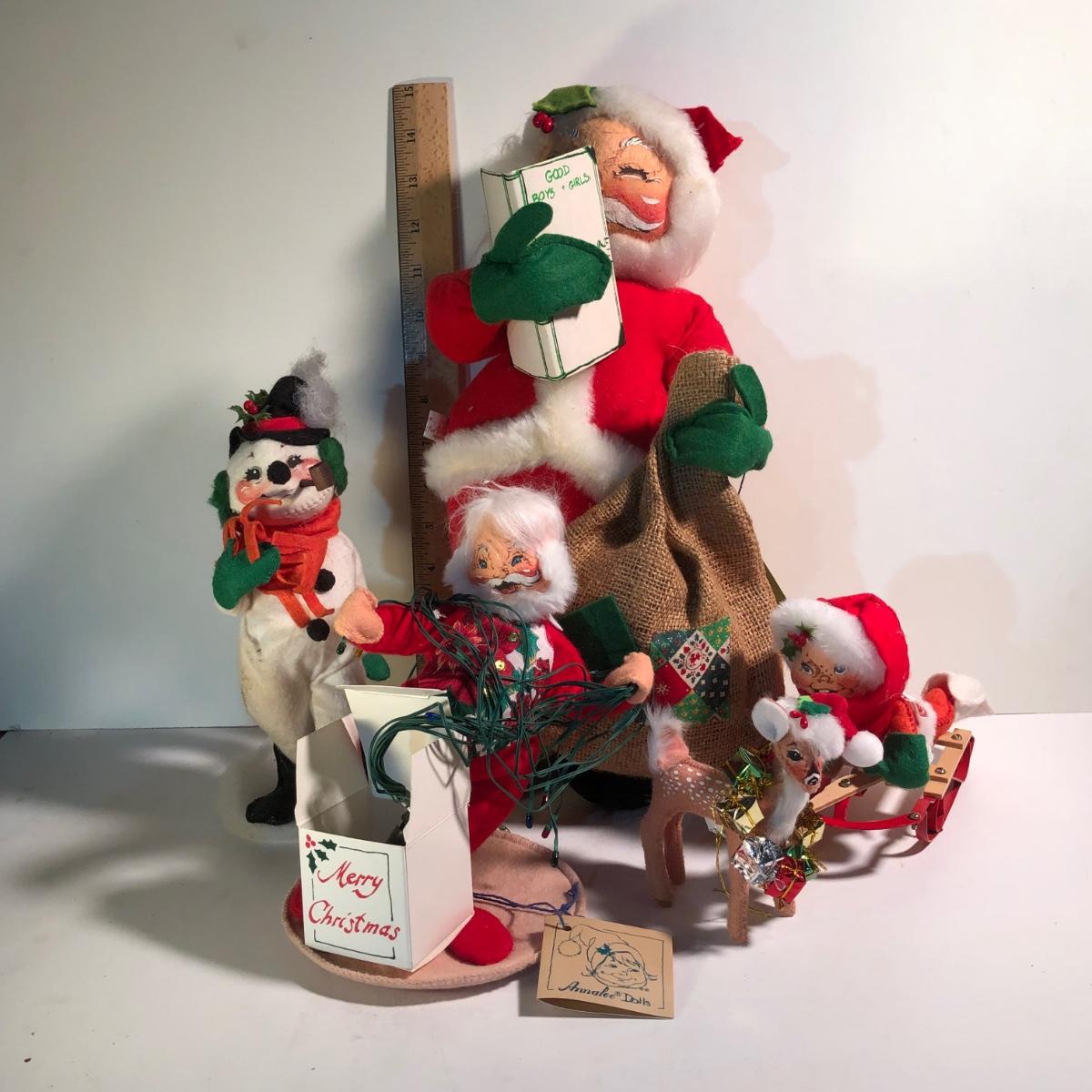 LOT 279B: Vintage Annalee Christmas Dolls - 1964 Santa w/ List & Toy Sack, Child on Sled, Reindeer, Snowman w/ Pipe, 1994 Santa w/ Lights