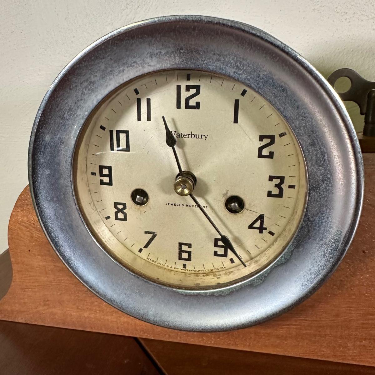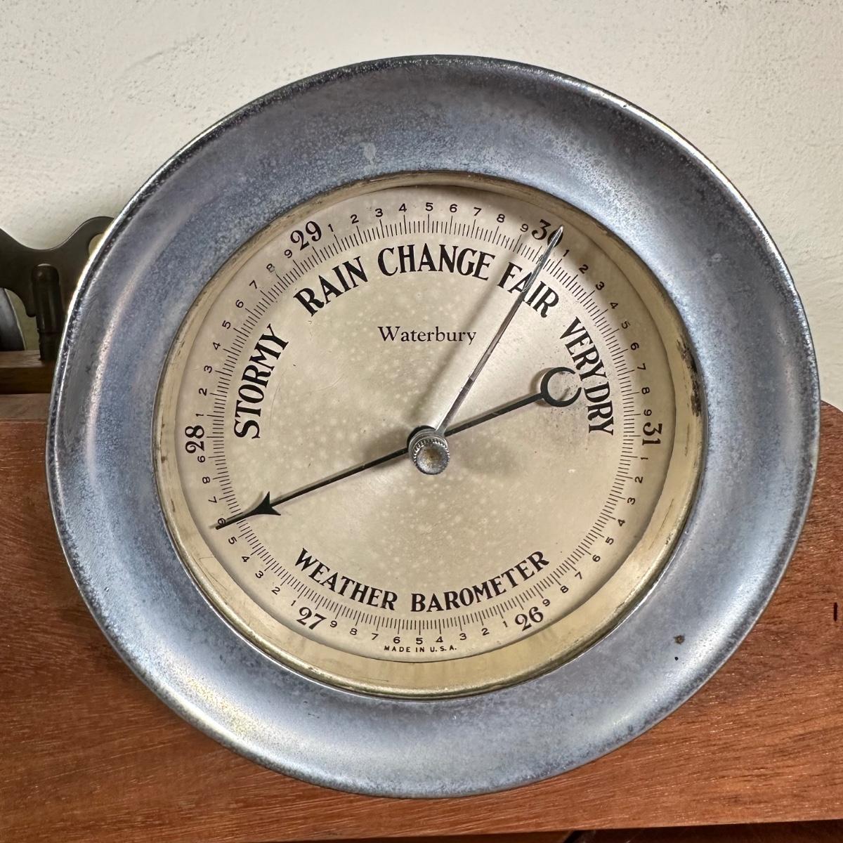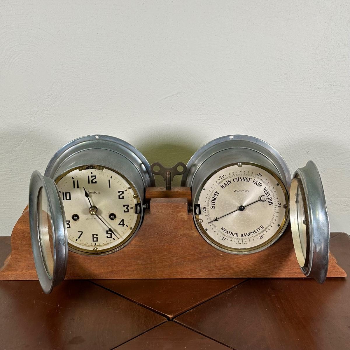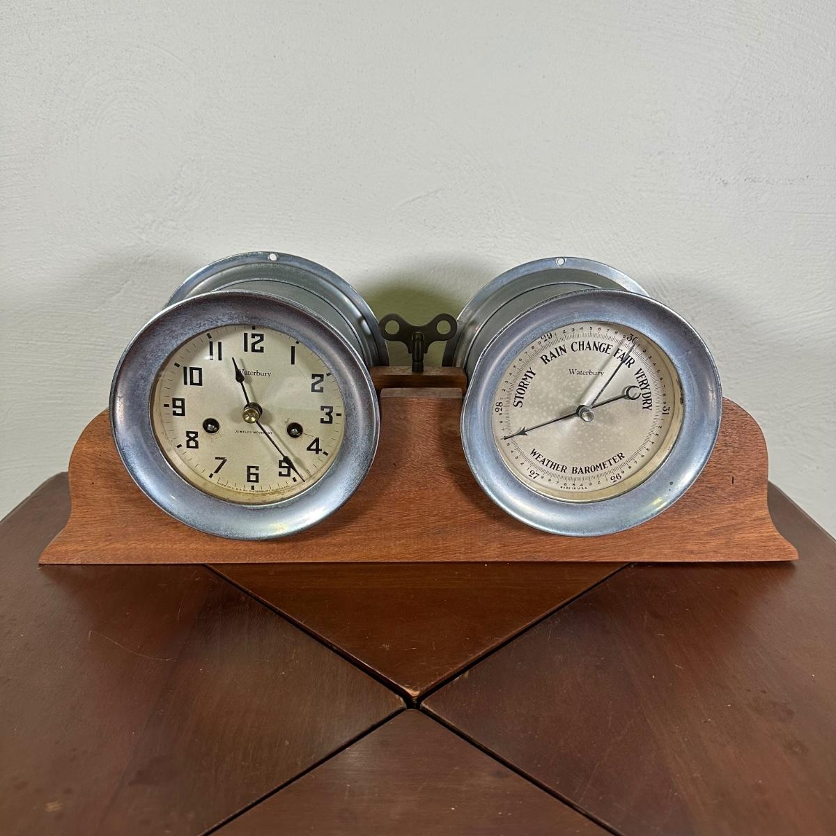 LOT 27B: Antique Waterbury Ship's Bell Clock & Barometer Wind Up with key!