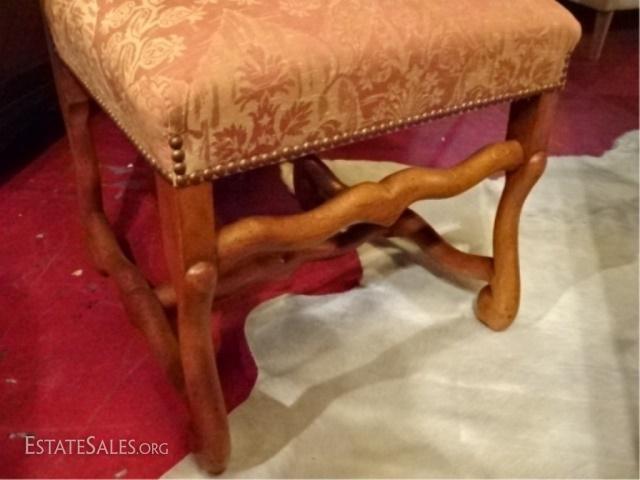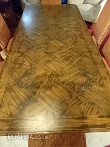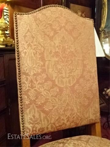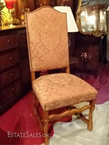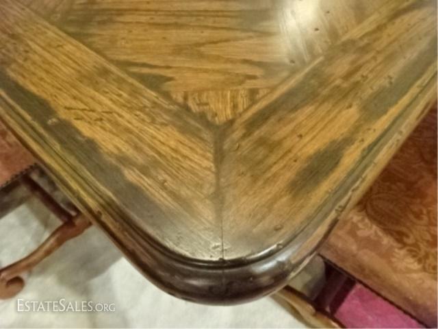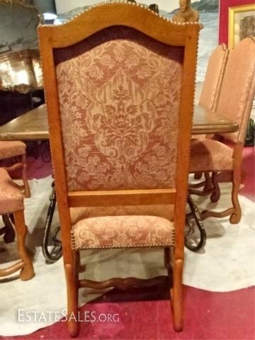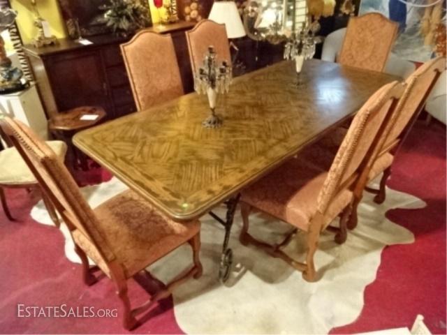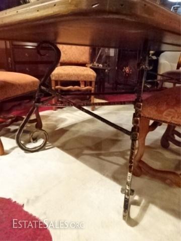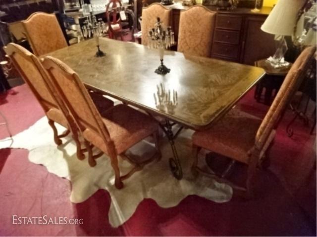 LOT 27C: 7 PC FRENCH STYLE WOOD AND METAL DINING TABLE WITH 6 LOUIS XIII STYLE DINING CHAIRS WITH NAILHEAD TRIM, VERY GOOD GENTLY USED CONDITION, TABLE MEASURES 90"W X 40"D X 29.5"H, SKU351.01