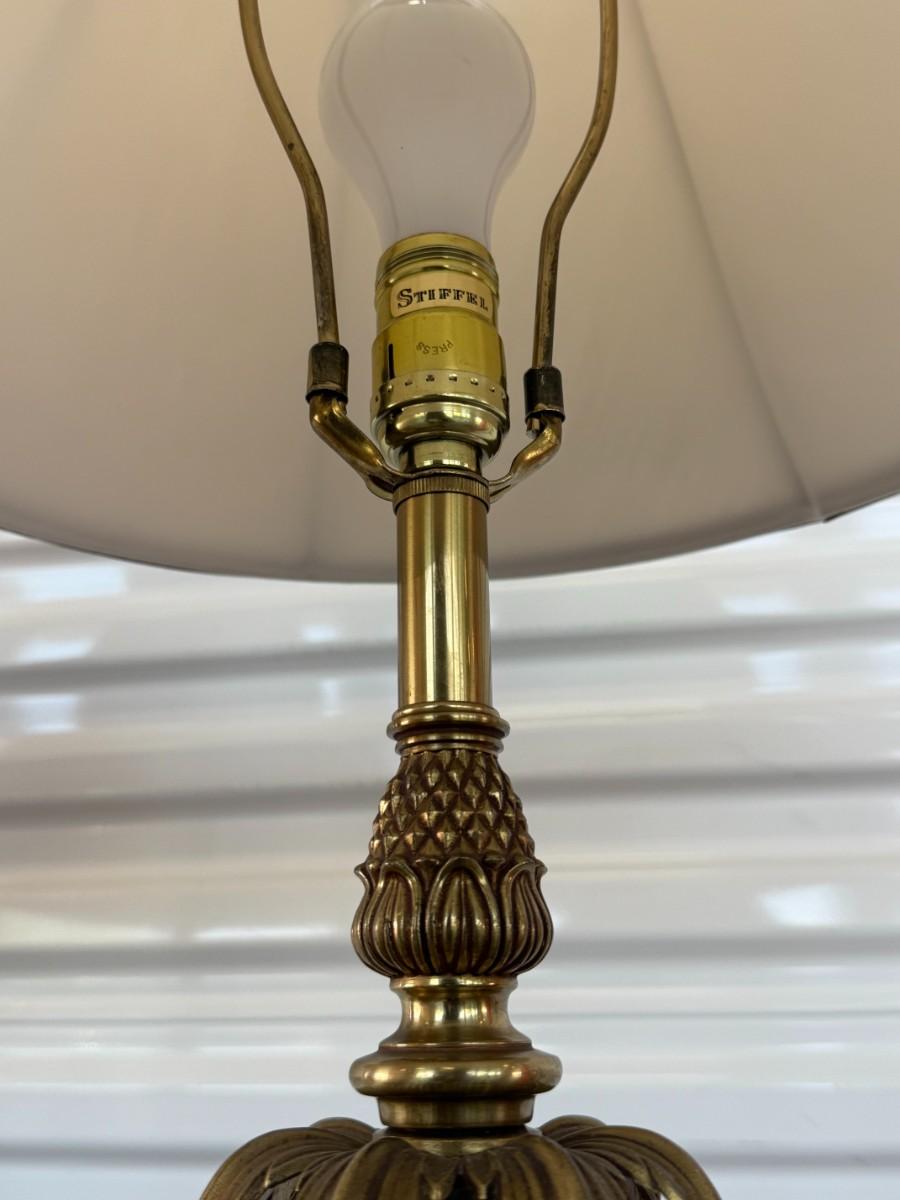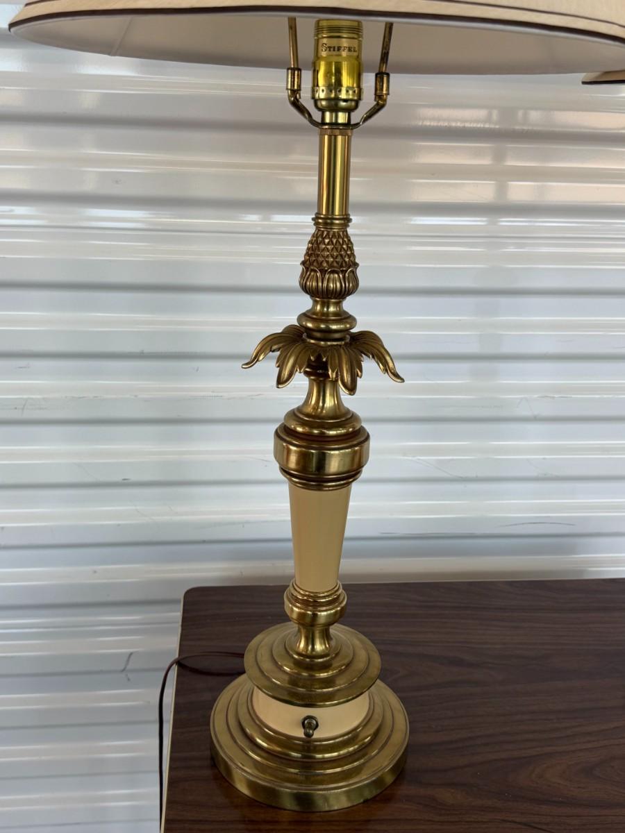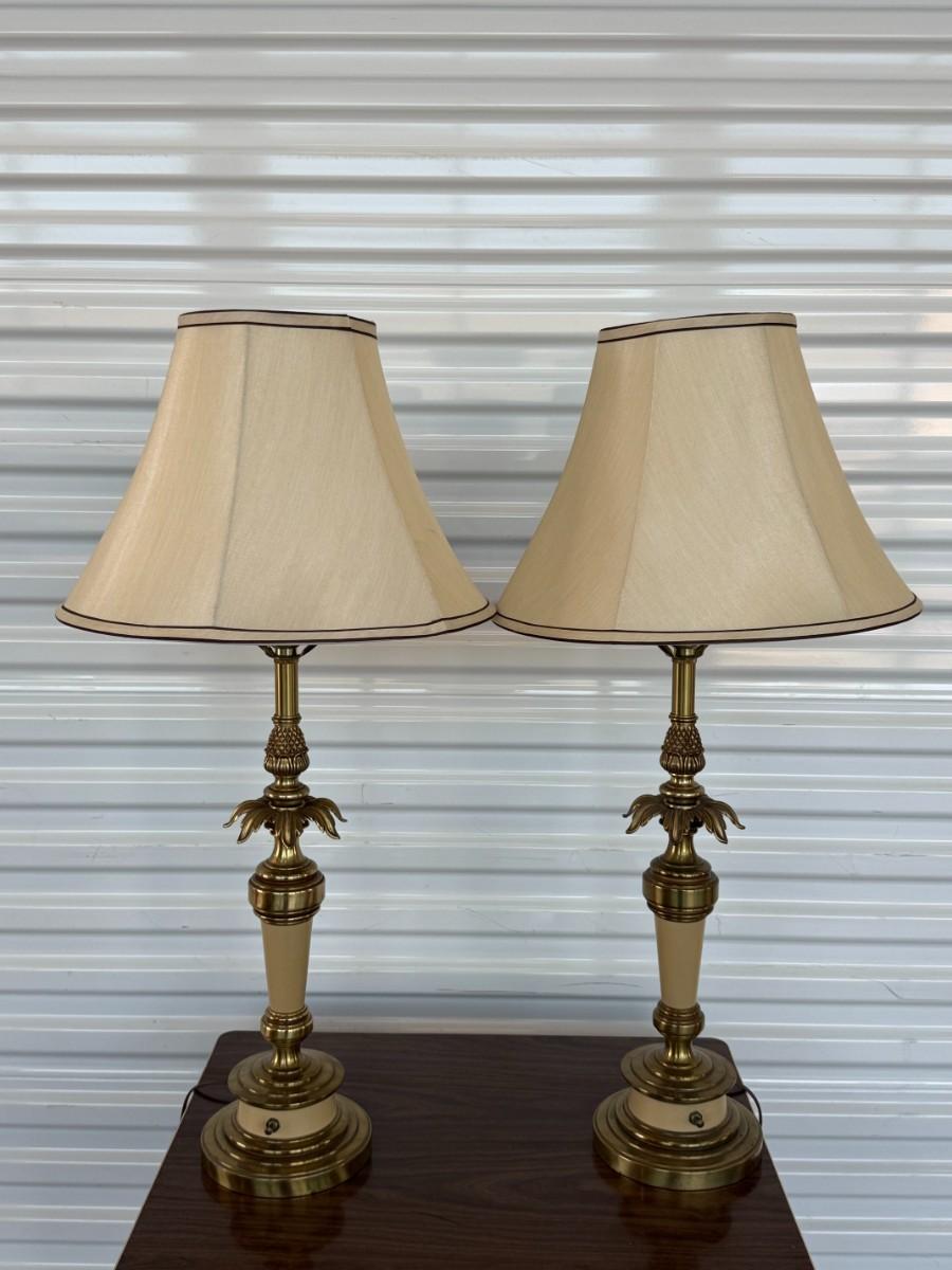 This elegant pair of Stiffel table lamps showcases the brand’s renowned craftsmanship, featuring a sophisticated gold leaf design that adds a touch of timeless luxury. Known for producing high-quality lighting since the mid-20th century, Stiffel lamps are highly sought after for their durability, classic styling, and collectible value.