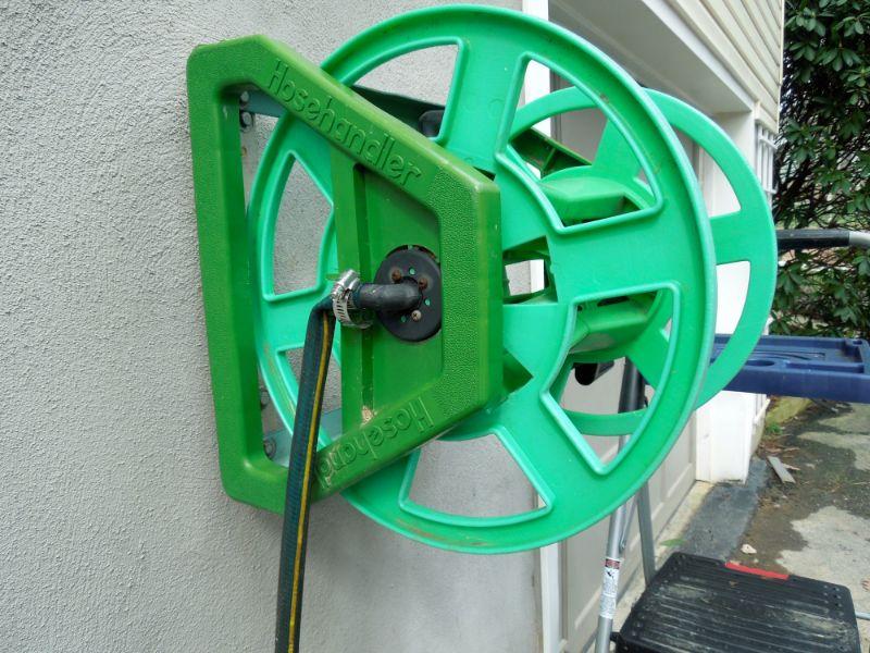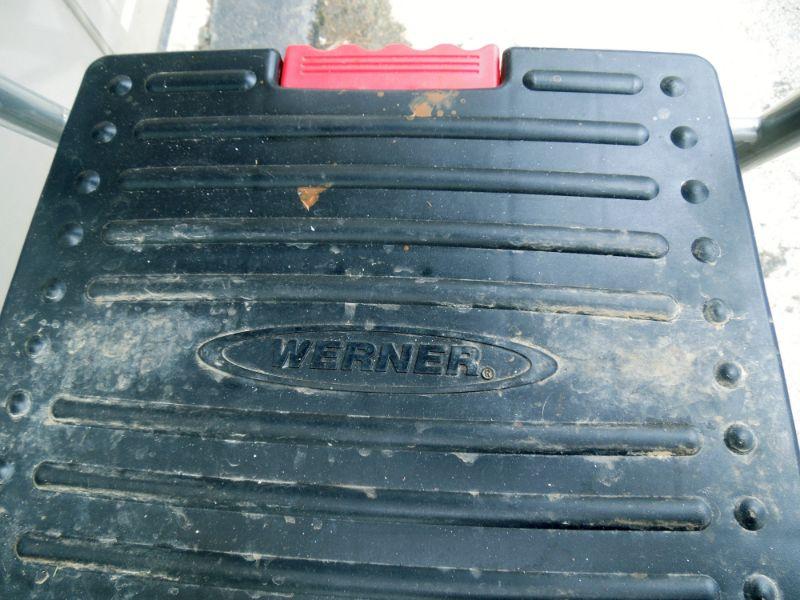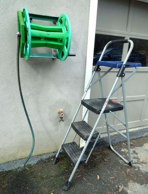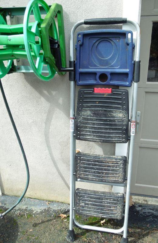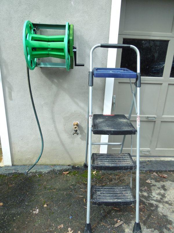 Lightly used 34 in high folding Werner step ladder with platform. Also included is wall mounted "Hose Handler" hanging crank hose reel in good condition with no cracks. No hose included. Sold separately.