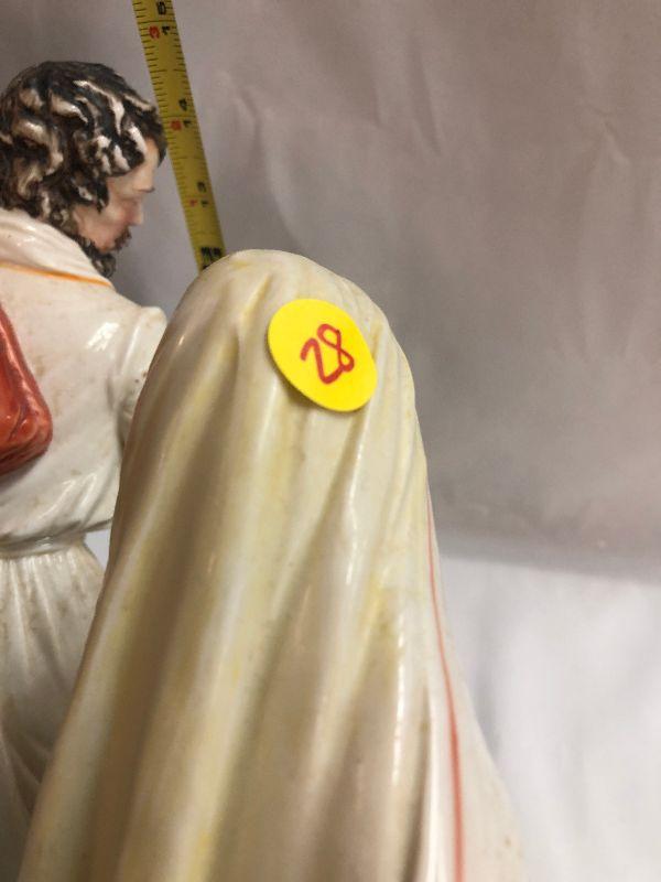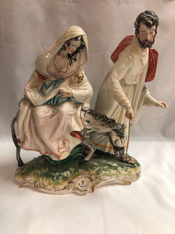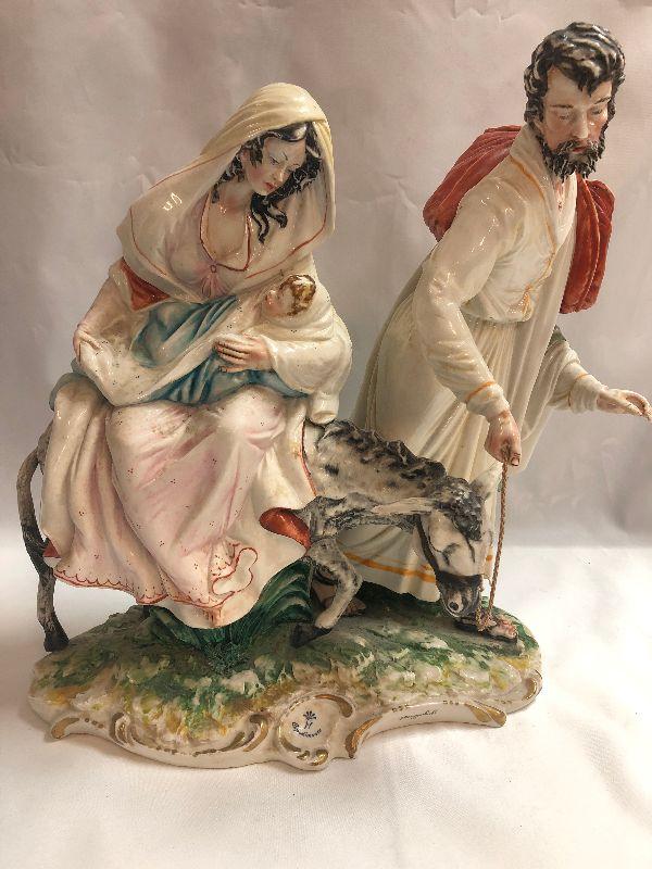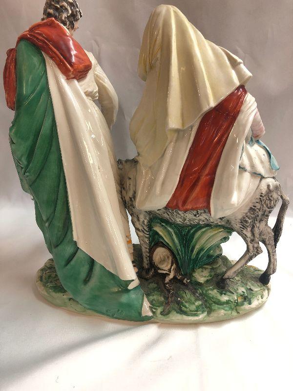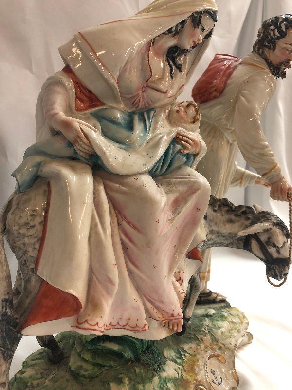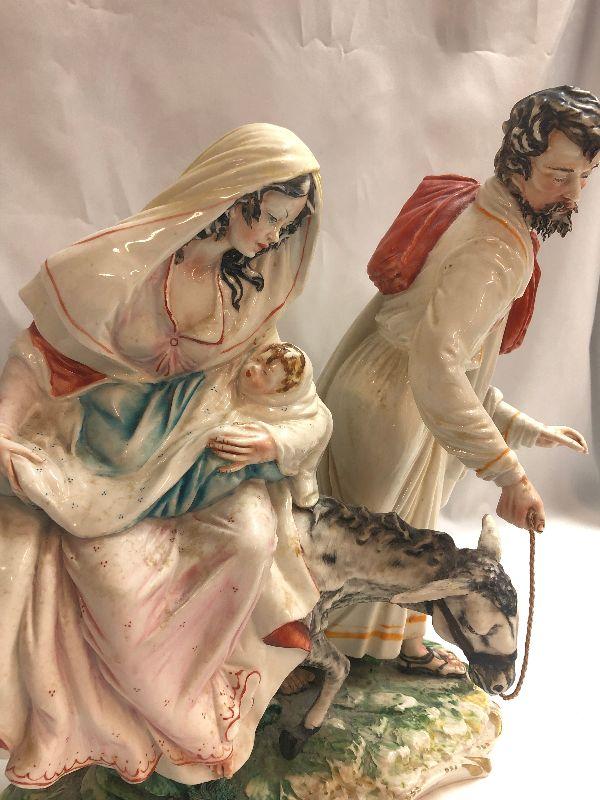 Mid Century, very detailed and very beautiful. This very large porcelain piece depicting the Blessed mother fawning over her child as Joseph try's to lead them to saftey. It is in very good condition and is an exquisite work of art!