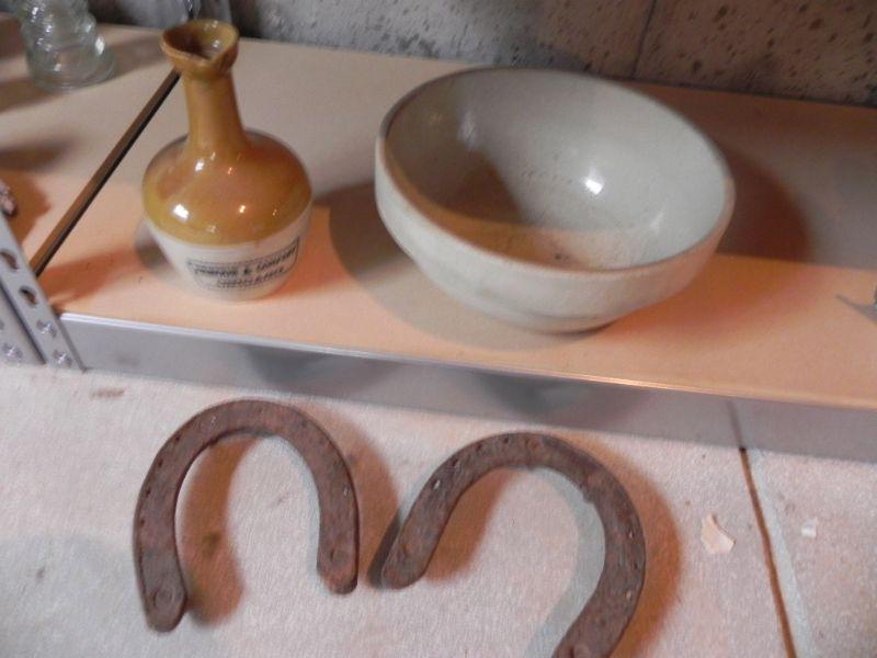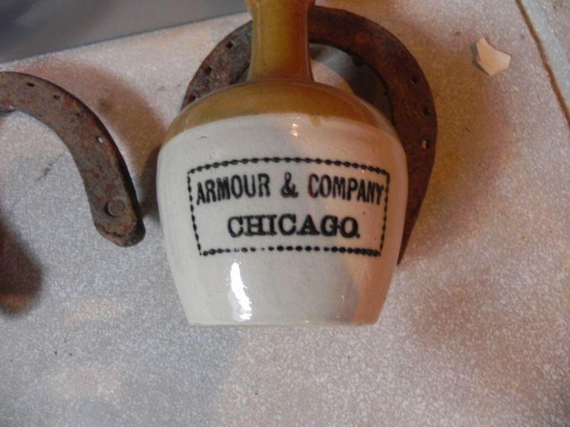 PITCHER MARKED ARMOUR & COMPANY CHICAGO, CLAY BOWL DOES HAVE A CRACK, HORSESHOE'S