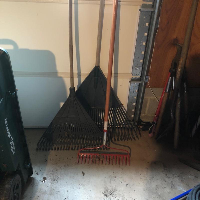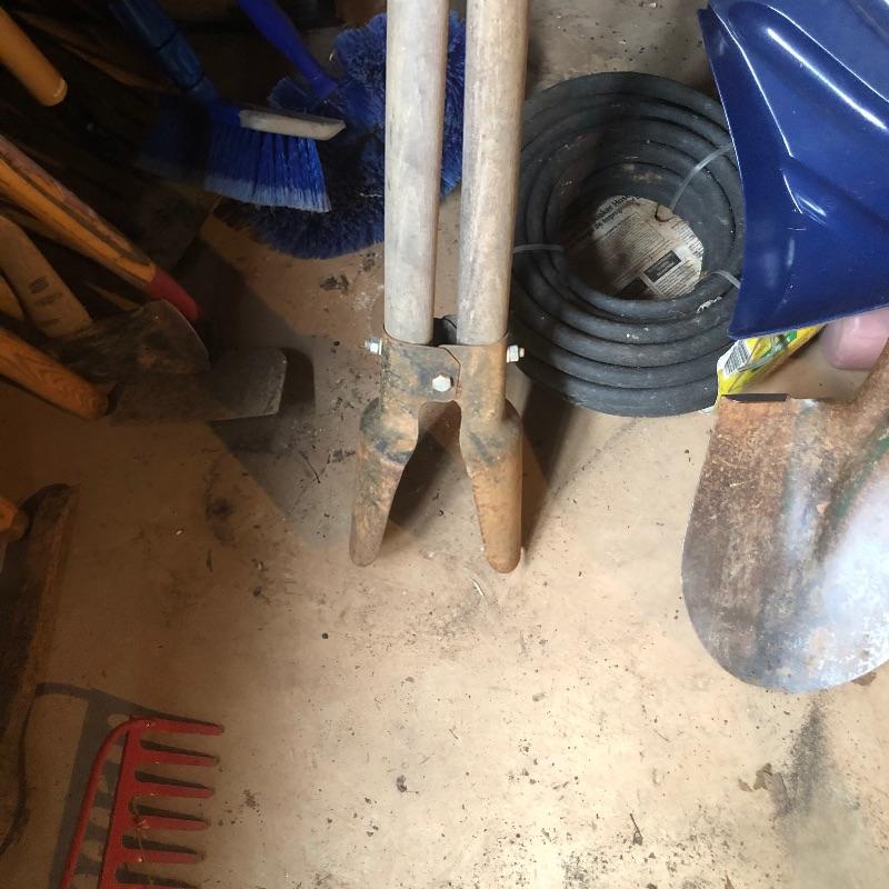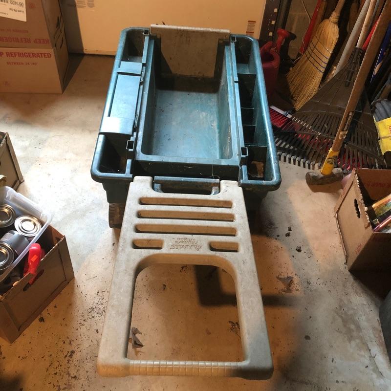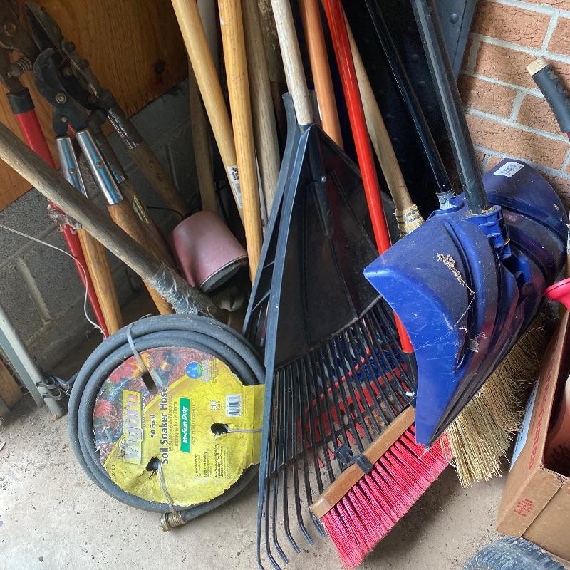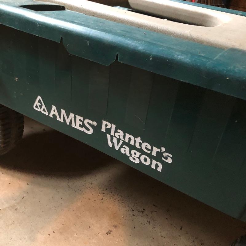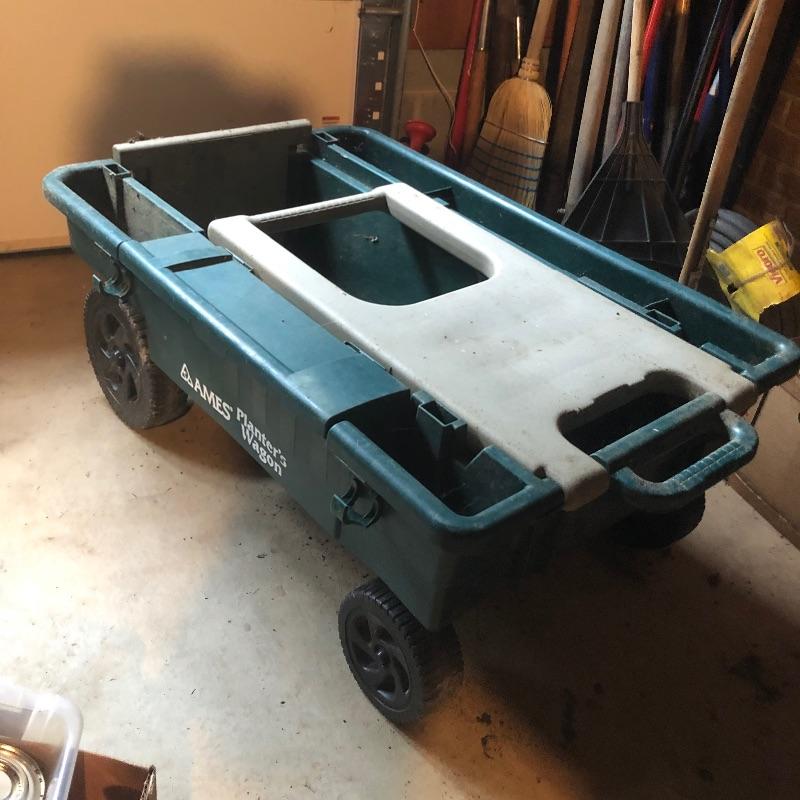 There are plenty of garden tools here that accompany this handy Ames garden wagon. The wagon is in good shape(just dirty) with good sized plastic wheels. Their are too many hand tools to list “”see images. We have also thrown in two Rubbermaid garbage cans, the smaller one has a crack at the base and no lid but could be used for hauling leaves and such. The larger one is a rolling Bin with lid.
