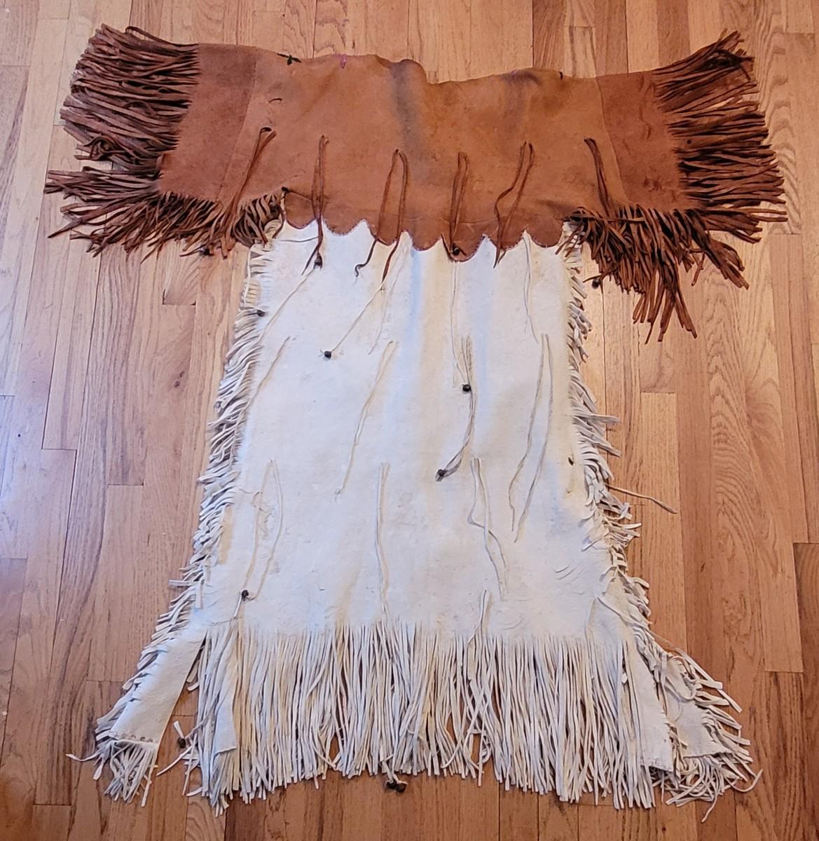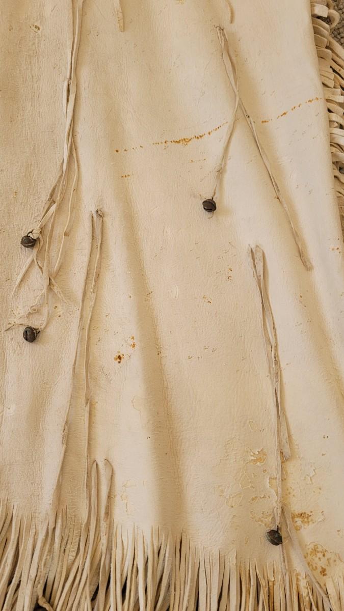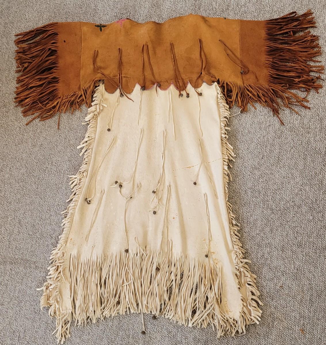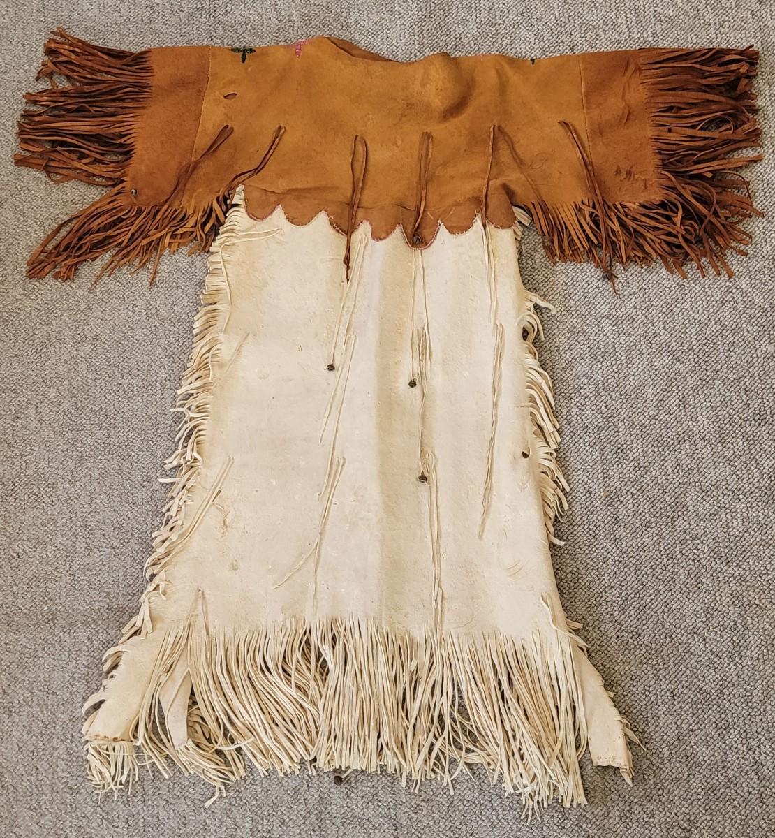Lot 28: Late 1800's Southern Cheyenne Native American Brown & White Hide Dress with Fringe, Bells and Seed Bead Flowers