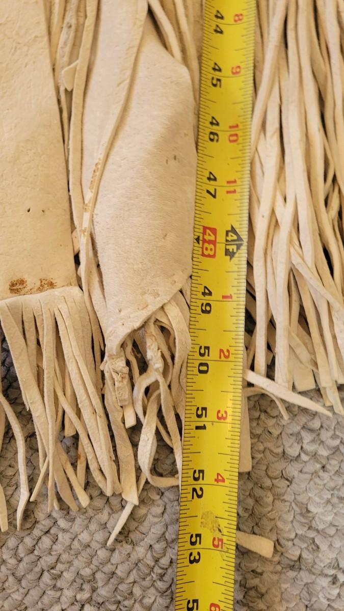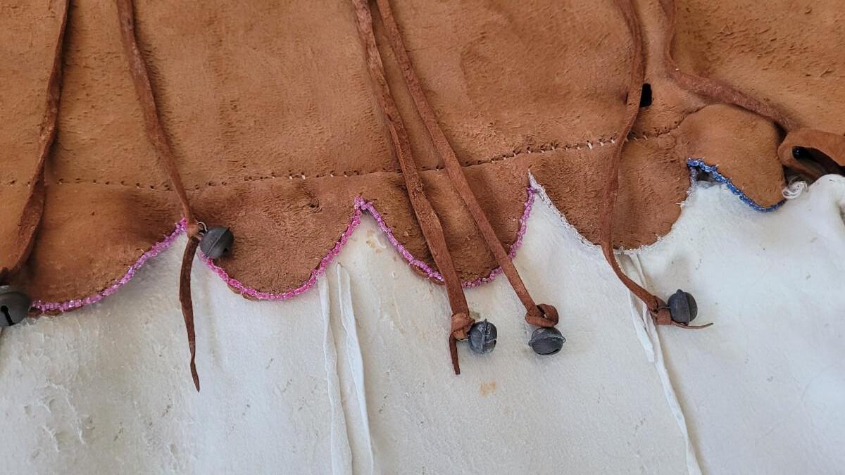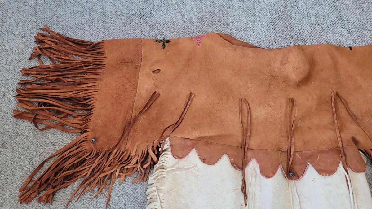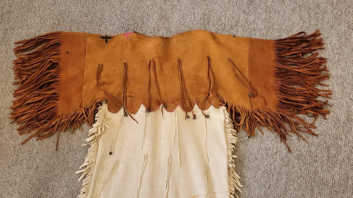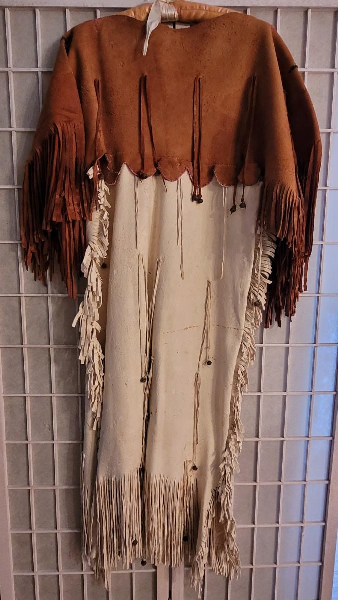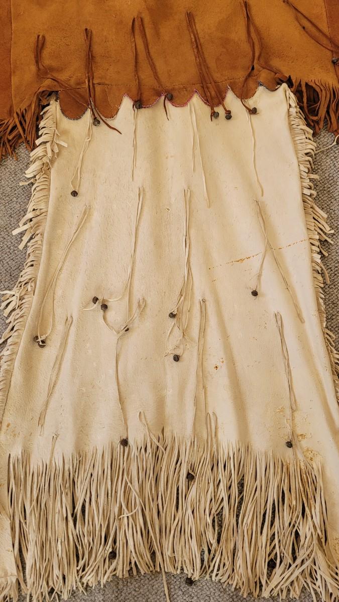 Lot 28: Late 1800's Southern Cheyenne Native American Brown & White Hide Dress with Fringe, Bells and Seed Bead Flowers