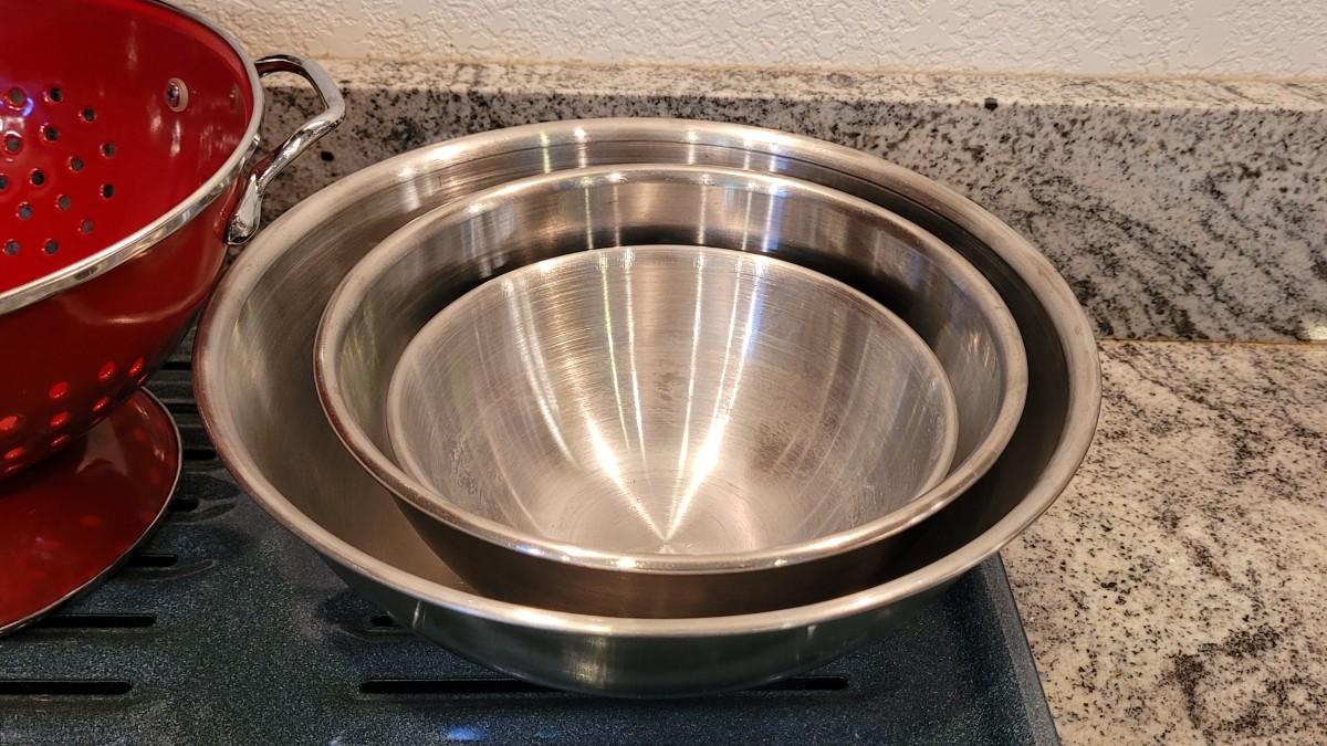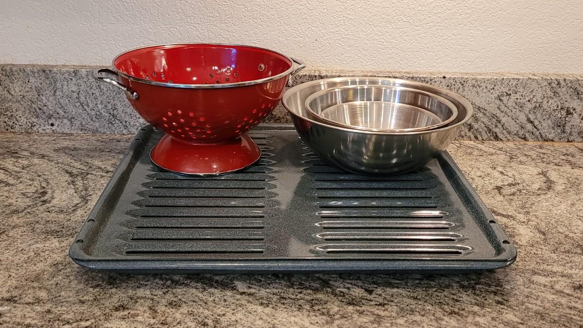 Lot 28: Broiler Pan, Metal Strainer and Nesting Mixing Bowls