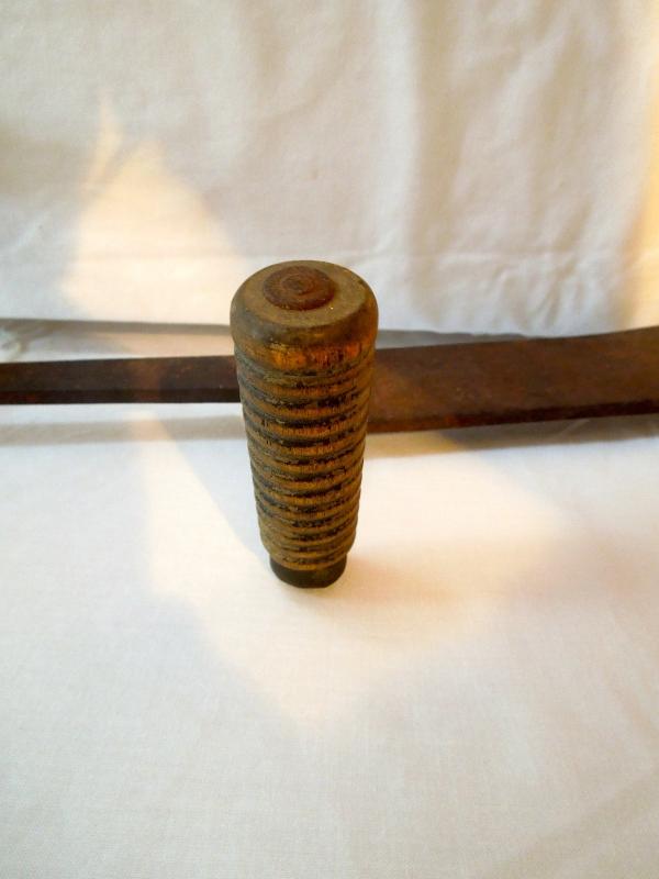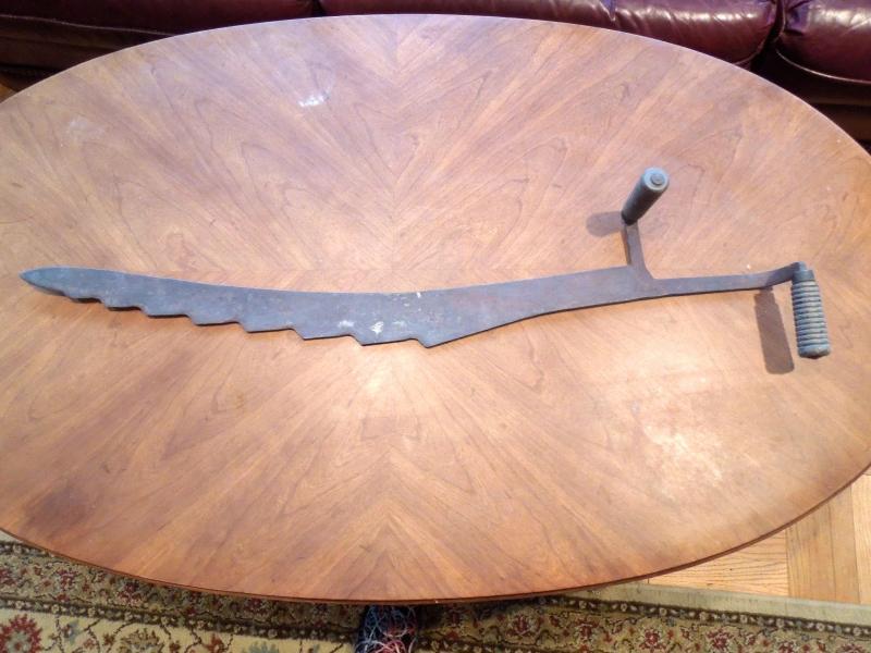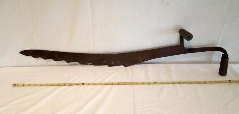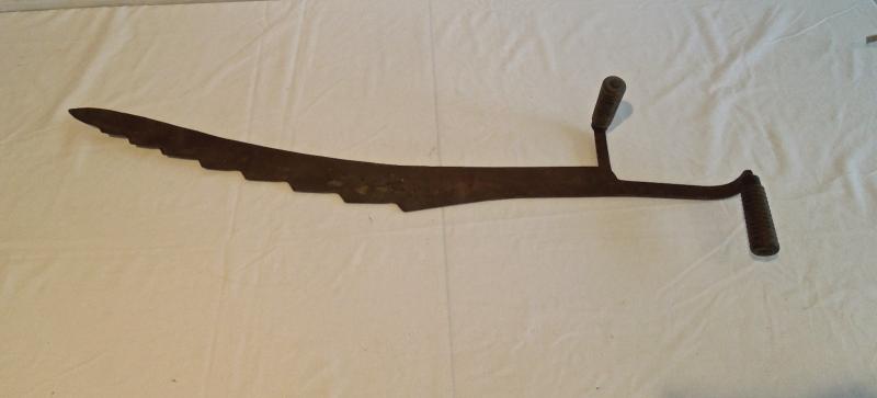 Saw is in good condition considering age. Not sure exactly what it cuts, hay, bricks ? Nice 2 handled saw. The jagged blade is not sharp, not sure if it ever was. I'm not an expert on farm tools. The approximate measurement is 36 1/2"long. Metal on blade is rusted with age.
