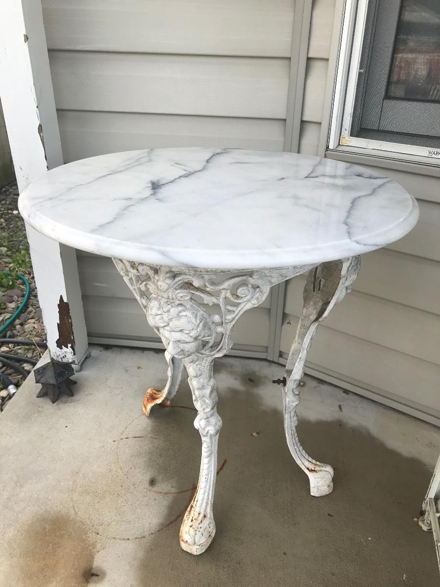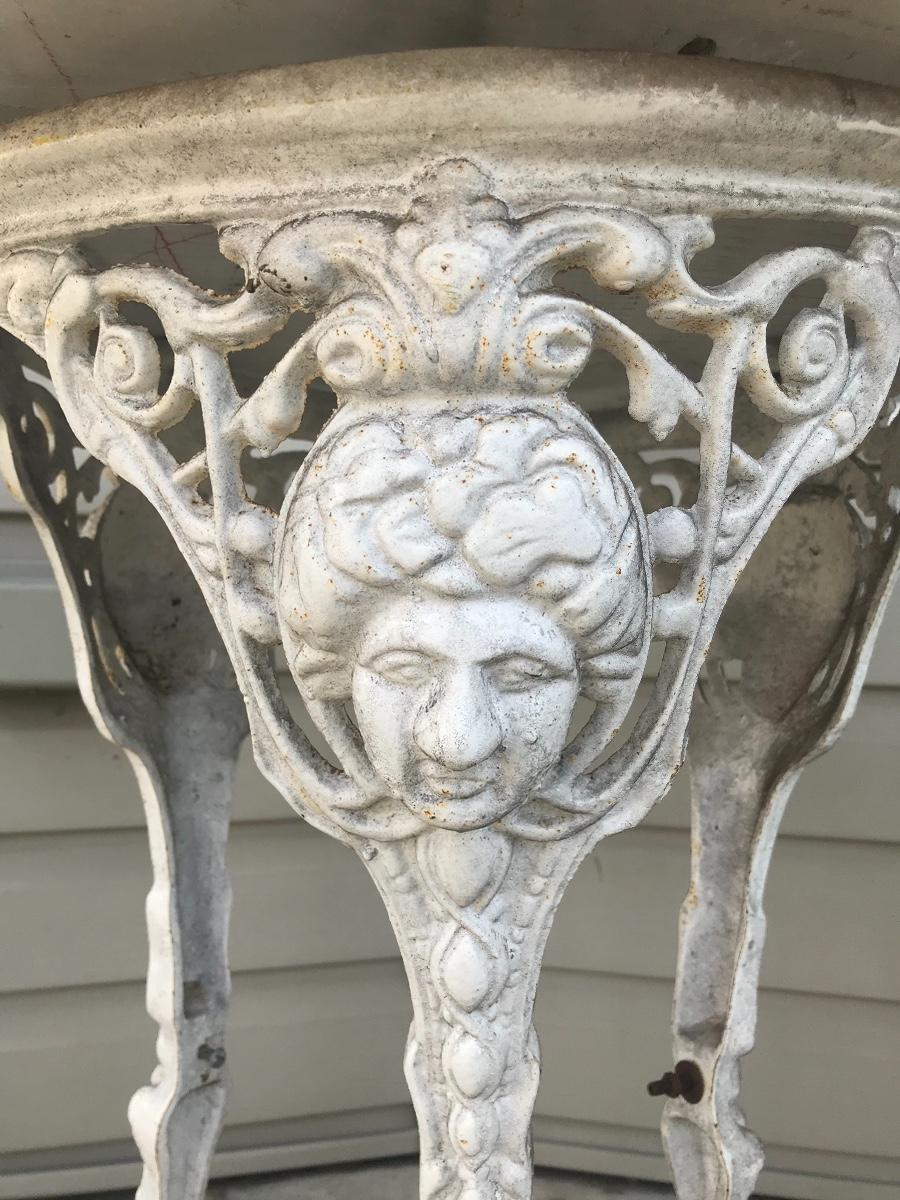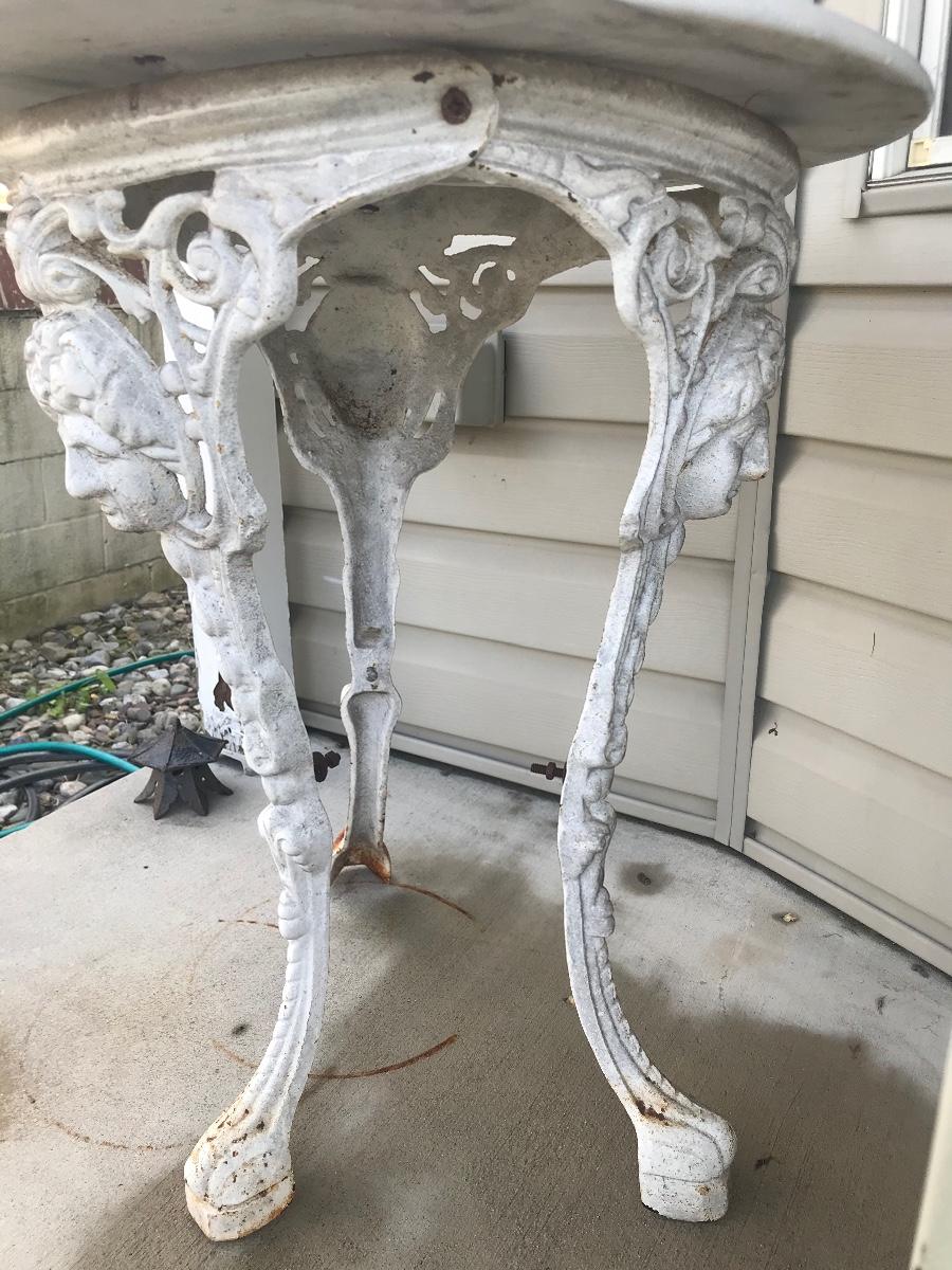 A wrought iron table with paw feet, scroll work, and a face. The marble top is not connected. An awesome, unusual table. Please see all pictures for content of the lot, condition of the lot, and measurements if taken. Pictures are the best representation of the items listed and items are untested unless indicated in description. Thank you for looking and have fun bidding!