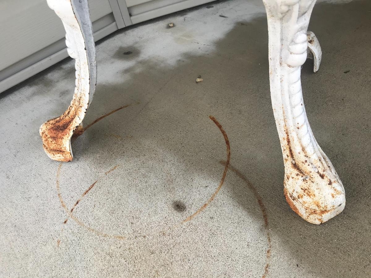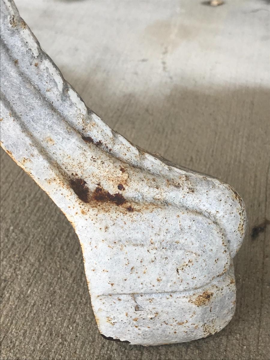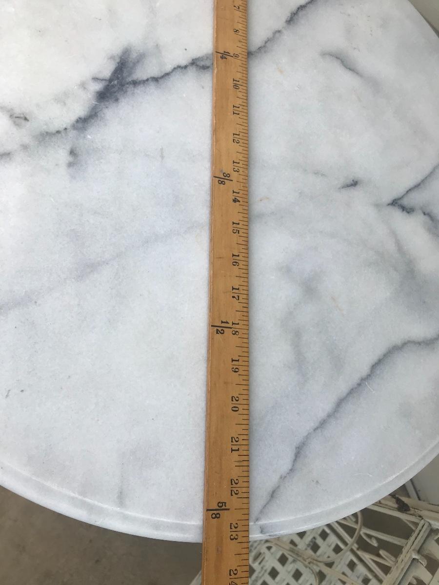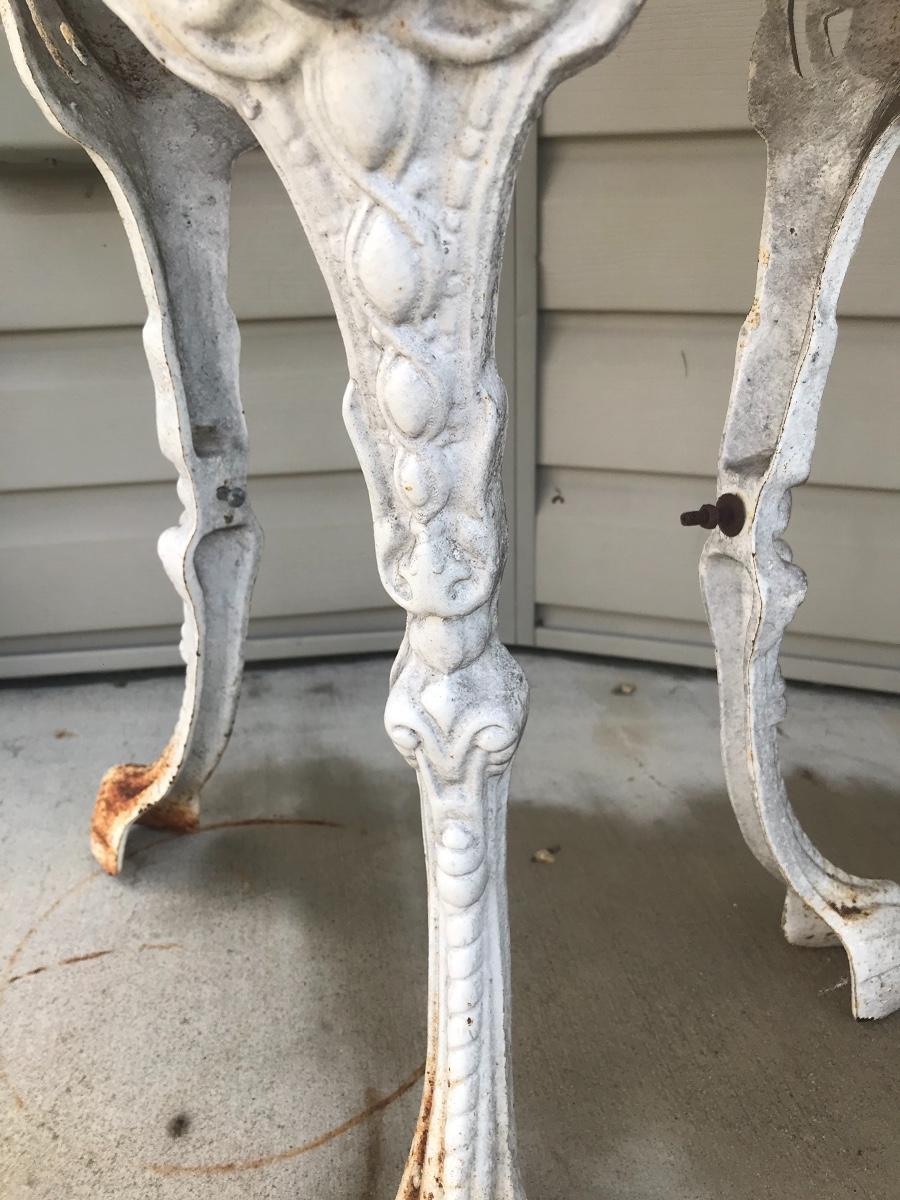 A wrought iron table with paw feet, scroll work, and a face. The marble top is not connected. An awesome, unusual table. Please see all pictures for content of the lot, condition of the lot, and measurements if taken. Pictures are the best representation of the items listed and items are untested unless indicated in description. Thank you for looking and have fun bidding!