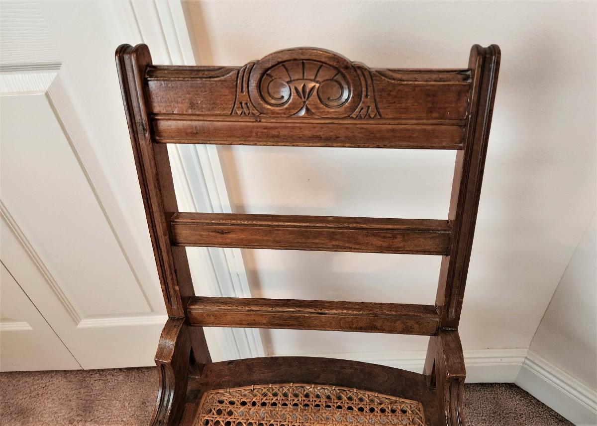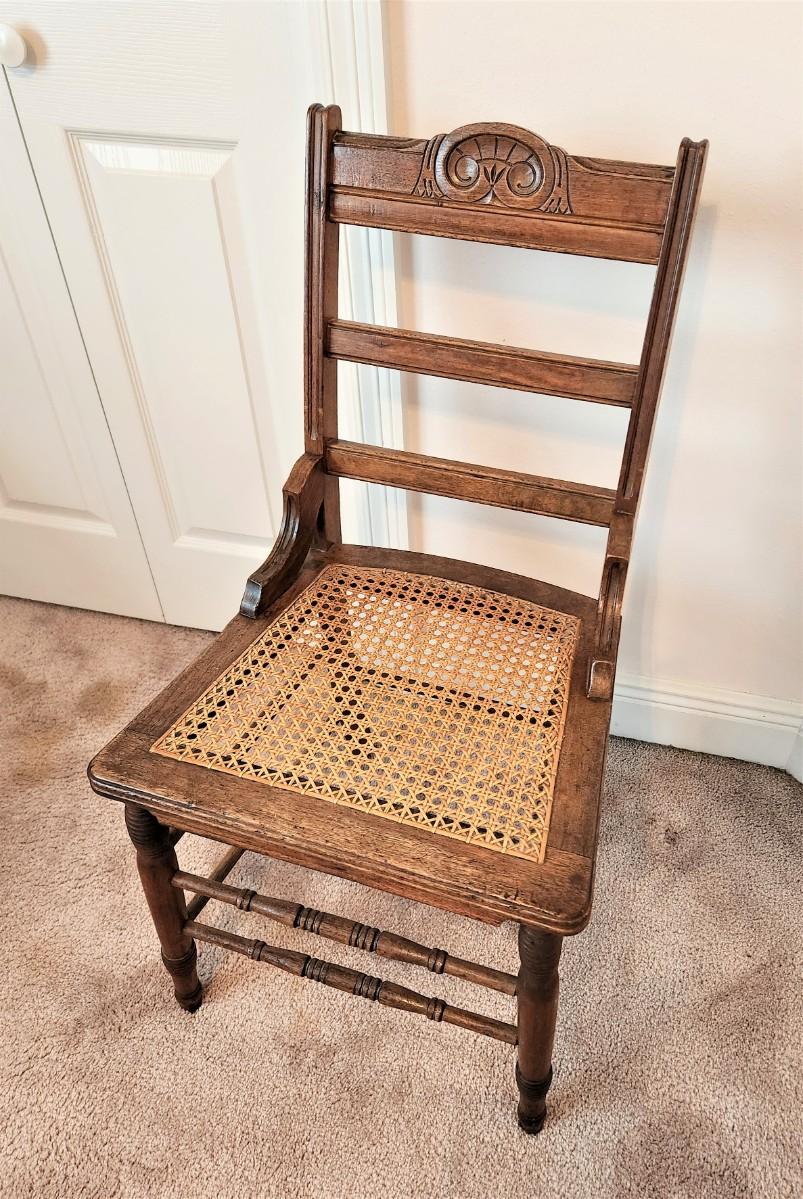 Good solid oak antique side chair - cane bottom - nice and tight. Great condition. 18" across at seat, 16" deep, 35" tall.