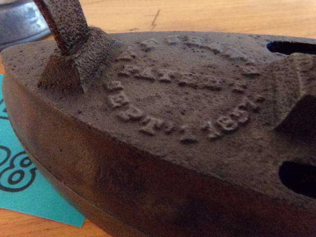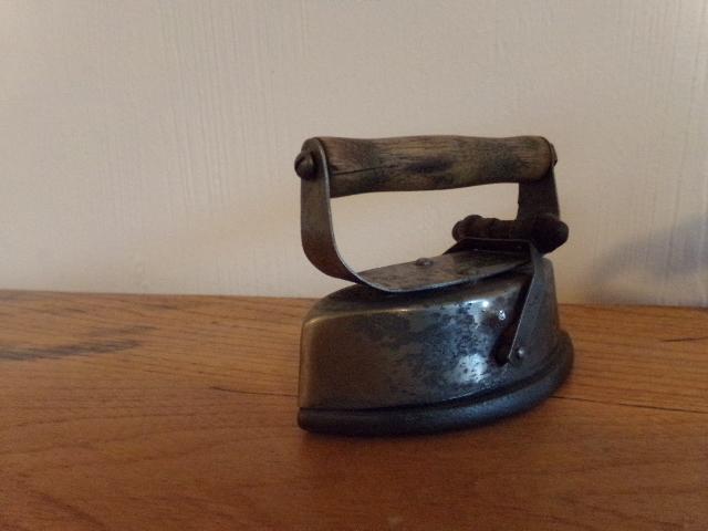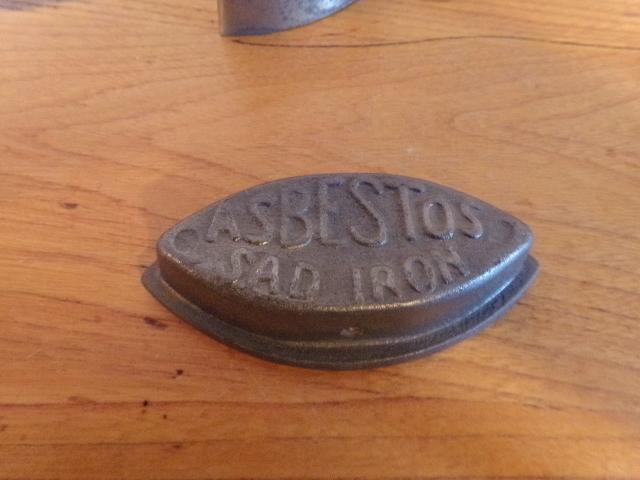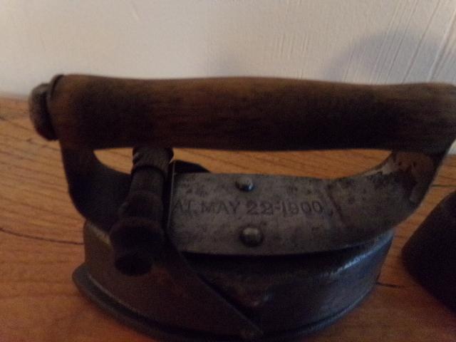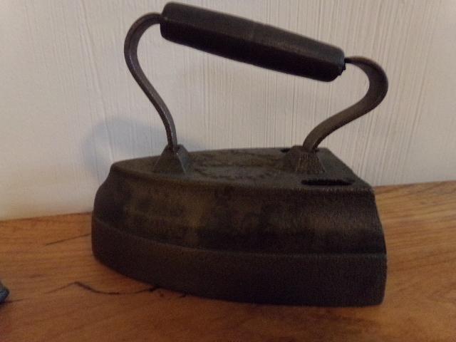 ANTIQUE W F SHAWS SAD IRON PATENT SEPT' 1, 1857 WITH HANDLE. ASBESTOS SAD IRON WITH WOODEN HANDLE.