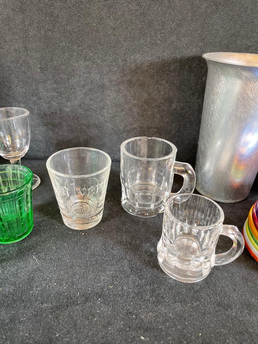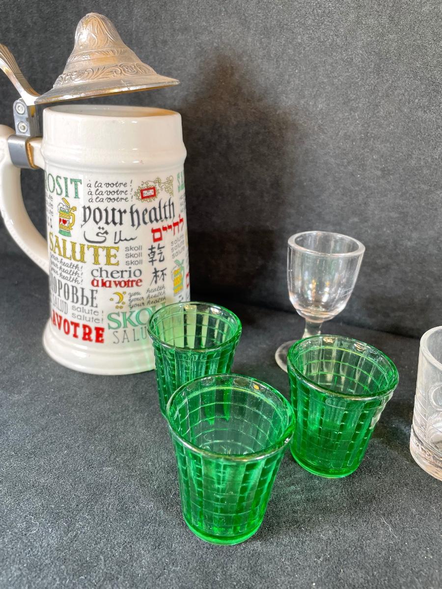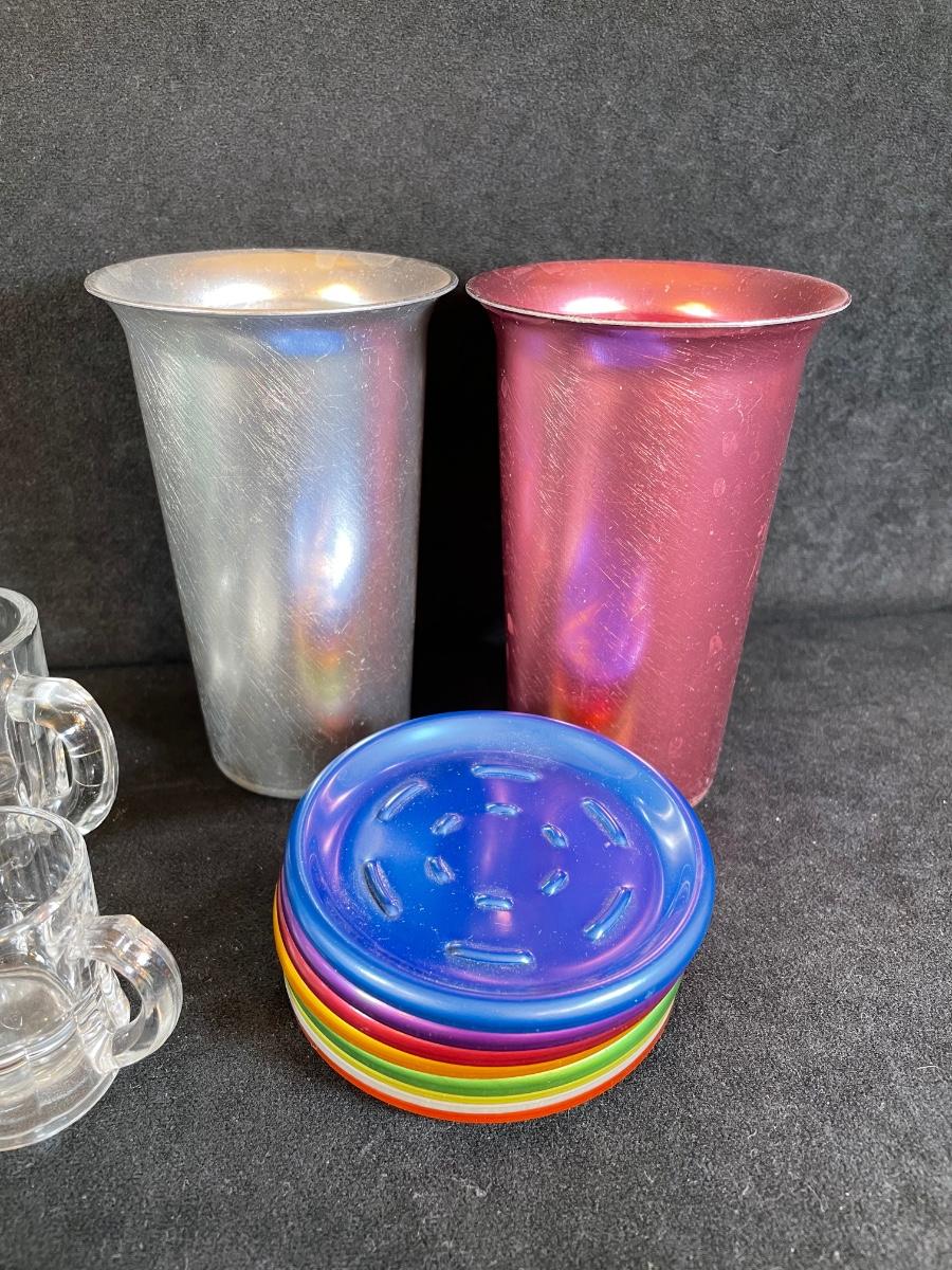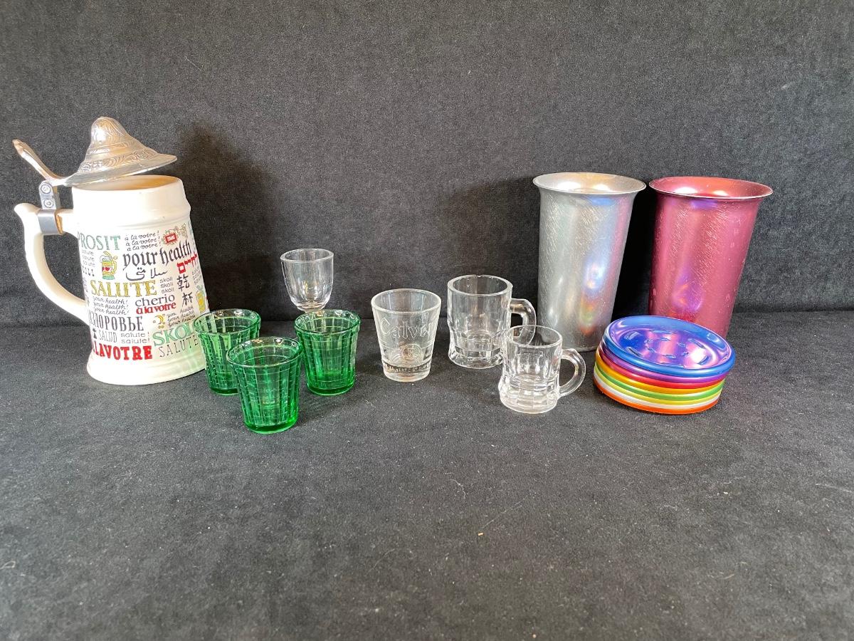 7 miniature glasses, 2 aluminum glasses, aluminum coaster set, covered stein