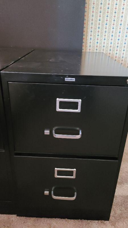 Two Office-Max filing cabinets with a 6.5 foot painted black board that made a desk with the two filing cabinets. 18x27x29 inches tall. Pictures are the best representation of the items listed and items are untested unless indicated in description. Thank you for looking and have fun bidding!