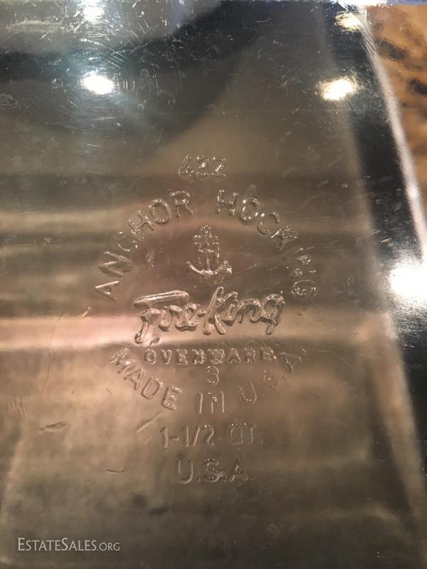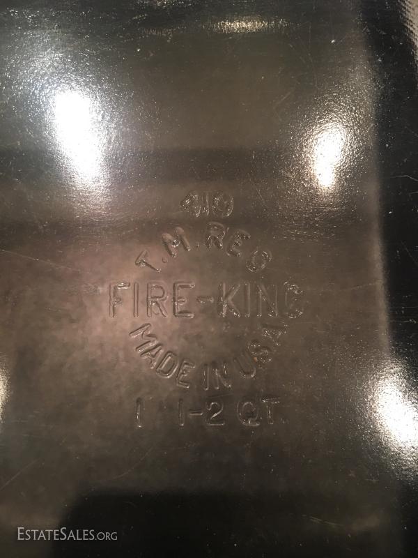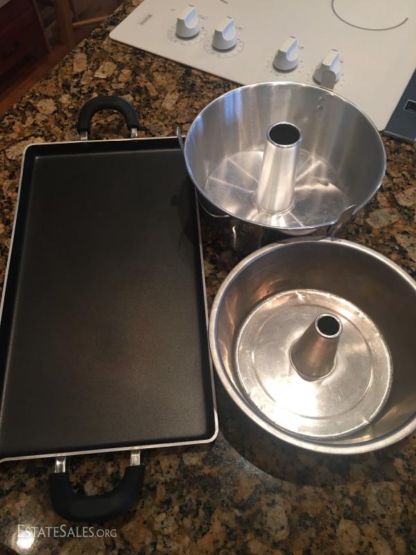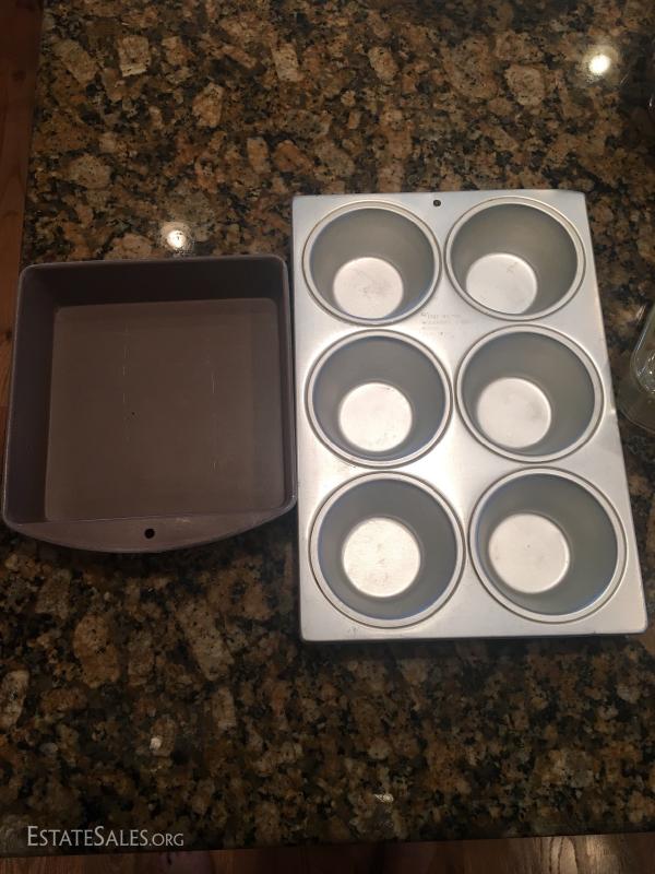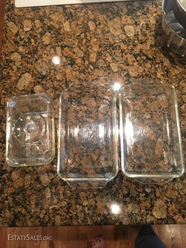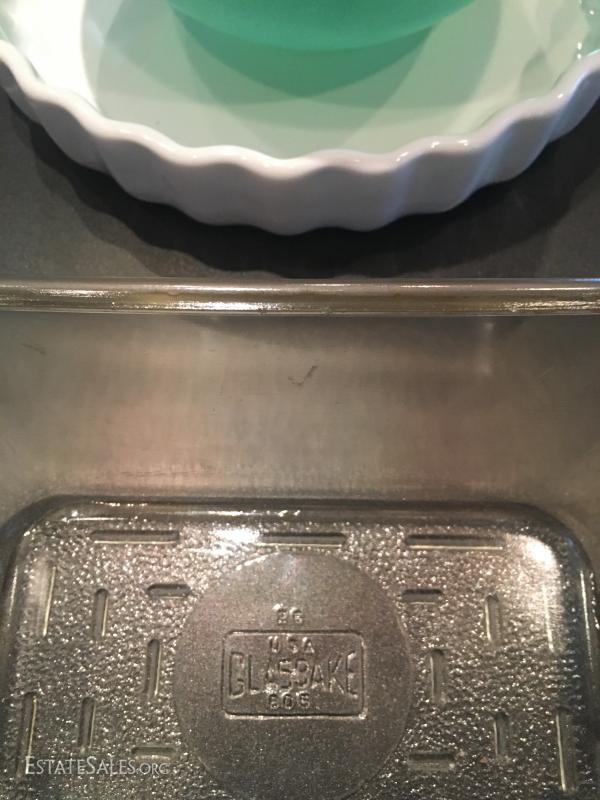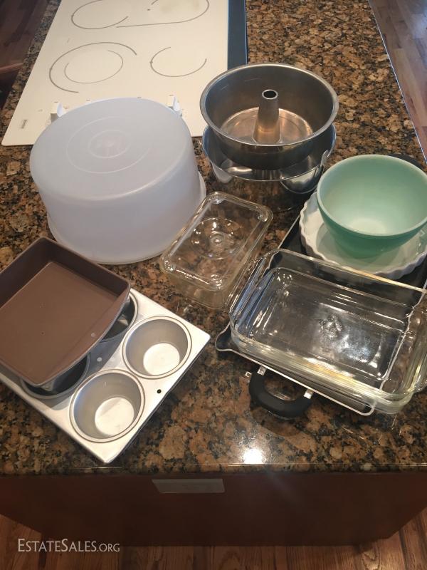Two Fire King 1 1/2 QT pans, Mirro baking pan, quiche dish, vintage green mixing bowl, bunt cake pans, traveling Tupperware cake holder, Glasbake dish with lid and much more.