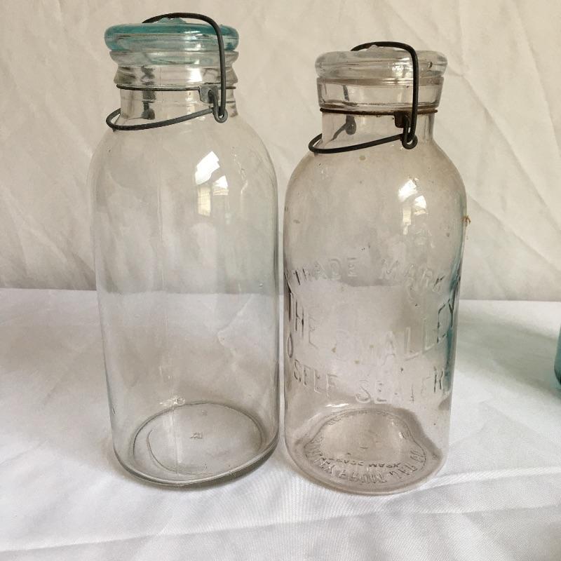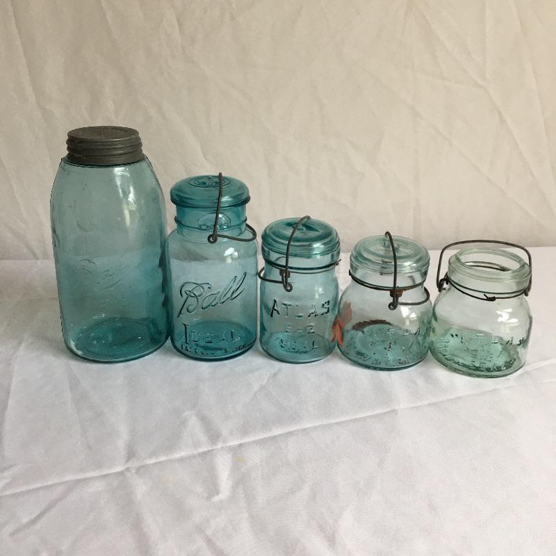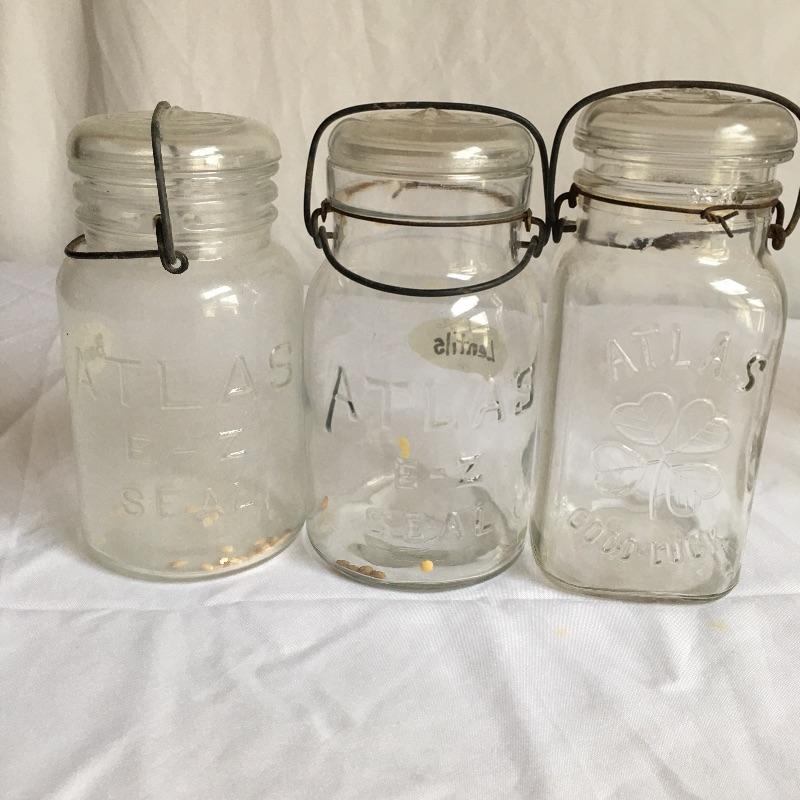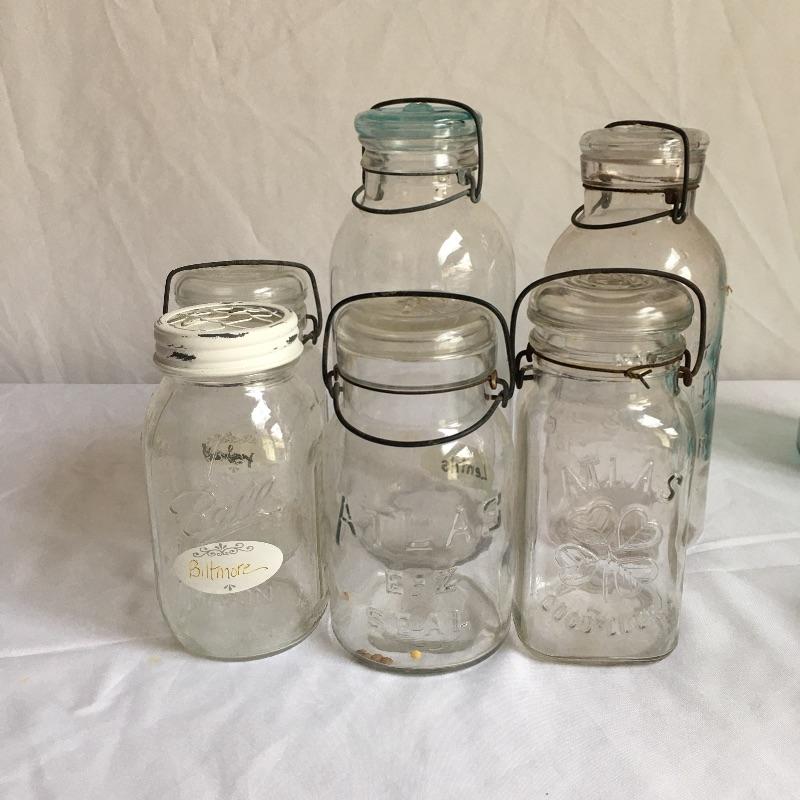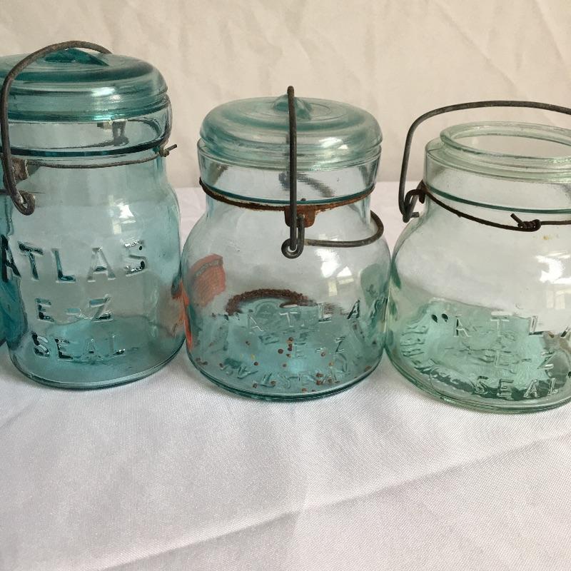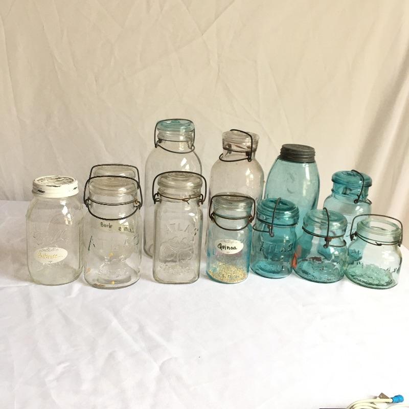 Canning jars. Lot includes three clear Atlas jars with flip top lids, three blue Atlas jars with two flip top lids, blue Ball jars one with zinc lid and one with flip top lid, clear ball jar, Smalley flip top lid jar, Lightning flip top lid and one unmarked jar with flip top lid.