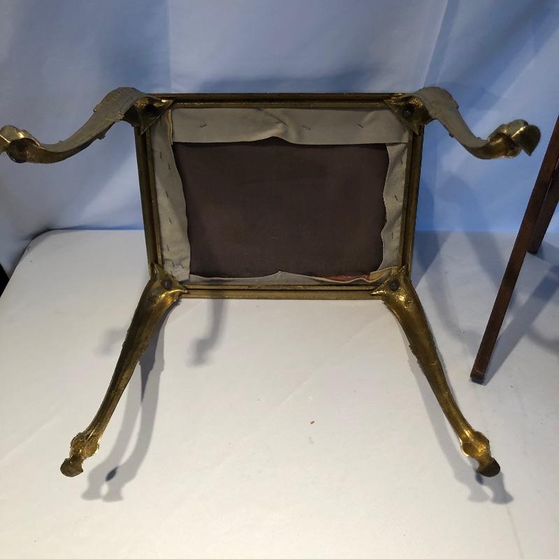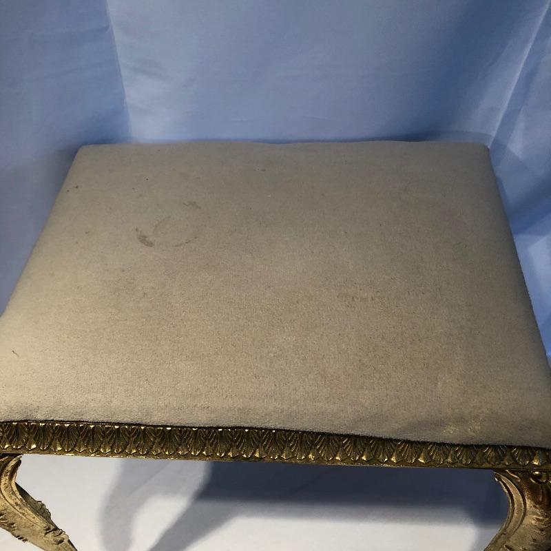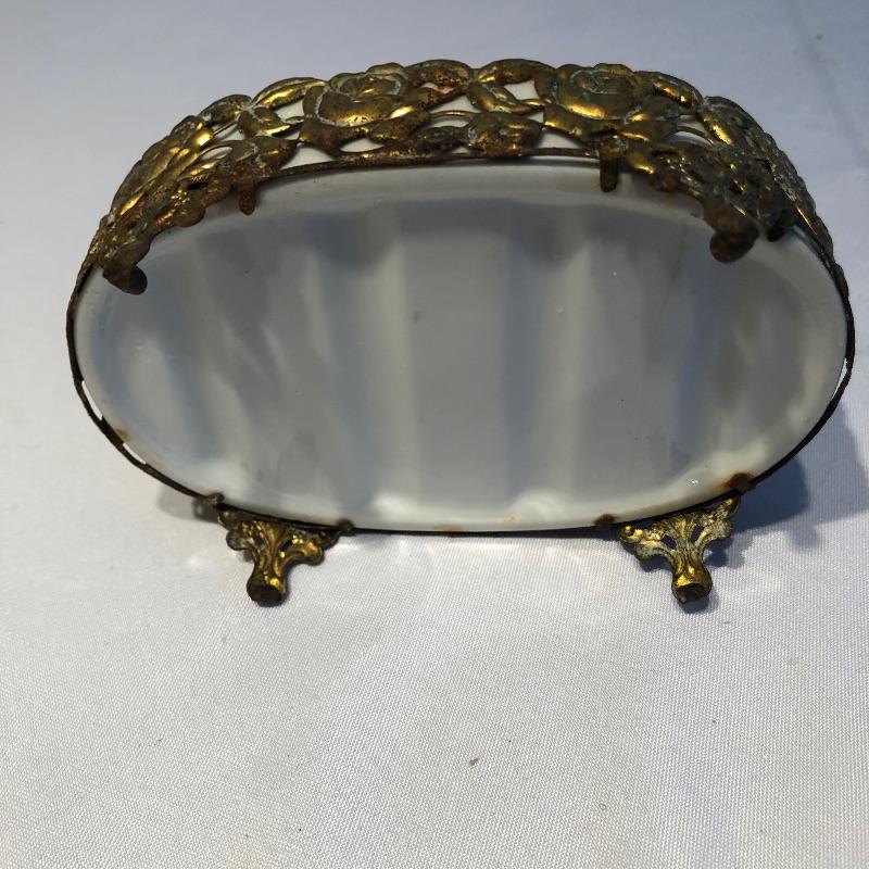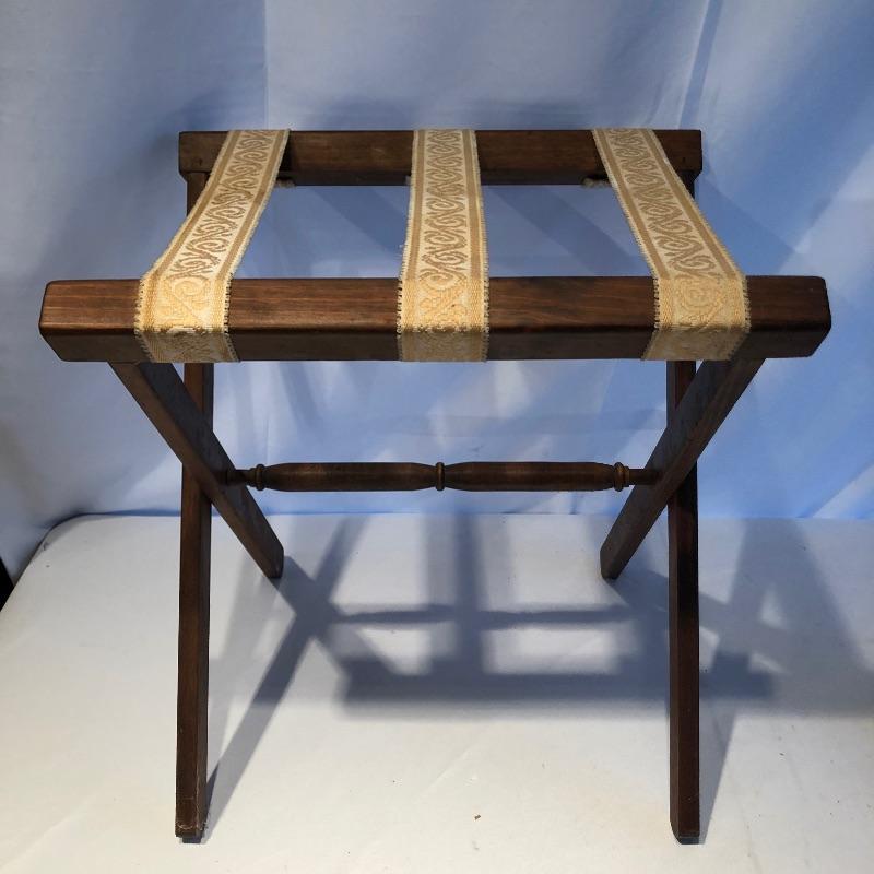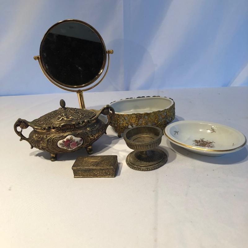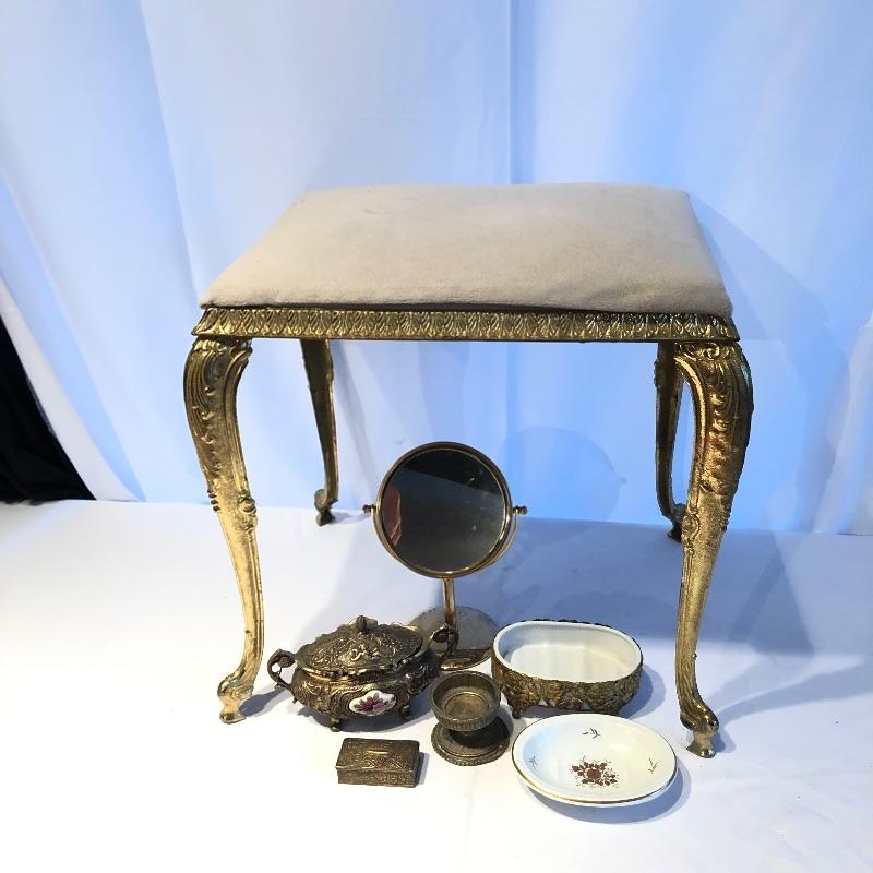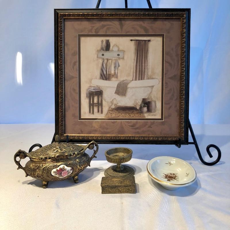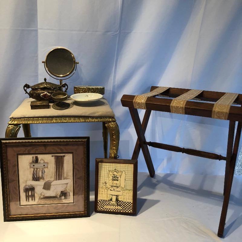 Treat yourself and your bathroom with this wonderful assortment of vanity accouterments. Included is an Italian lidded ornate metal dish that would be ideal storage for cotton balls or jewelry; it is an aged brass color with an exquisite china embellishment of pink roses in its center. Two more aged brass colored items include a small lidded trinket box and a small pedestal dish. The white and gold soap dish is hand painted China. A vanity mirror and a footed dish complete the smaller items in this lot, see images for signs of age on the stand of the mirror. Two art pieces include a signed Carol Robinson framed print and a wooden hanging plaque. Also included is a wood with gold accented straps, luggage stand and a gorgeous gold colored metal vanity stool with a dark cream upholstered seat; this is a stunning stool but it does have a few stains in the upholstery that could possibly come clean with a good scrub.