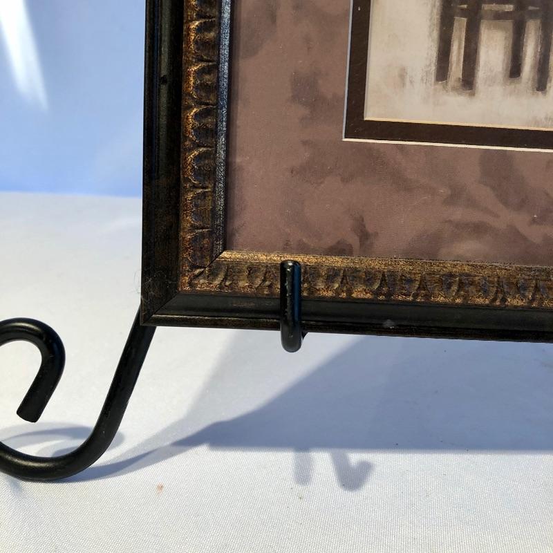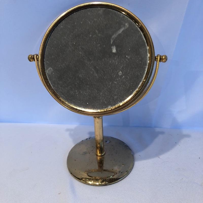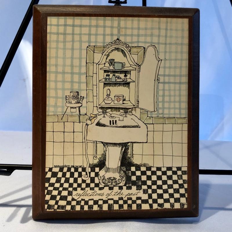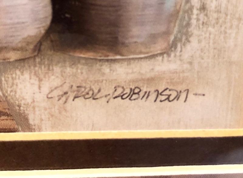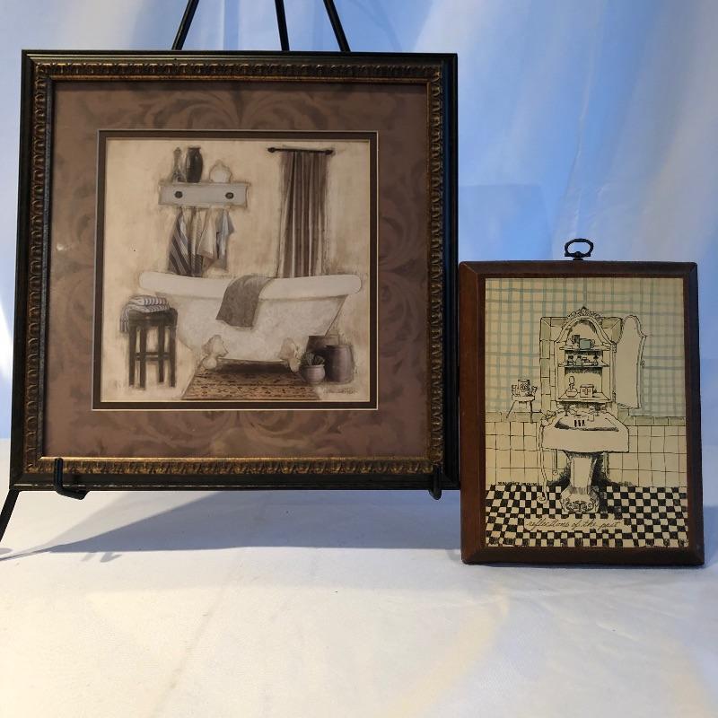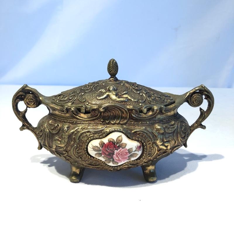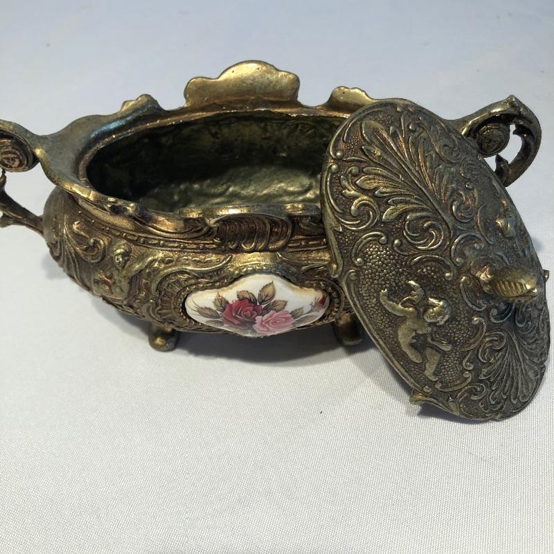 Treat yourself and your bathroom with this wonderful assortment of vanity accouterments. Included is an Italian lidded ornate metal dish that would be ideal storage for cotton balls or jewelry; it is an aged brass color with an exquisite china embellishment of pink roses in its center. Two more aged brass colored items include a small lidded trinket box and a small pedestal dish. The white and gold soap dish is hand painted China. A vanity mirror and a footed dish complete the smaller items in this lot, see images for signs of age on the stand of the mirror. Two art pieces include a signed Carol Robinson framed print and a wooden hanging plaque. Also included is a wood with gold accented straps, luggage stand and a gorgeous gold colored metal vanity stool with a dark cream upholstered seat; this is a stunning stool but it does have a few stains in the upholstery that could possibly come clean with a good scrub.