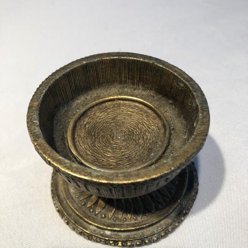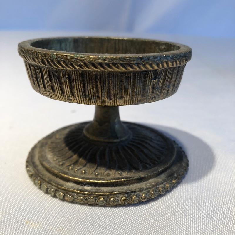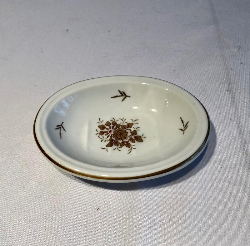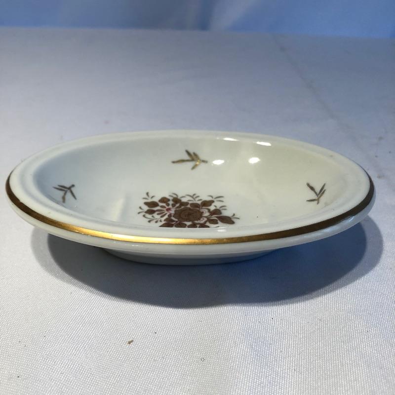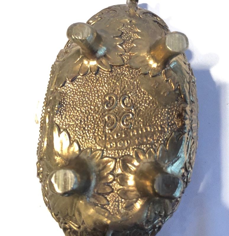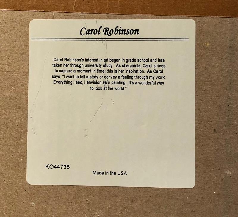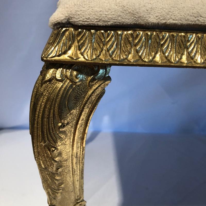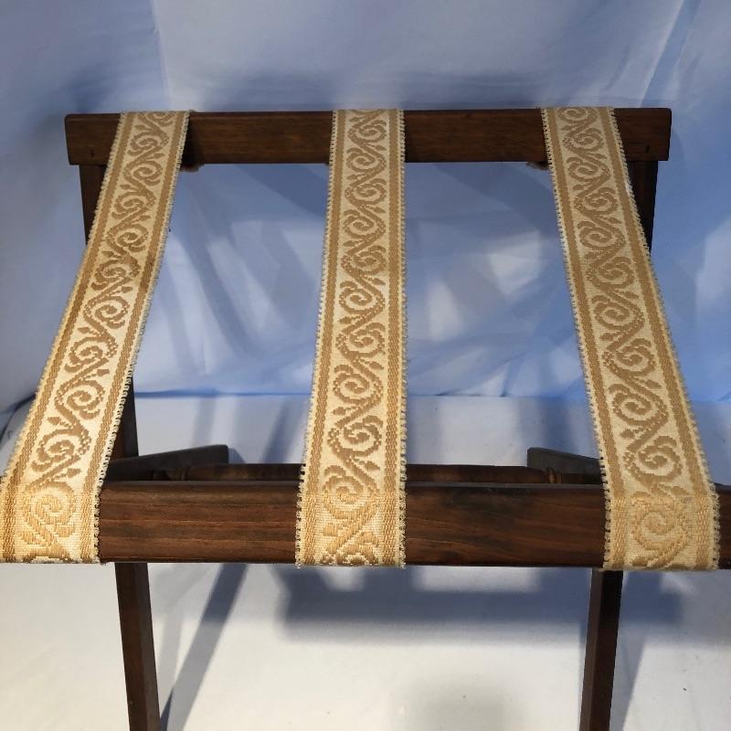 Treat yourself and your bathroom with this wonderful assortment of vanity accouterments. Included is an Italian lidded ornate metal dish that would be ideal storage for cotton balls or jewelry; it is an aged brass color with an exquisite china embellishment of pink roses in its center. Two more aged brass colored items include a small lidded trinket box and a small pedestal dish. The white and gold soap dish is hand painted China. A vanity mirror and a footed dish complete the smaller items in this lot, see images for signs of age on the stand of the mirror. Two art pieces include a signed Carol Robinson framed print and a wooden hanging plaque. Also included is a wood with gold accented straps, luggage stand and a gorgeous gold colored metal vanity stool with a dark cream upholstered seat; this is a stunning stool but it does have a few stains in the upholstery that could possibly come clean with a good scrub.