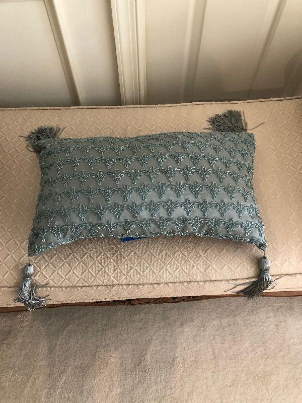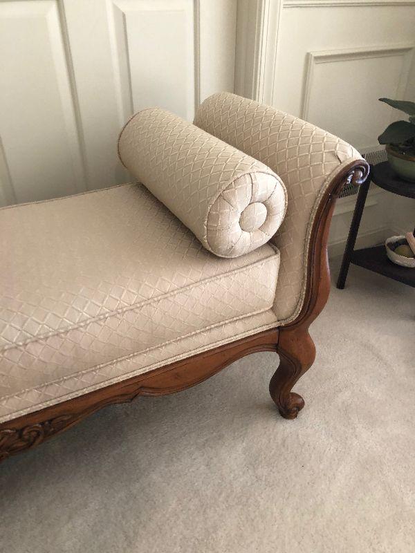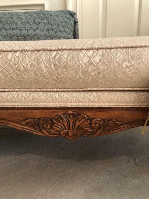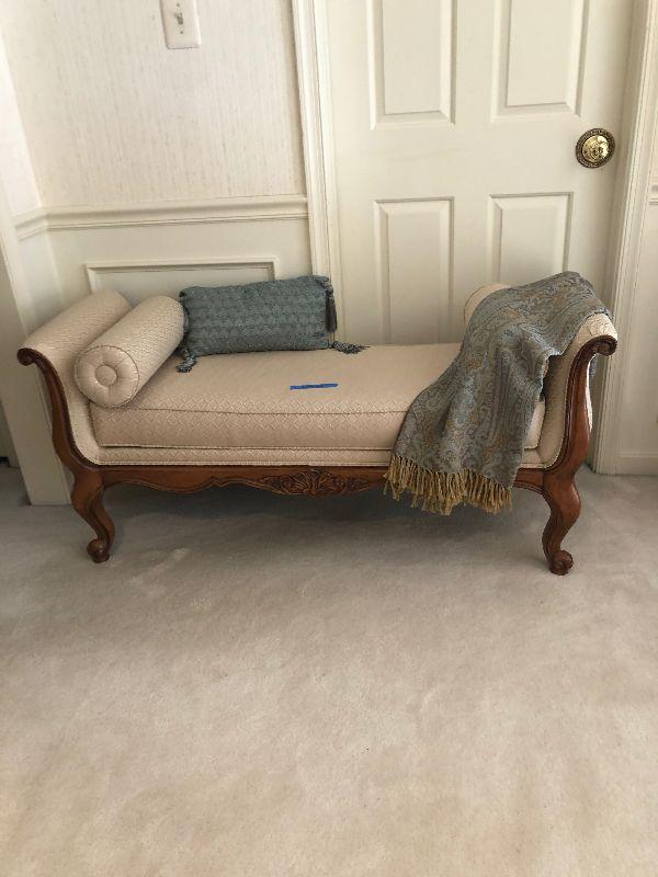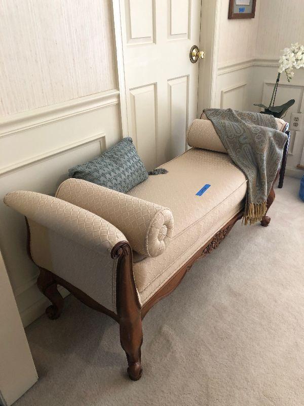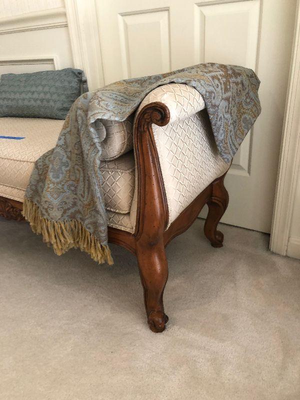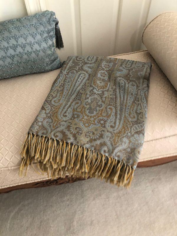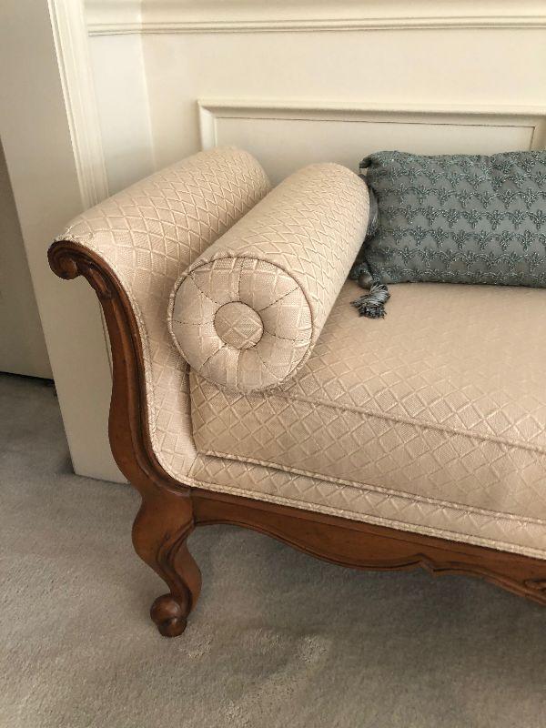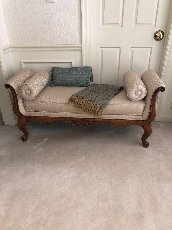 Upholstered End-of-Bed Bench with Accent Pillow and Coordinating Shawl.