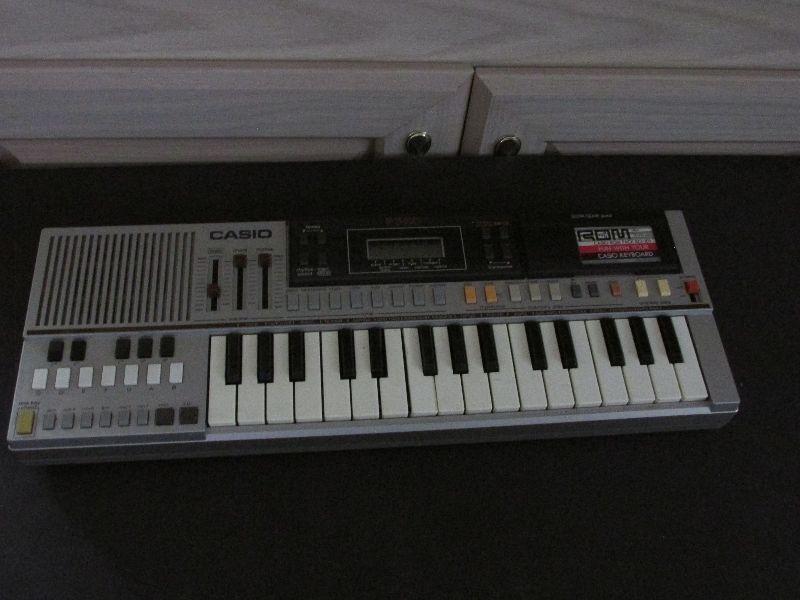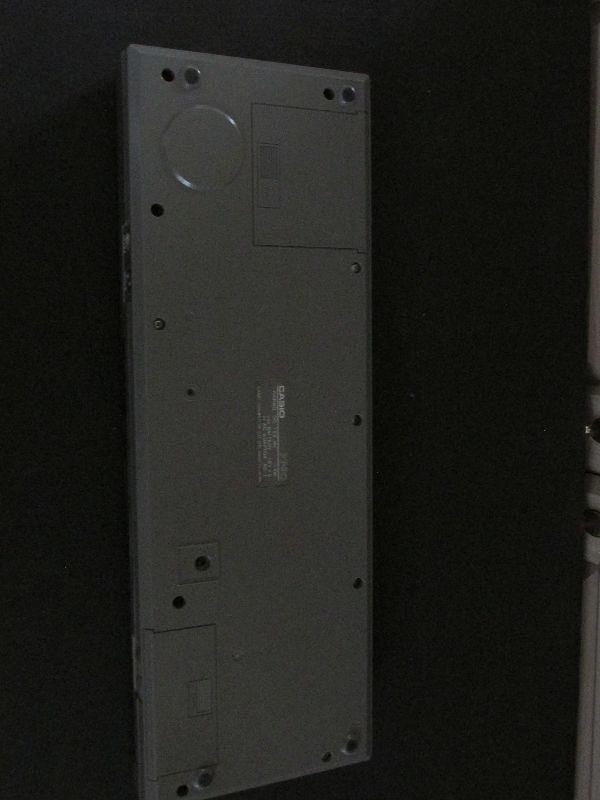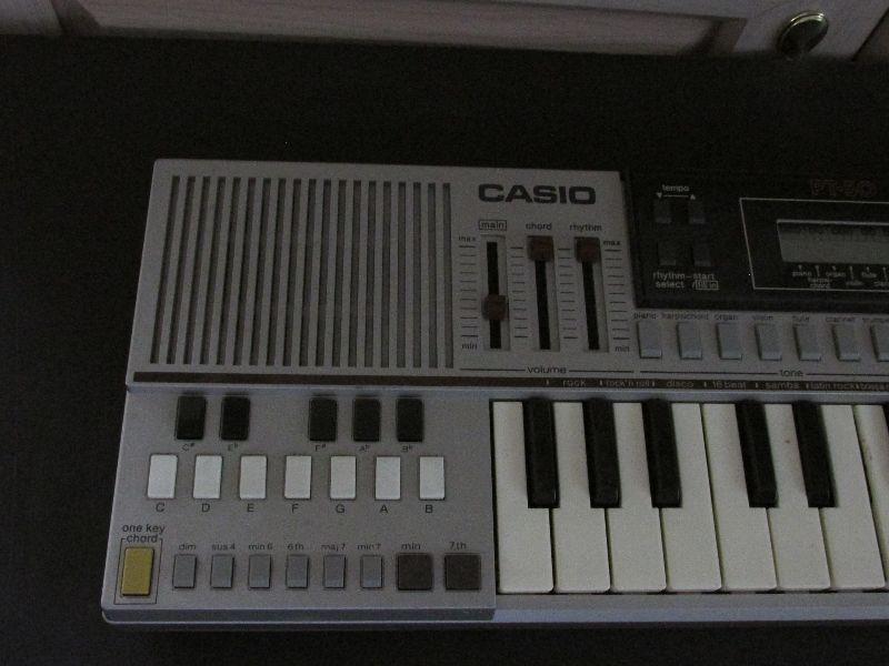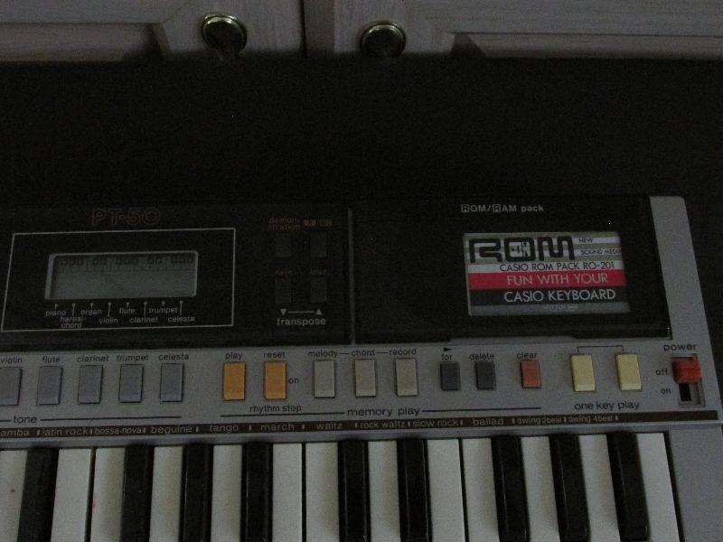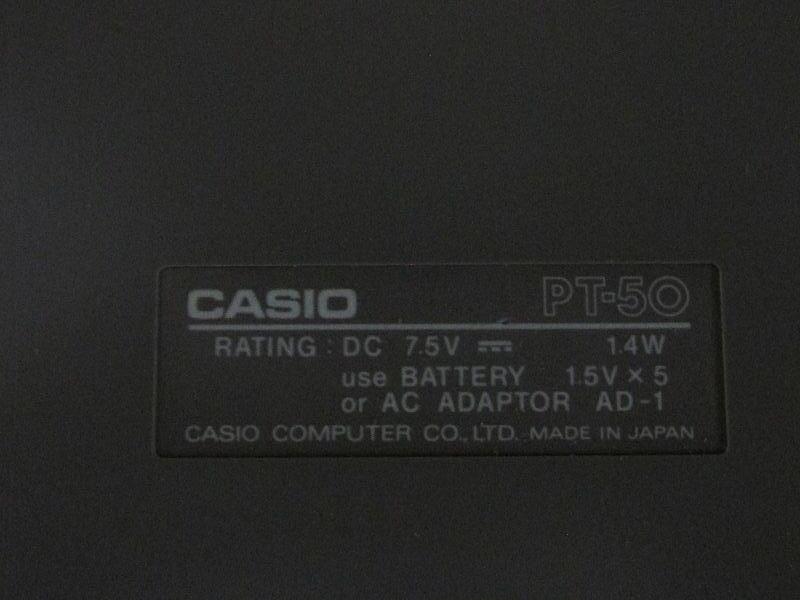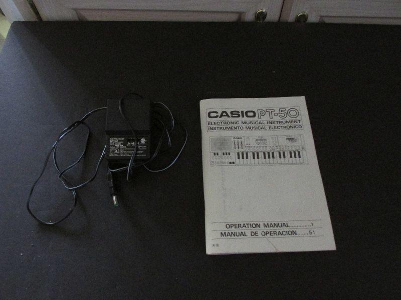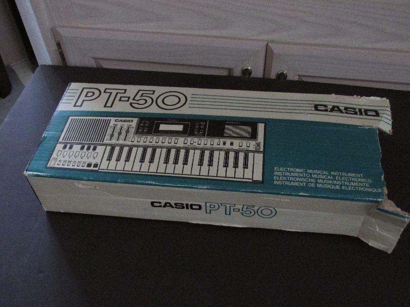 Casio PT-50 Electric keyboard. Uses batteries or adapter. Adapter and manual included. Batteries not included. The box is in bad condition but the rest is in decent condition, minor wear and tear from age. Everything works but one key does get stuck occasionally.