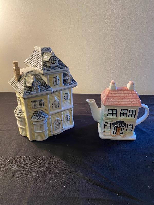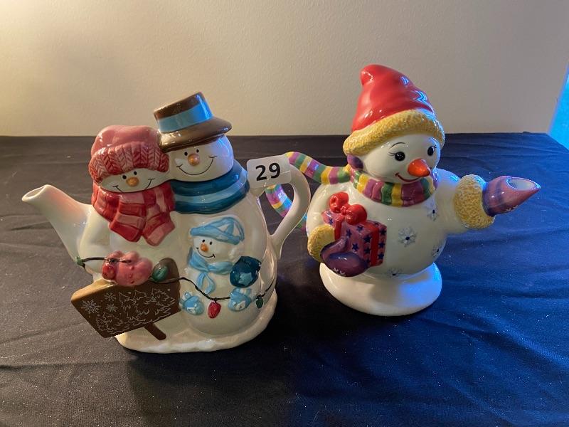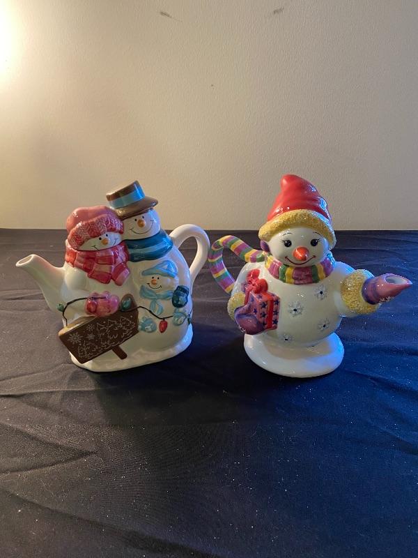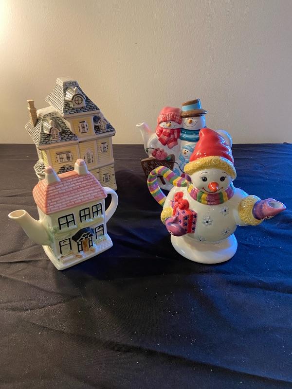 2 Snowman teapots, house cookie jar, and house teapot