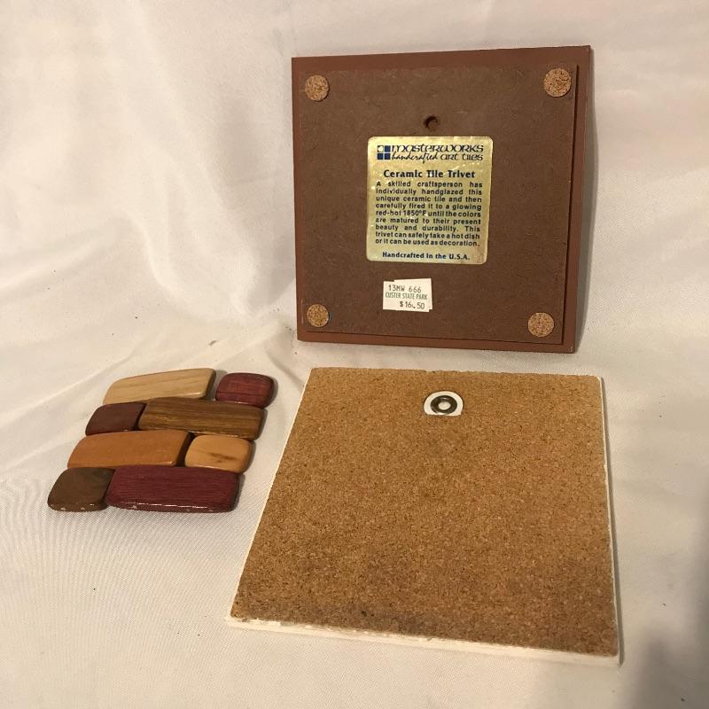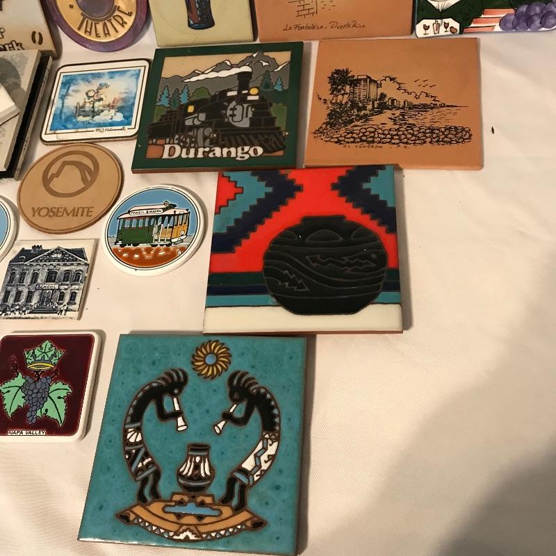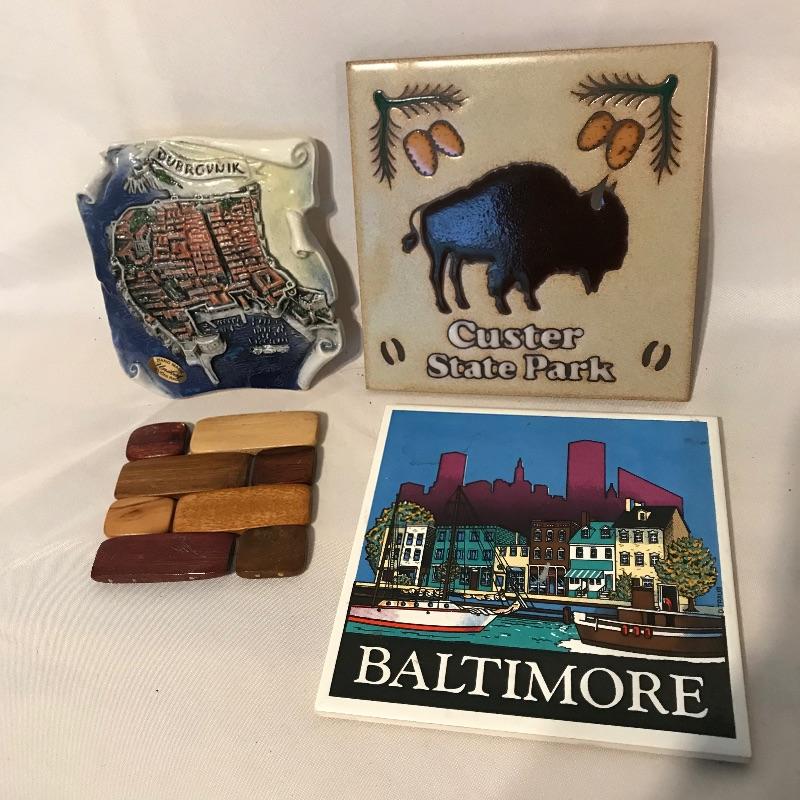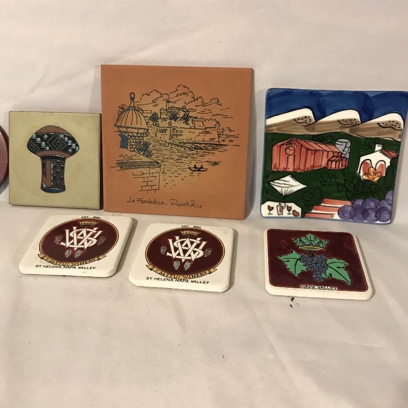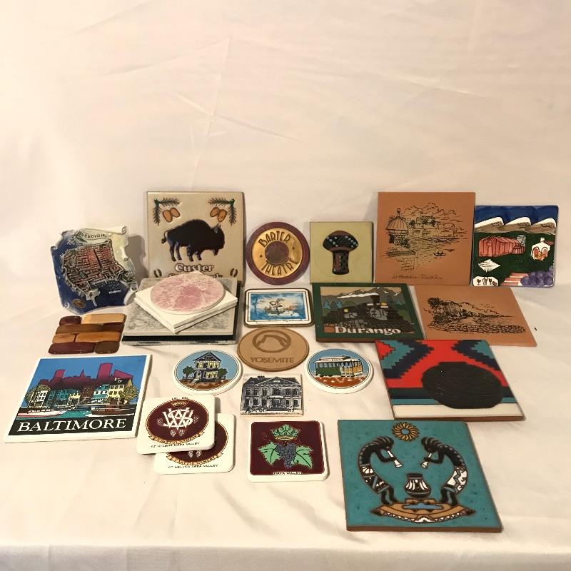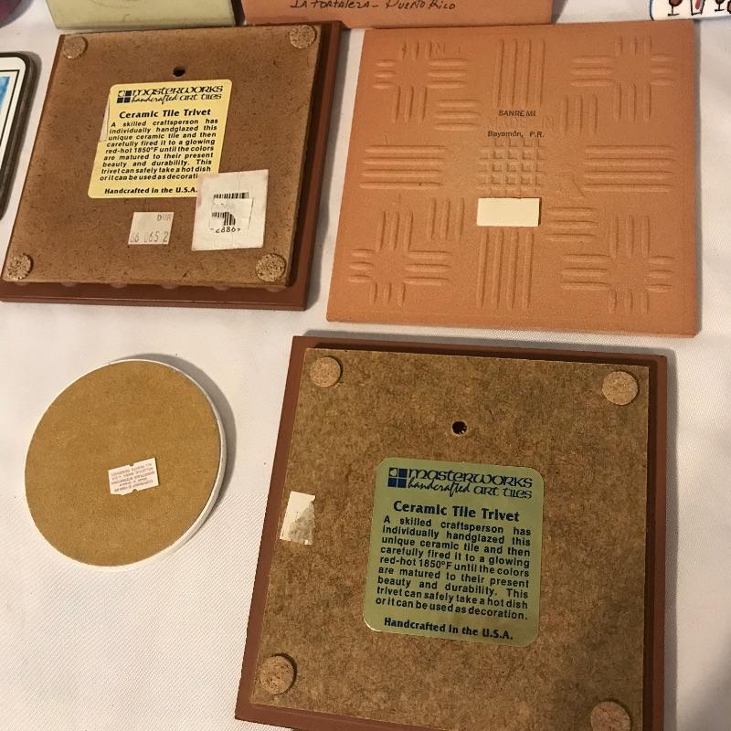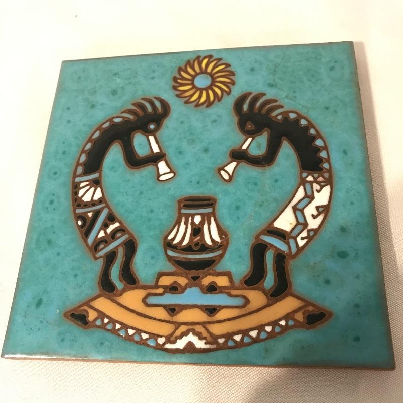 Neat collection from across the globe! These pieces of art are made from ceramic, wood, and leather, just to name a few. Some are ready to display on a wall while others are ready for your beverages and hot dishes. The Kokopelli is about 5.75”sq. See photos. Shipping available.