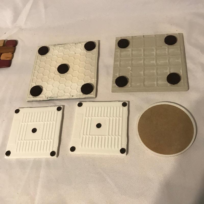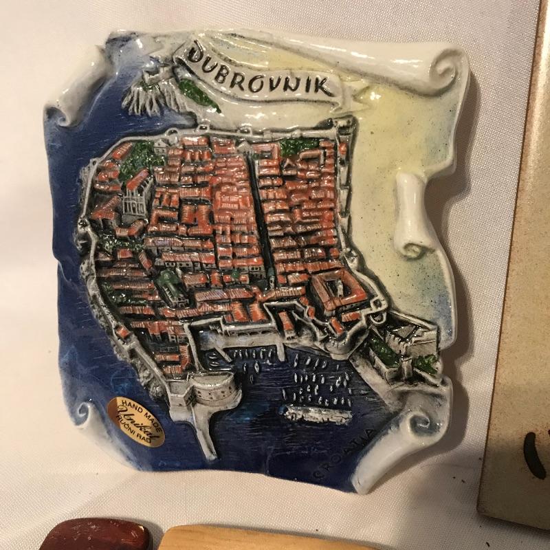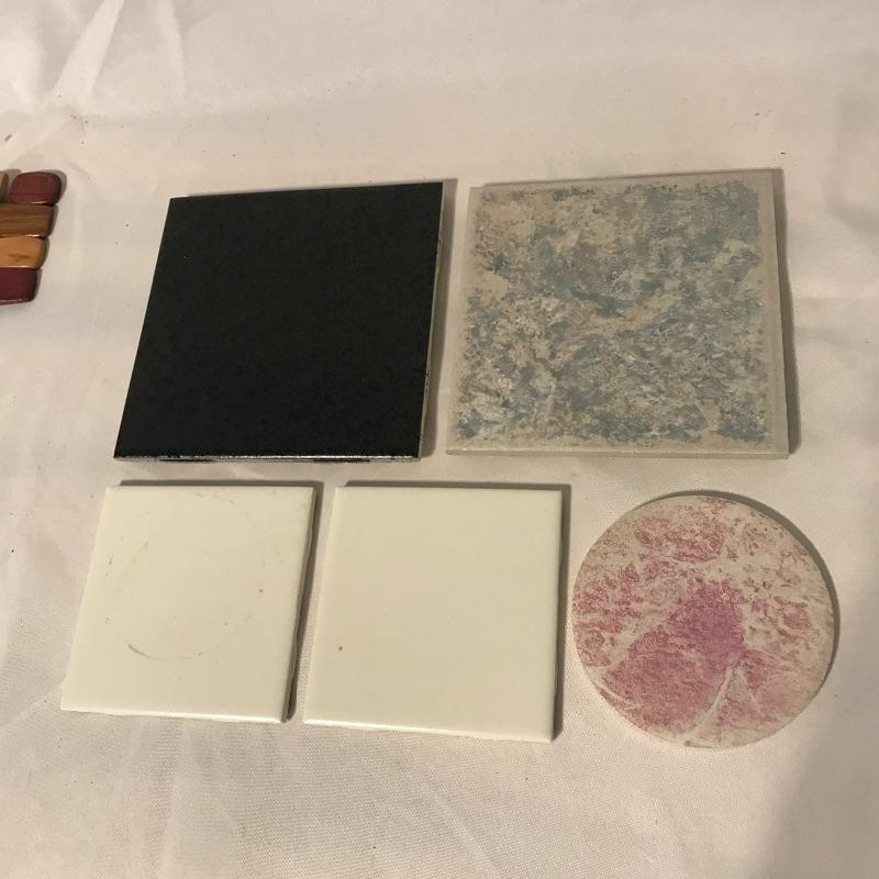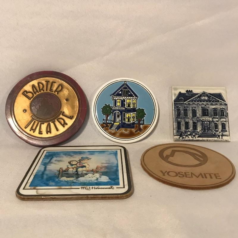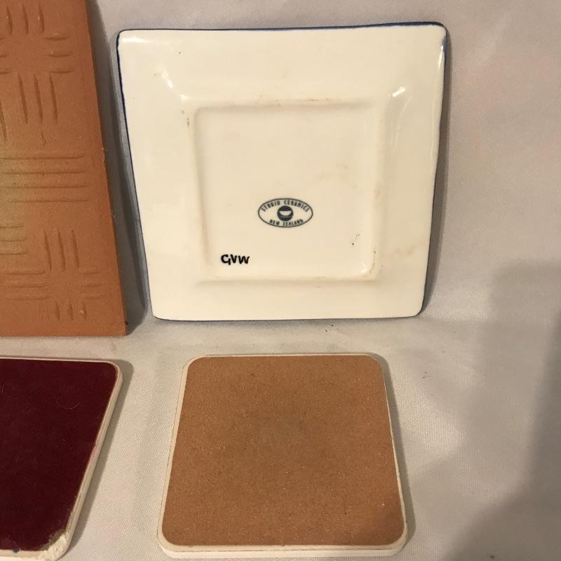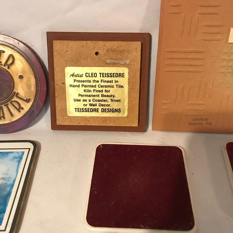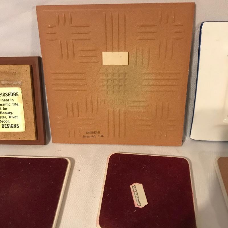 Neat collection from across the globe! These pieces of art are made from ceramic, wood, and leather, just to name a few. Some are ready to display on a wall while others are ready for your beverages and hot dishes. The Kokopelli is about 5.75”sq. See photos. Shipping available.