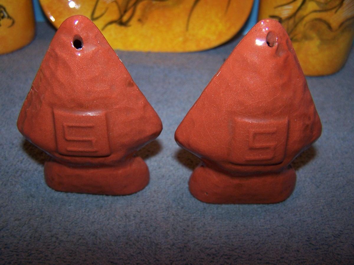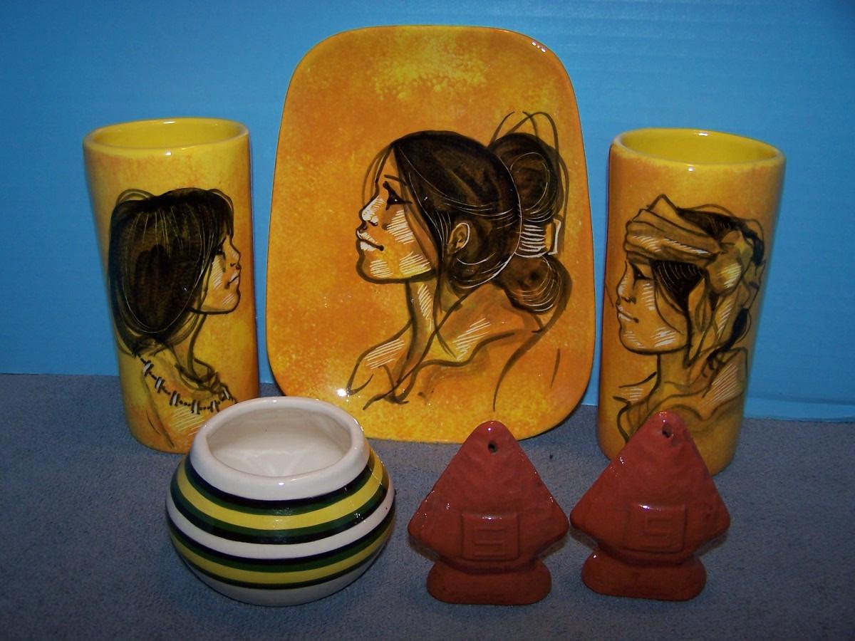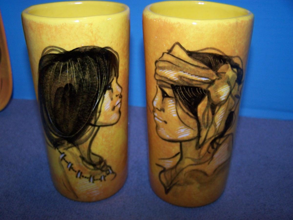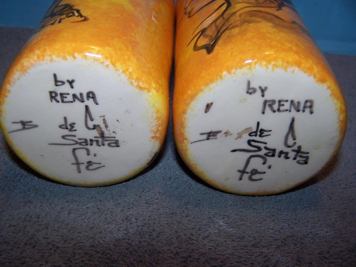 WONDERFUL COLLECTIBLE NATIVE AMERICAN POTTERY.... THE 3 YELLOW PIECES ARE RENA, SANTA FE, THE 2 TUMBLER/VASES ARE 6'' TALL...ALL PIECES ARE MARKED. SLIGHT WEAR, EXCELLENT CONDITION....