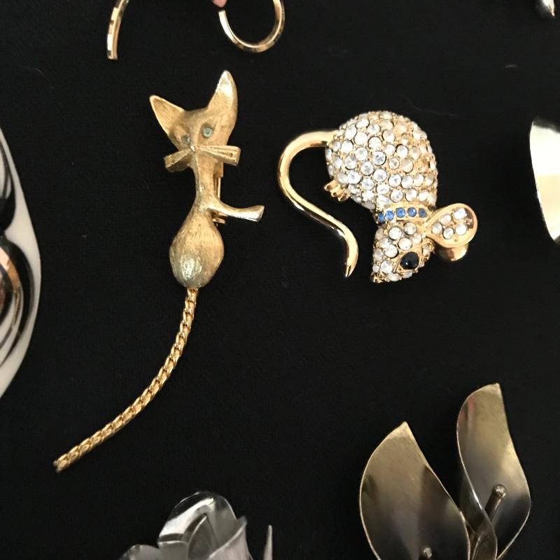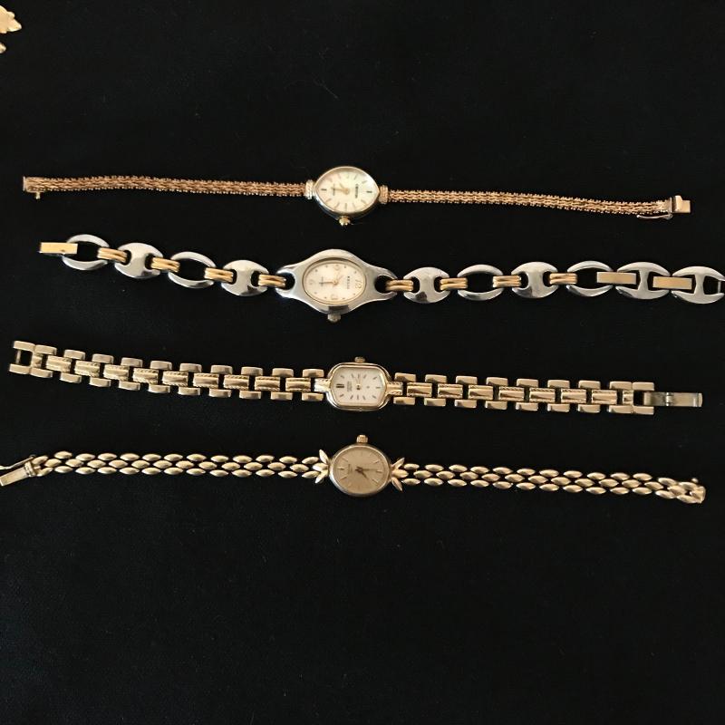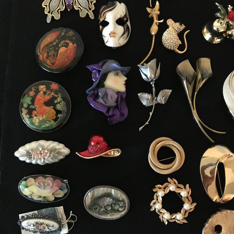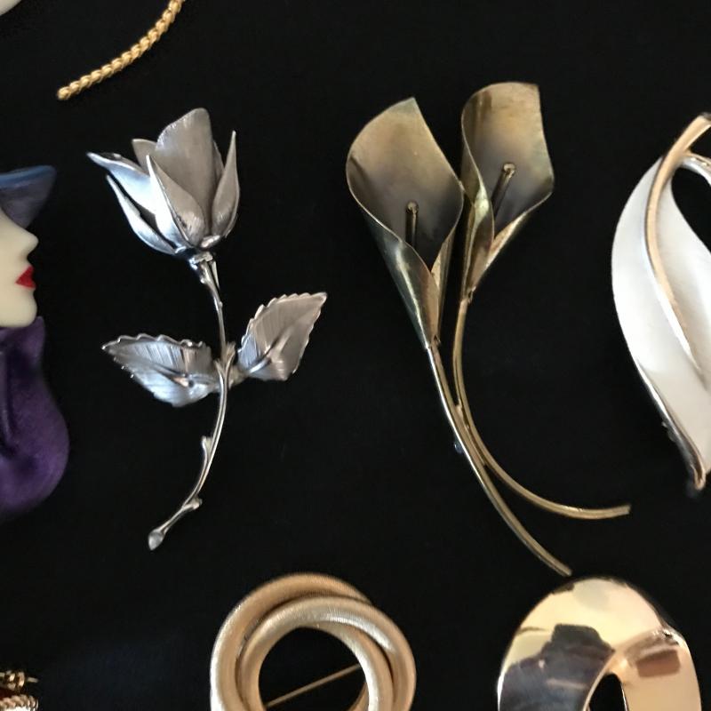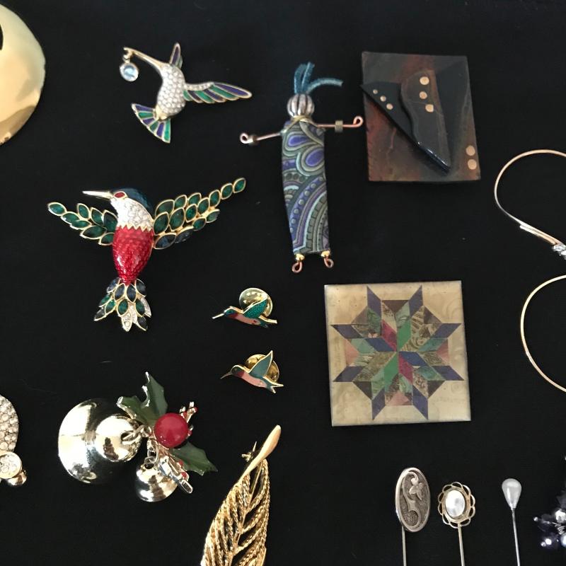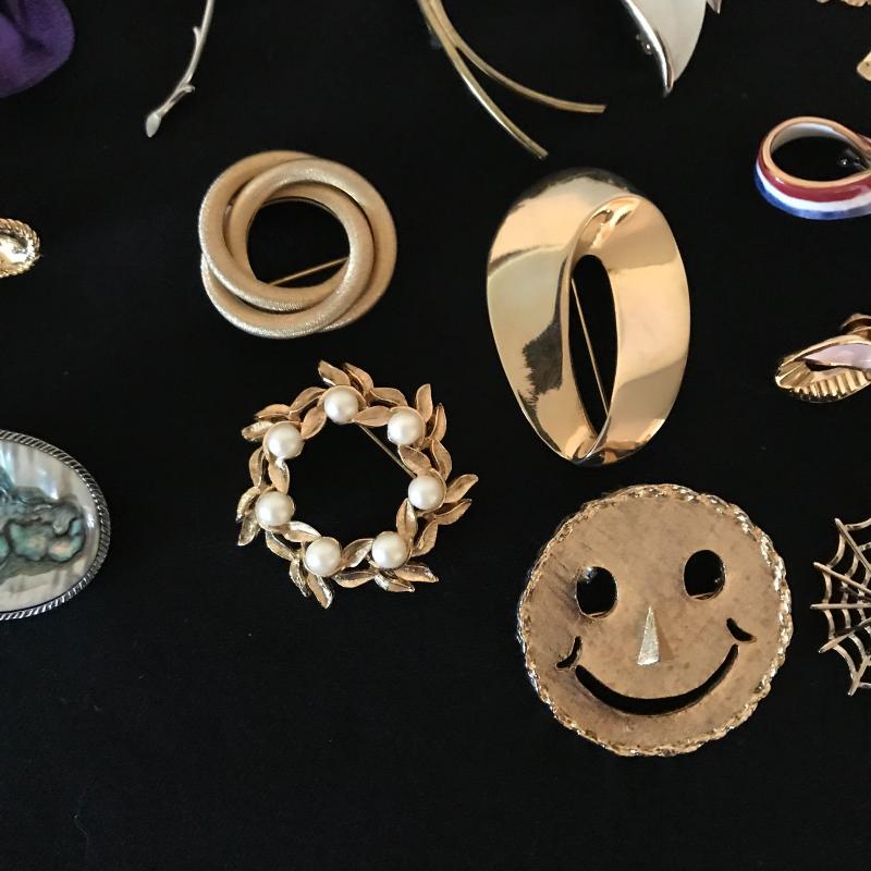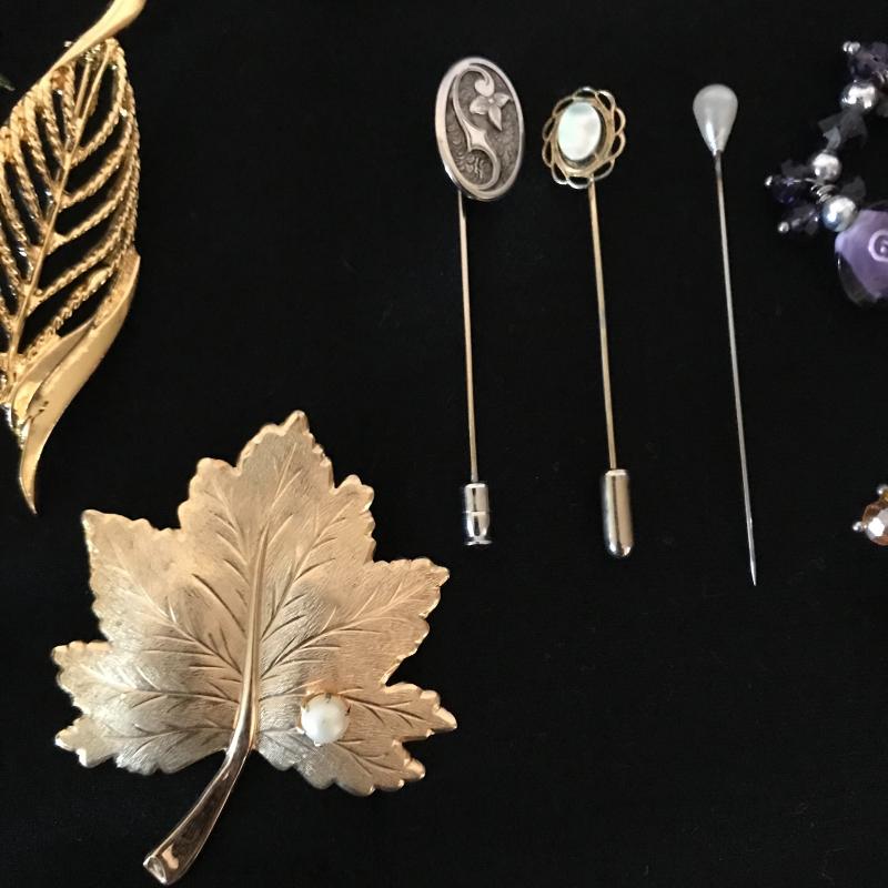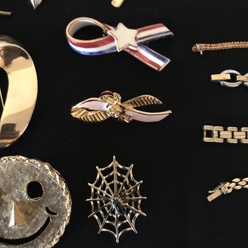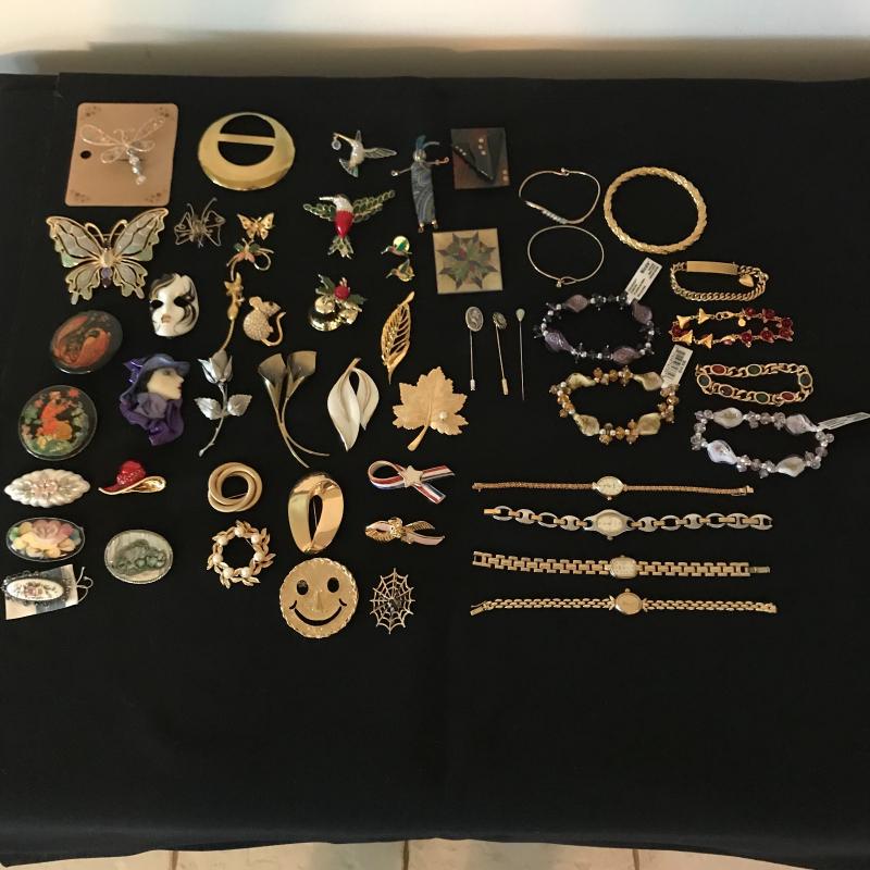 Add to your style with this large collection of pins, from butterflies to masks. Bracelets range from delicate to bold with one inscribed “Dottie”. Watches include Croton Quartz, Relic Folio, Pulsar Quartz and Citizen Elegance. The Pulsar is missing back panel and appears to have a scratch on the front glass. Metal material was not identified. See and enlarge photos for details and lot inventory. Shipping available.