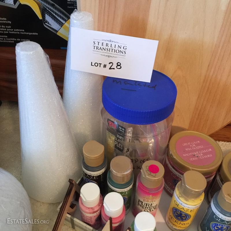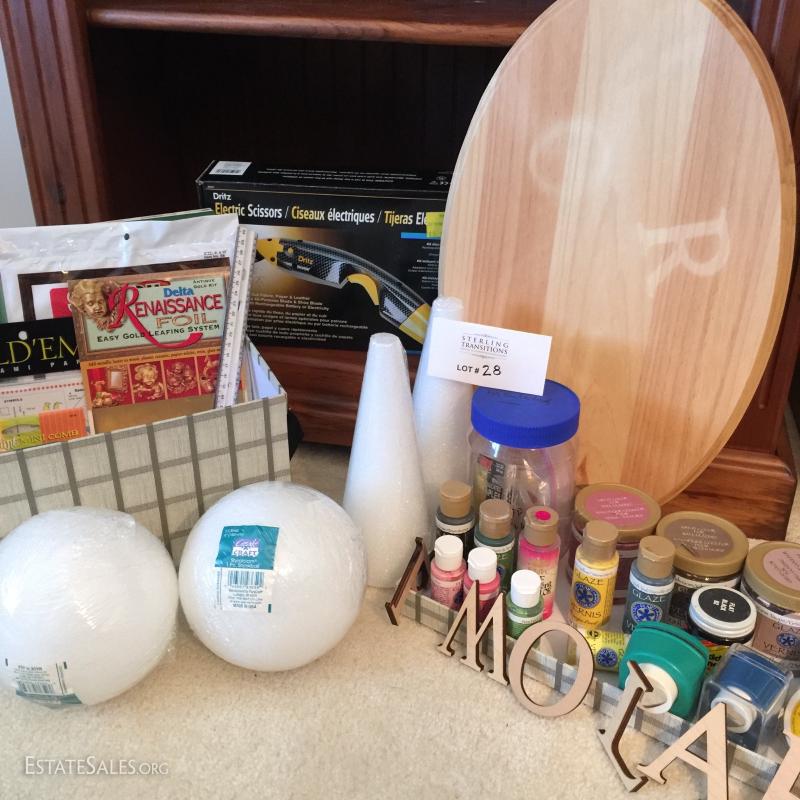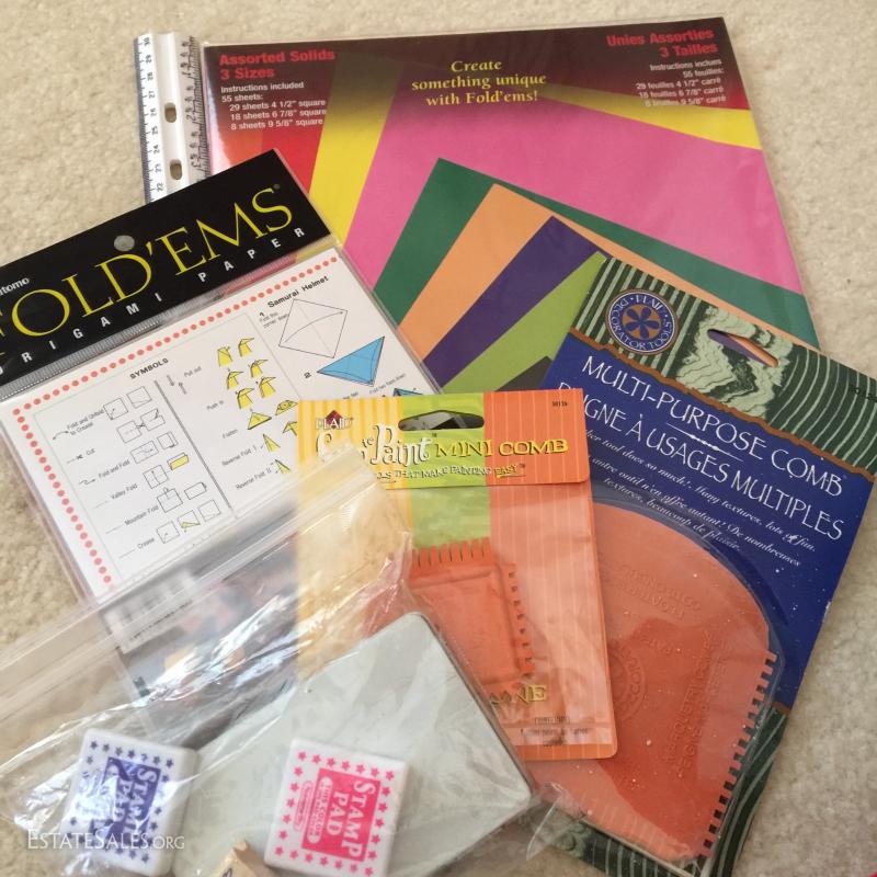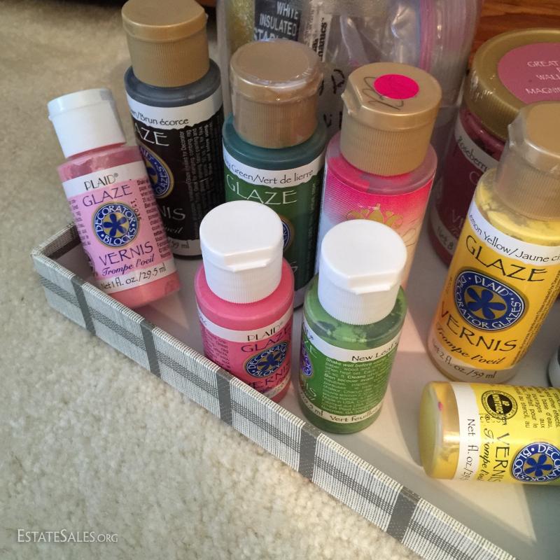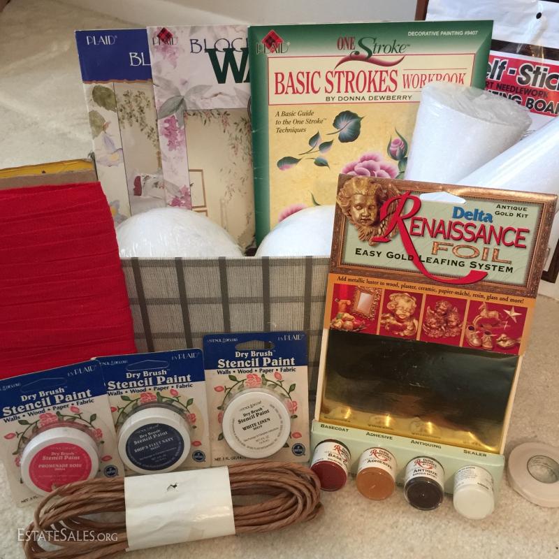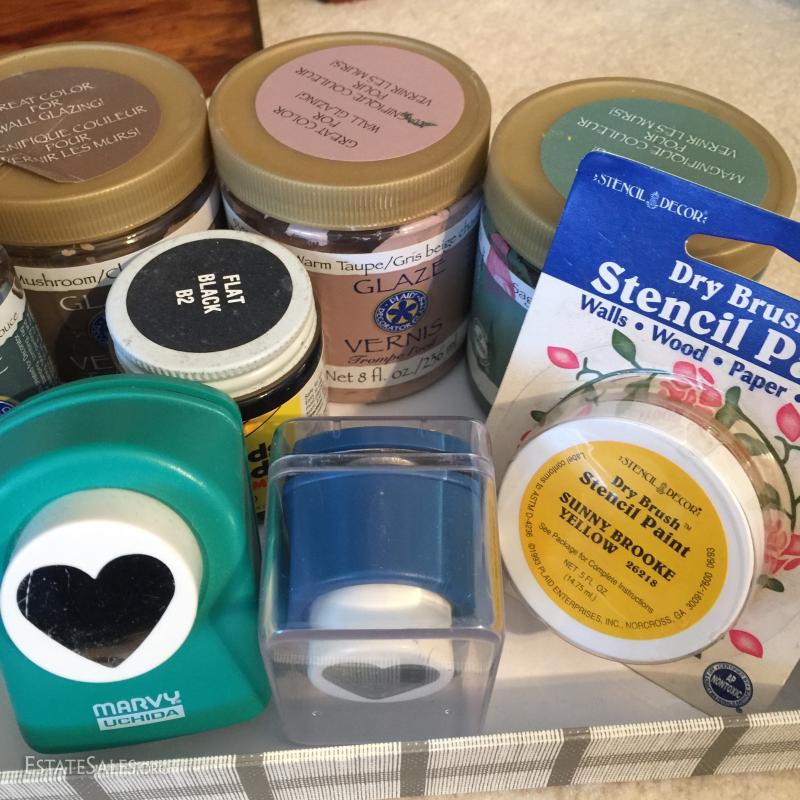 Various crafting supplies: multiple glazes/paints. Dritz electric scissors, foil stencil paint, multiple workbooks, Origami paper, stamps, multi purpose combs and much more.