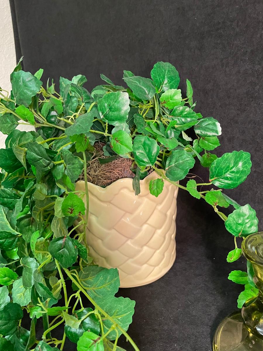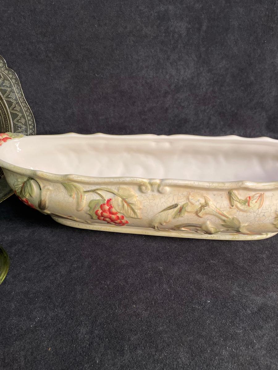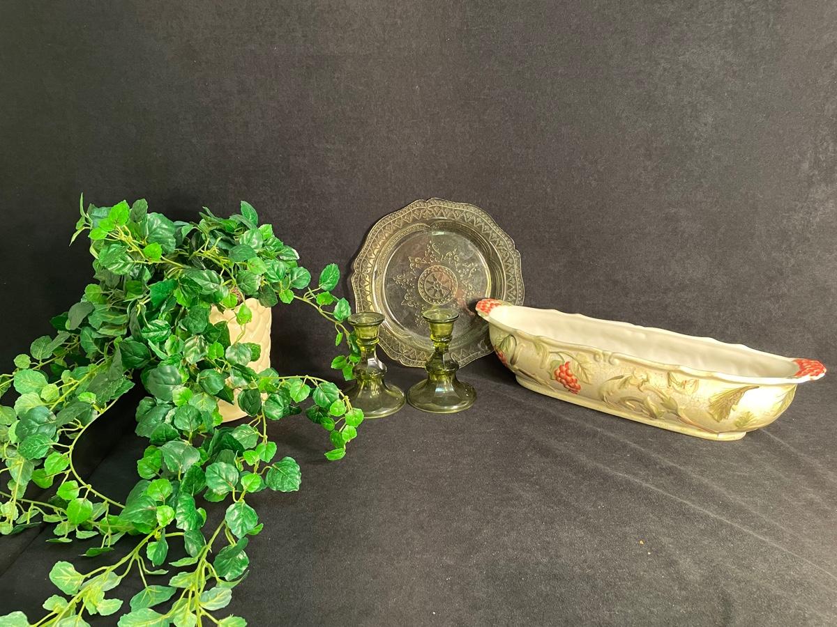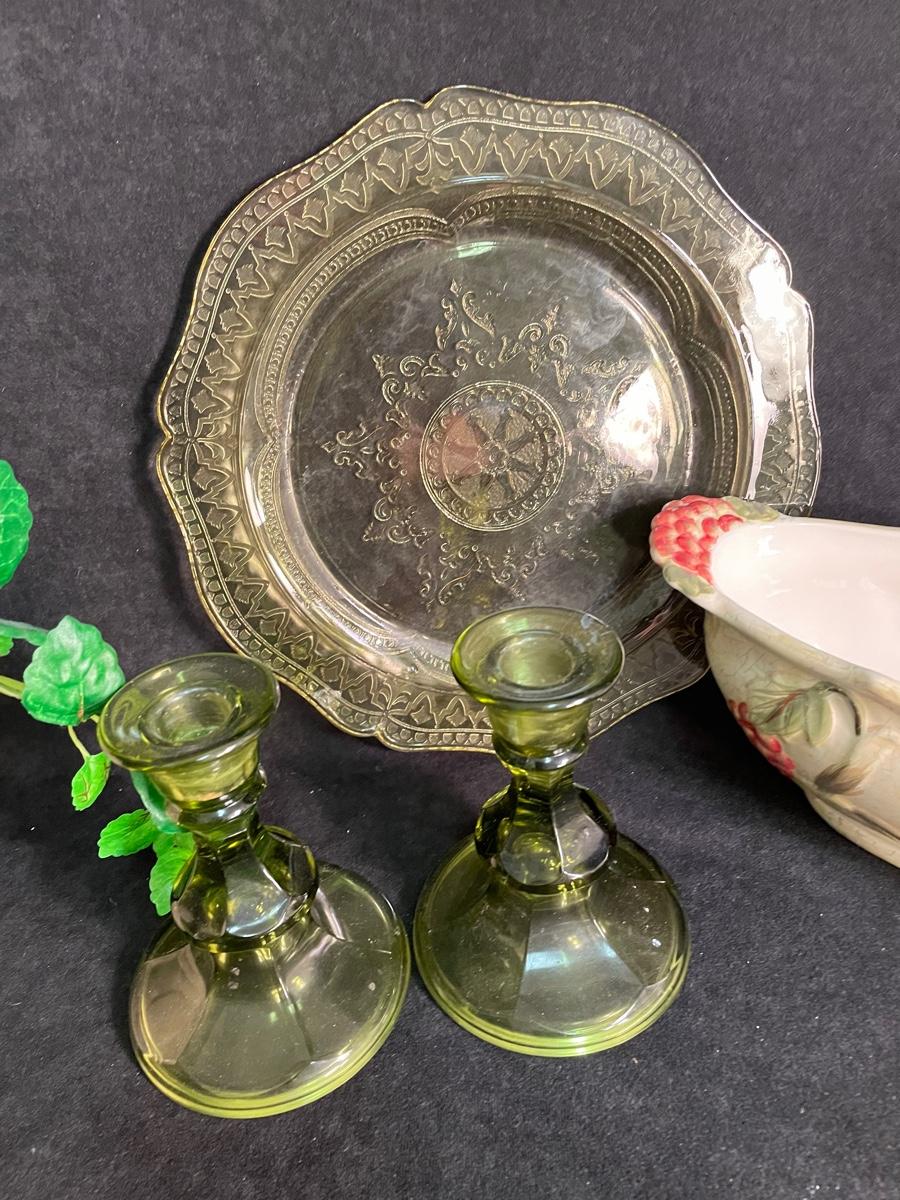 Pressed glass plate, ceramic "boat dish", pair of green glass candle holders and a silk plant in a pale yellow basketweave patterned planter