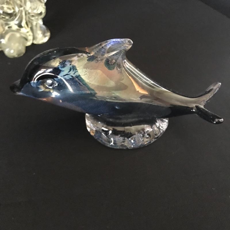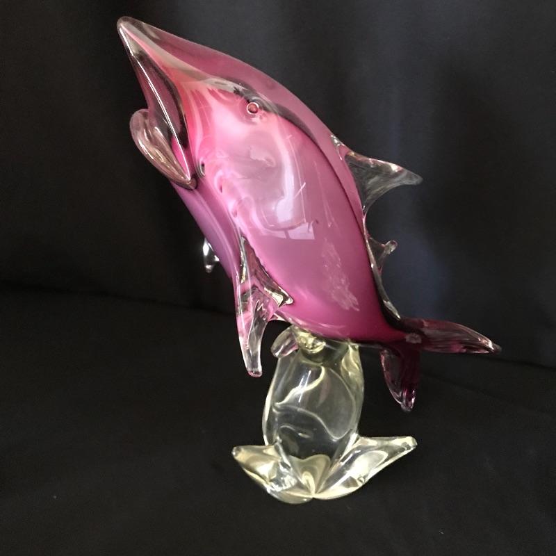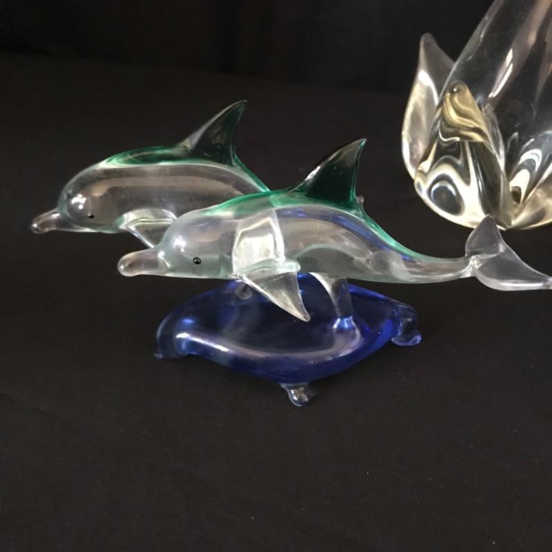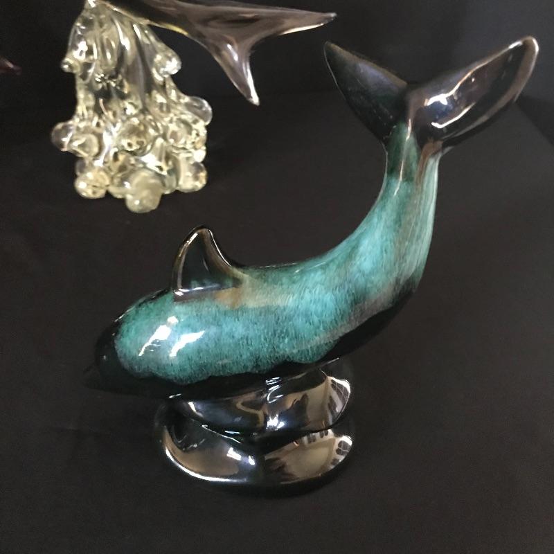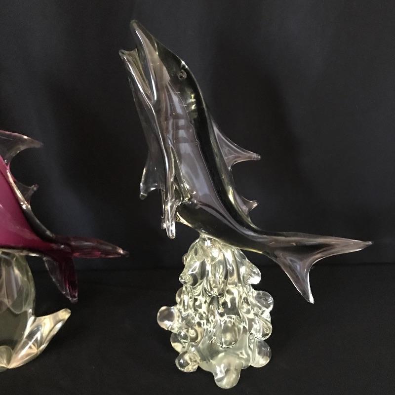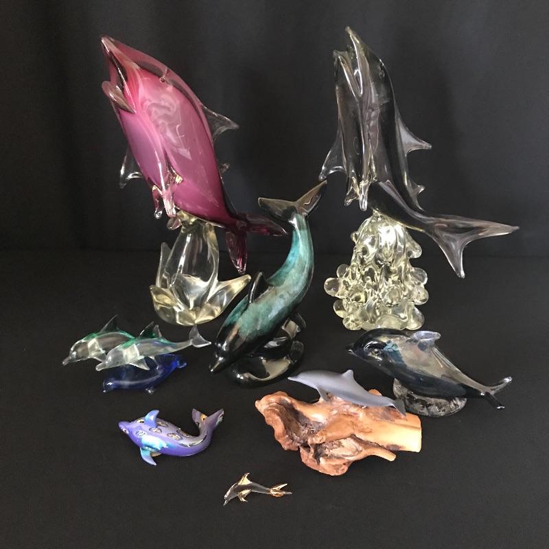 This playful lot includes eight dolphin statues/figurines. Five are made of glass, one is ceramic, and two are made of an unknown composite. No signatures that we could find. Tallest glass piece stands approx. 13.5” tall. See pics. Shipping available.