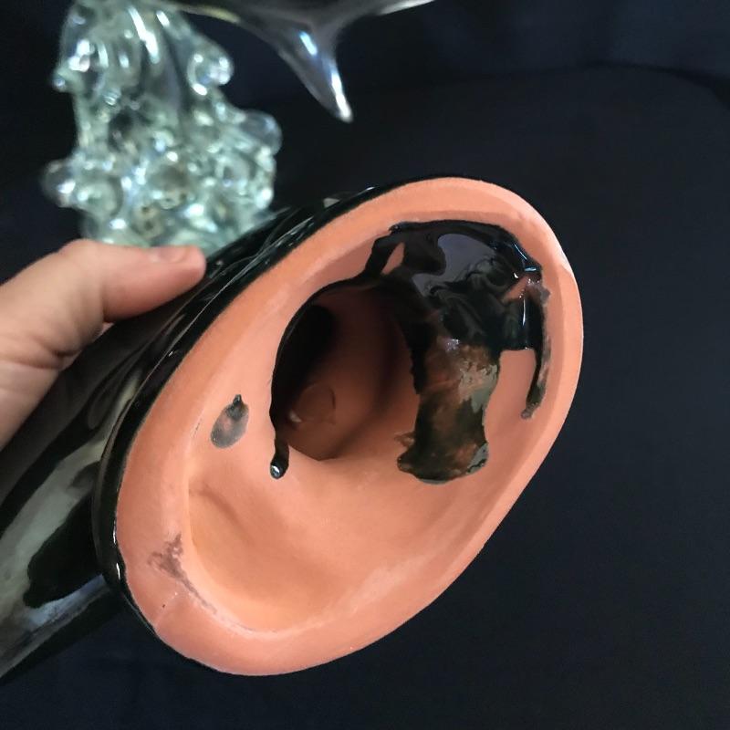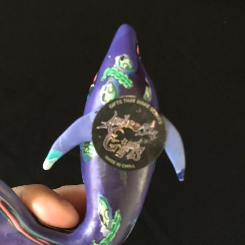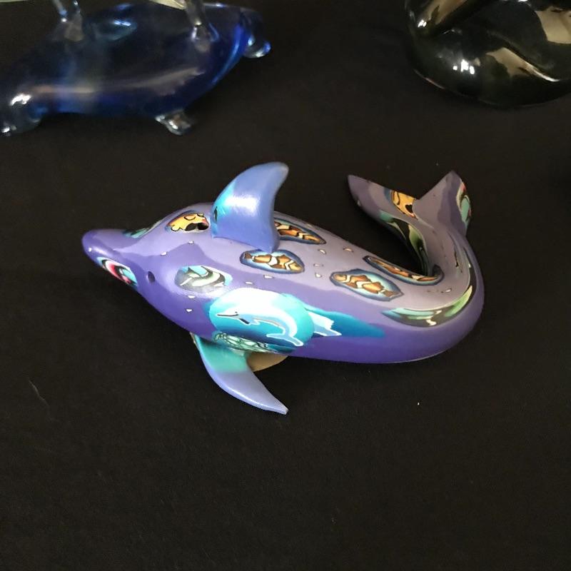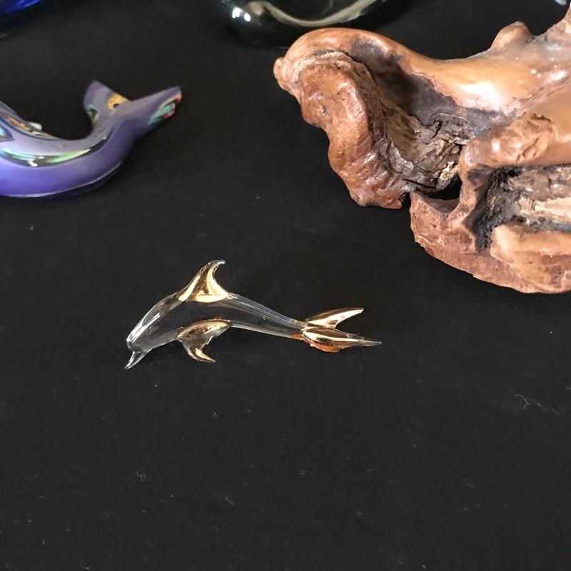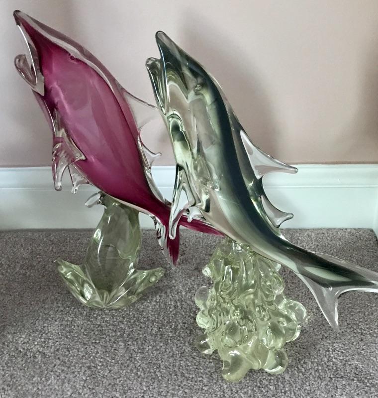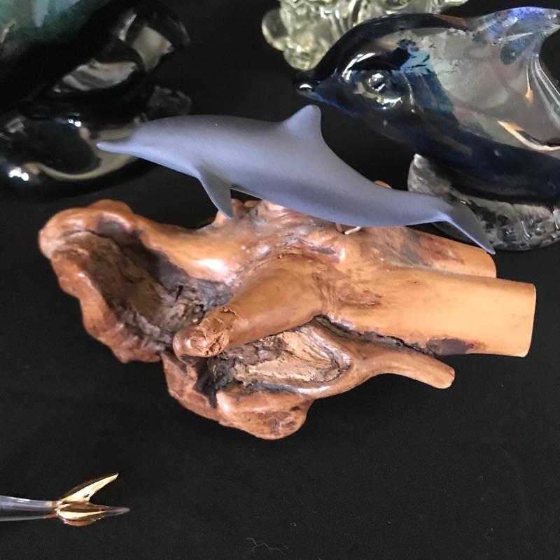 This playful lot includes eight dolphin statues/figurines. Five are made of glass, one is ceramic, and two are made of an unknown composite. No signatures that we could find. Tallest glass piece stands approx. 13.5” tall. See pics. Shipping available.