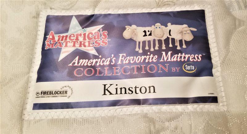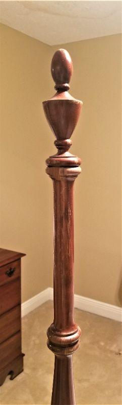 Nice vintage four poster - full/double - with clean and comfy Serta mattress set. Note: There are only two slats under the bed frame. 3 of the four posts come apart - one was glued a long time ago. Measures 56.75 inches wide, 65" tall, 82" long, and is 27" off the floor.