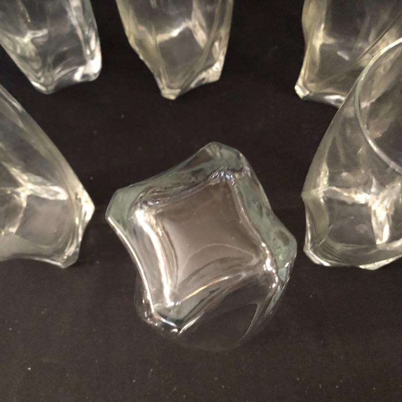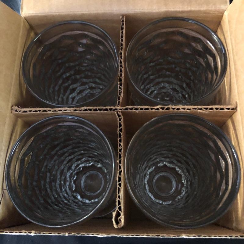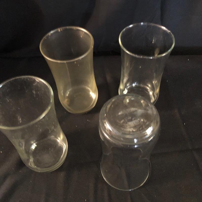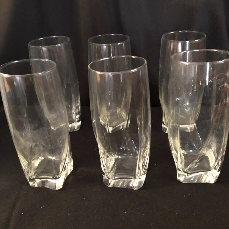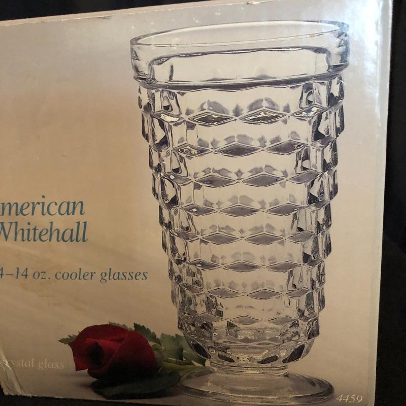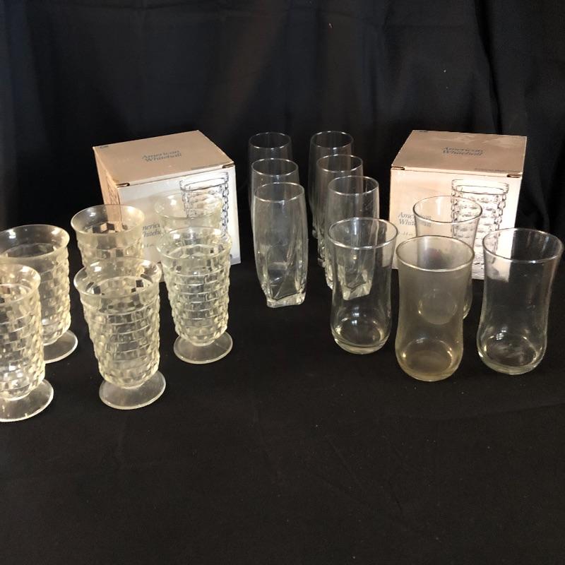 This lot contains two boxes of new American Whitehall 14 oz glasses for a total of eight glasses and six other Whitehall glasses for a total of fourteen glasses. It additionally has four glasses that flair at the top and six square based glasses. Local pick up only.