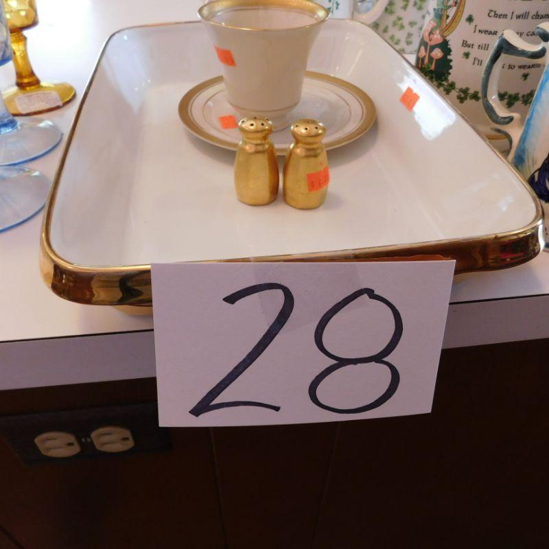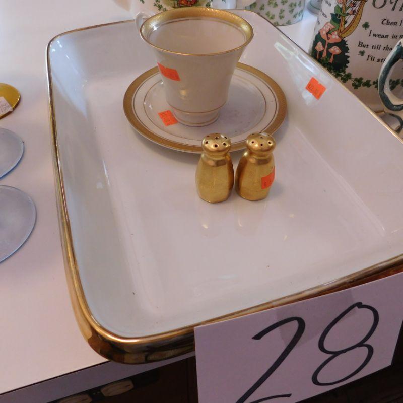 lot 28 golden white casserole dish gold salt and pepper shaker golden white tea cup and saucer