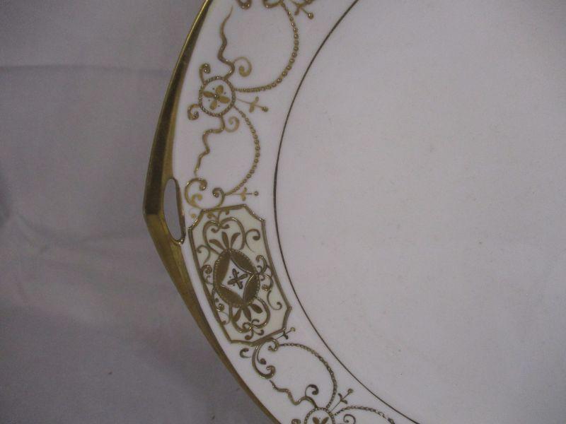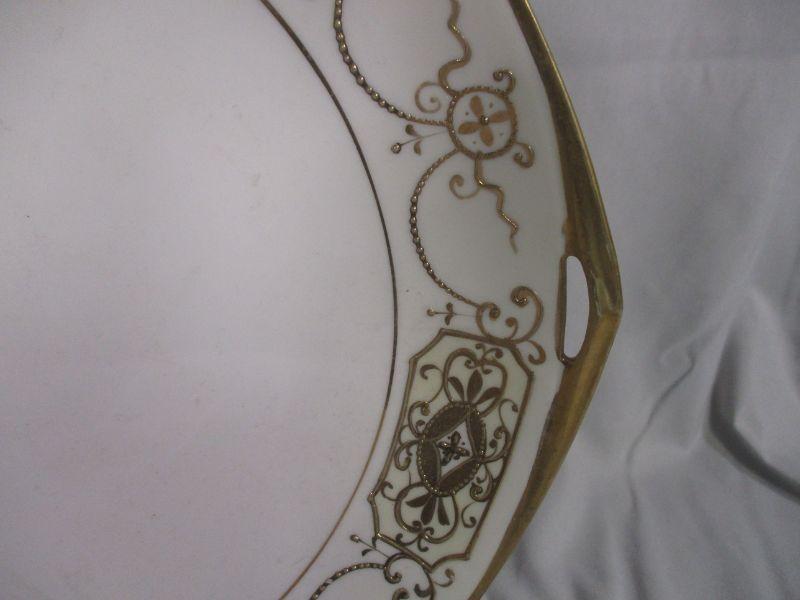 One of my favorite pieces because the embellishing is regal but not overdone. The only issues are tiny spots of gold trim wear at the handles - very insignificant. It is about 11" from handle to handle.